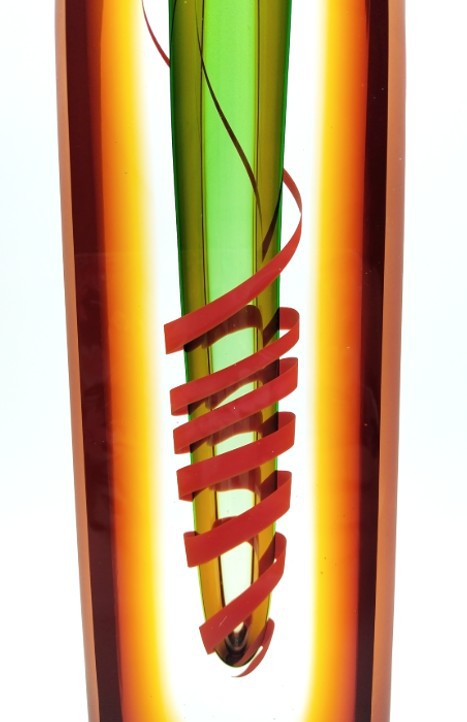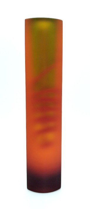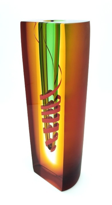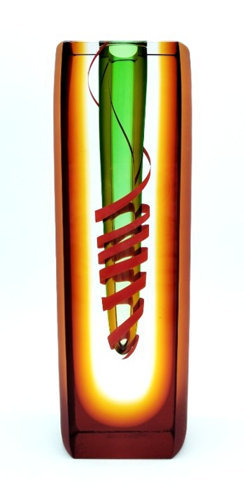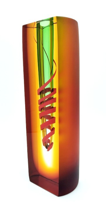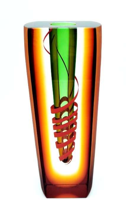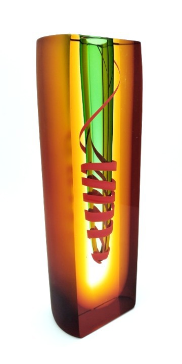 Add a dramatic splash of colour to your decor with this contemporary art glass vase, bringing together an alluring mix of warm amber tones and refreshing green.