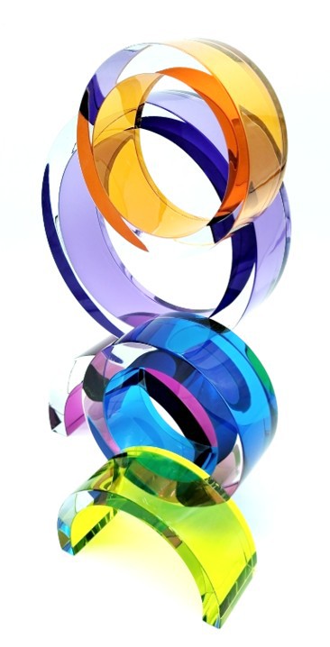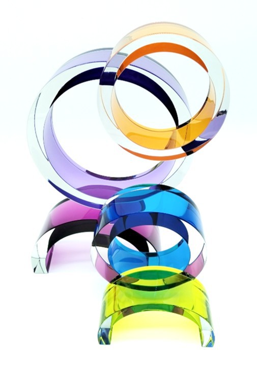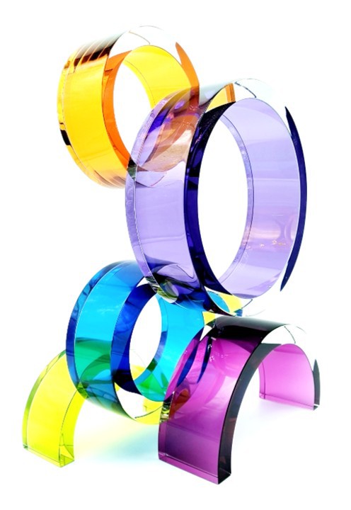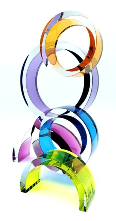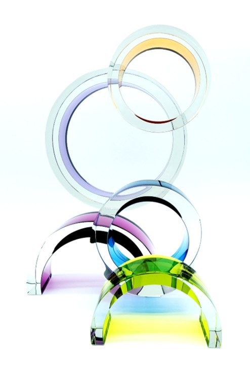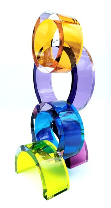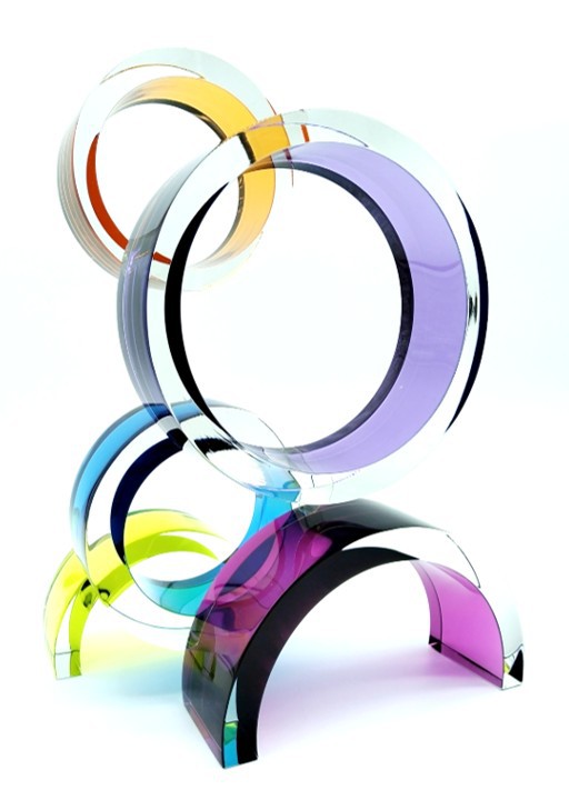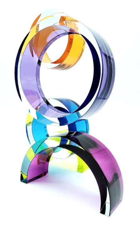 A playful mix of circles and semi-circles combine in this striking contemporary glass sculpture.