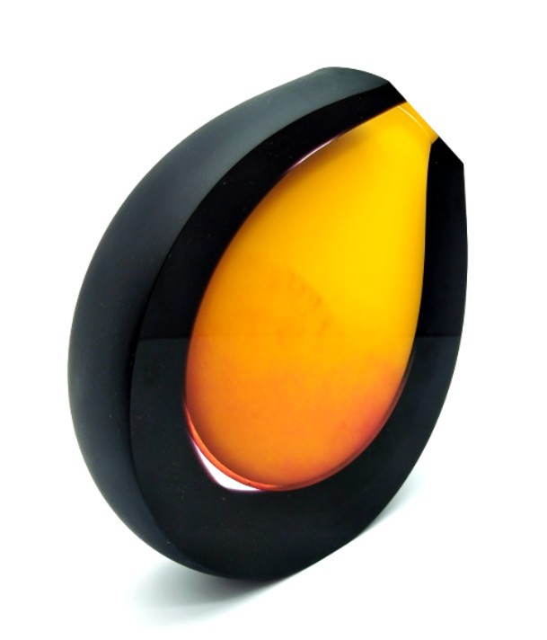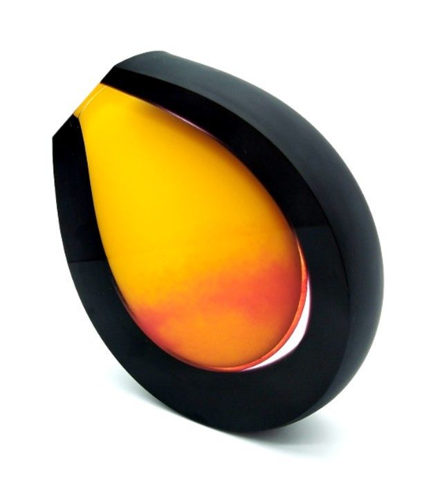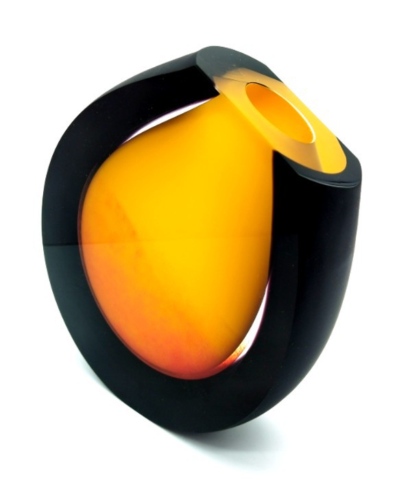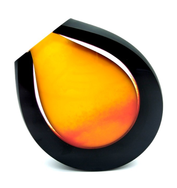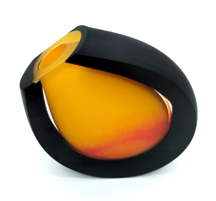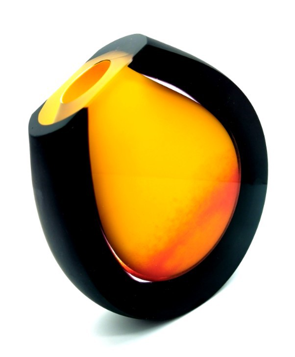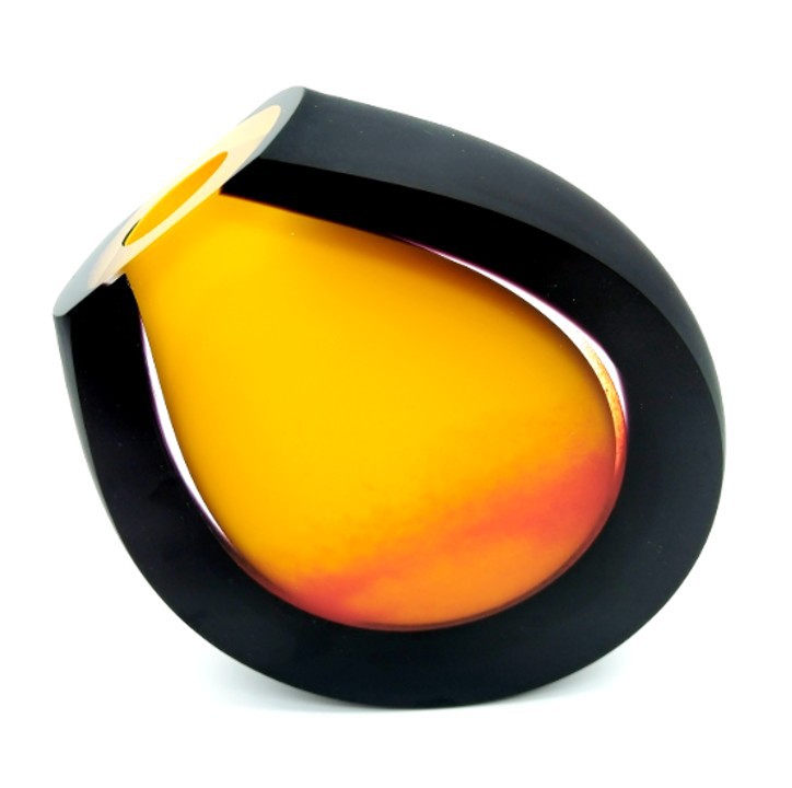 The dramatic black exterior of this tilted art glass vase makes a striking frame for the yellow & red interior. Complete with a satin sheen finish.