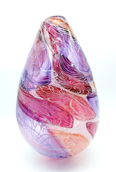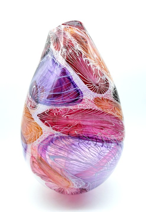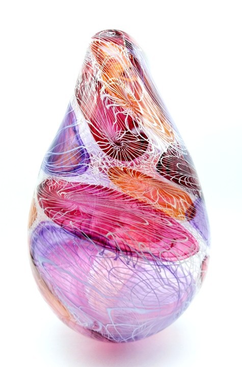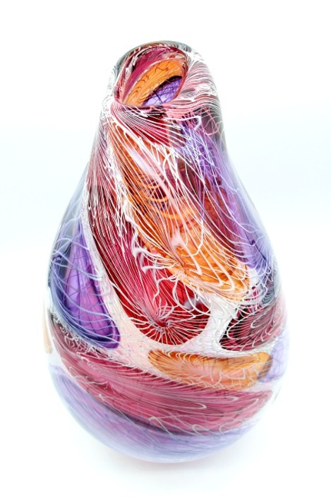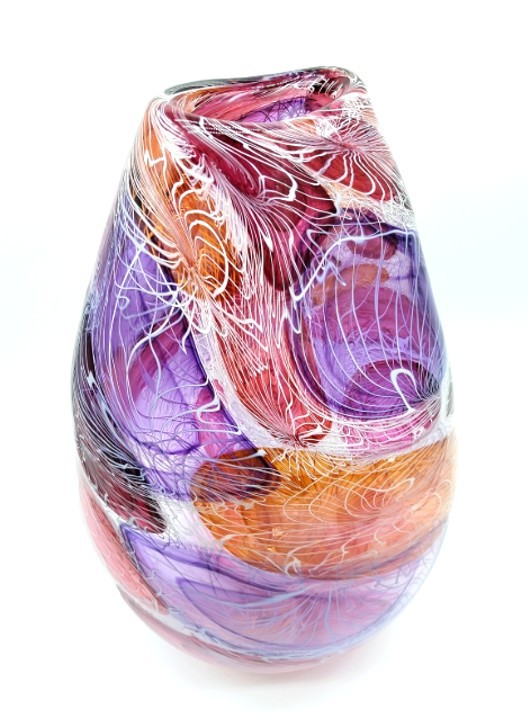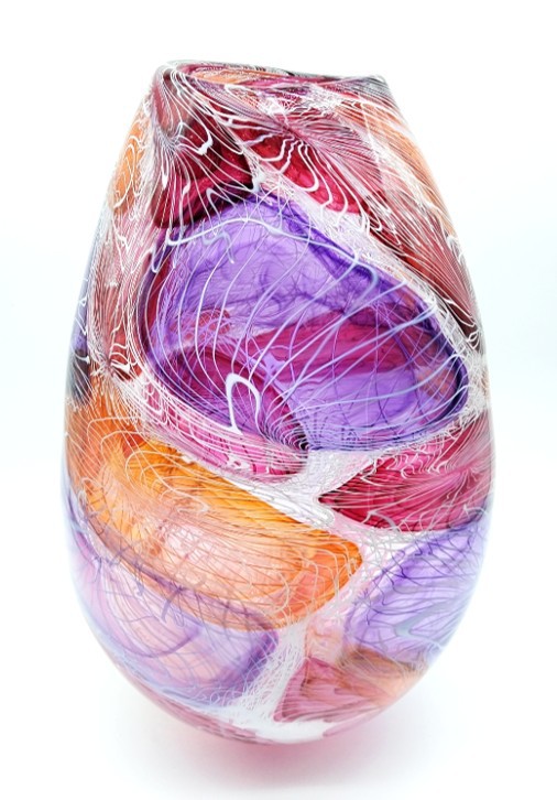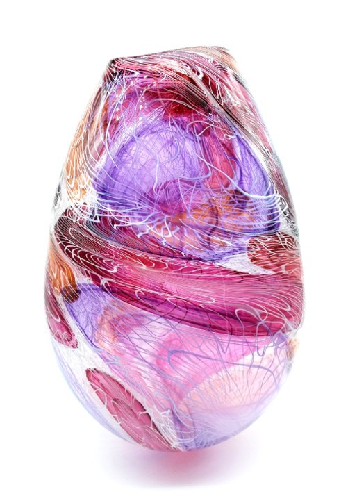 During the process of blowing the pattern becomes stretched and distorted and the ‘pebbles’ merge into one another, resulting in a striking one-off piece.