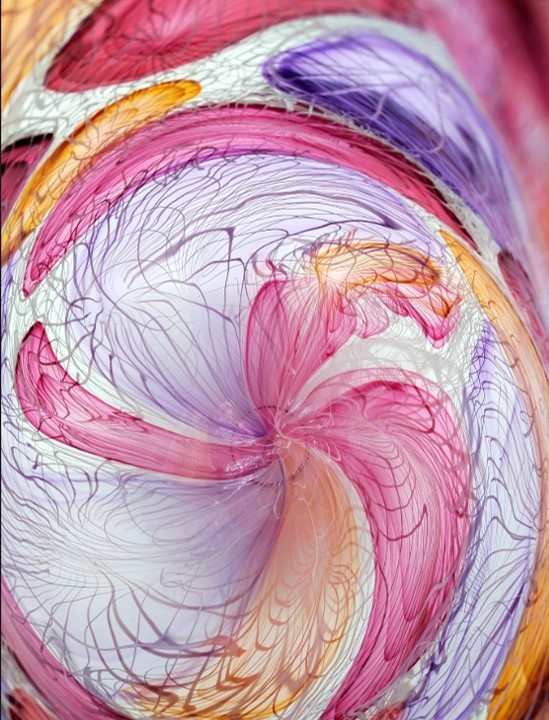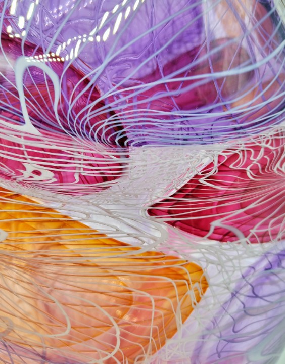 distorted grid of trailed lines which are picked up as a hot glass bubble is rolled over them.