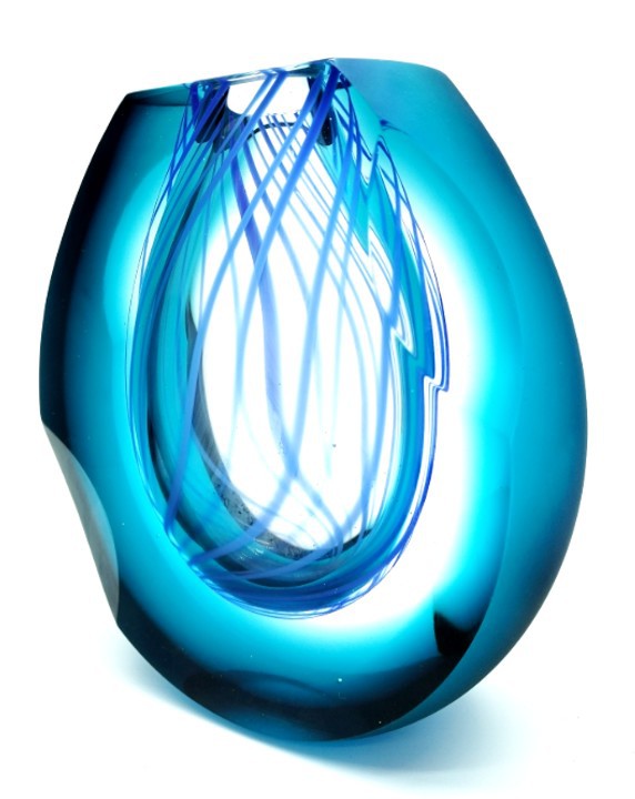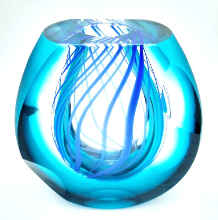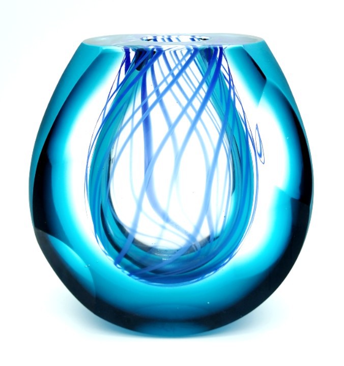 Continuous threads of blue form the centre of this contemporary art glass vase, framed in turquoise and complete with facet cuts.