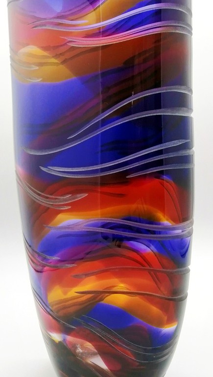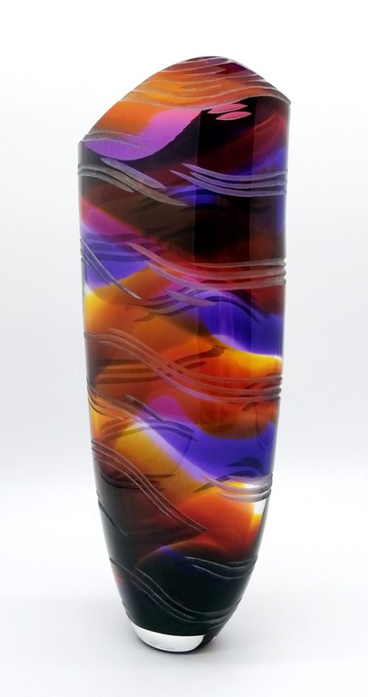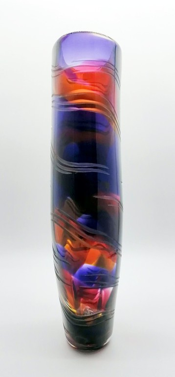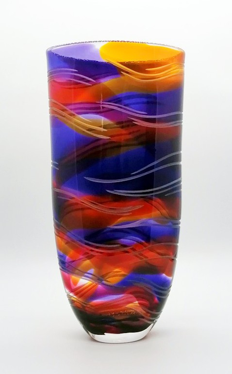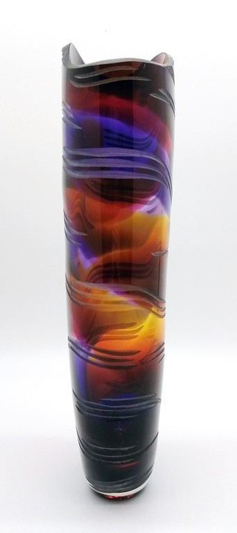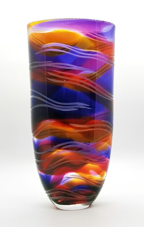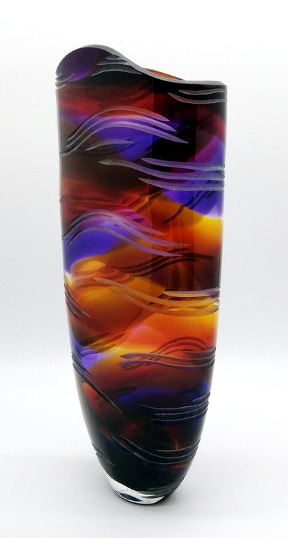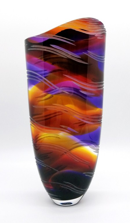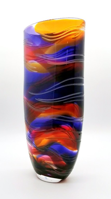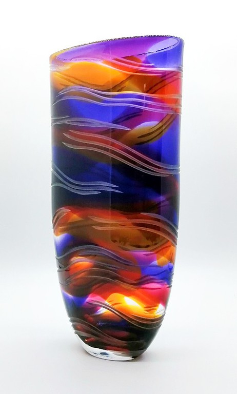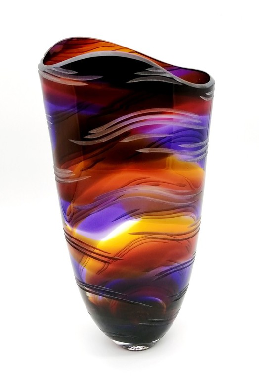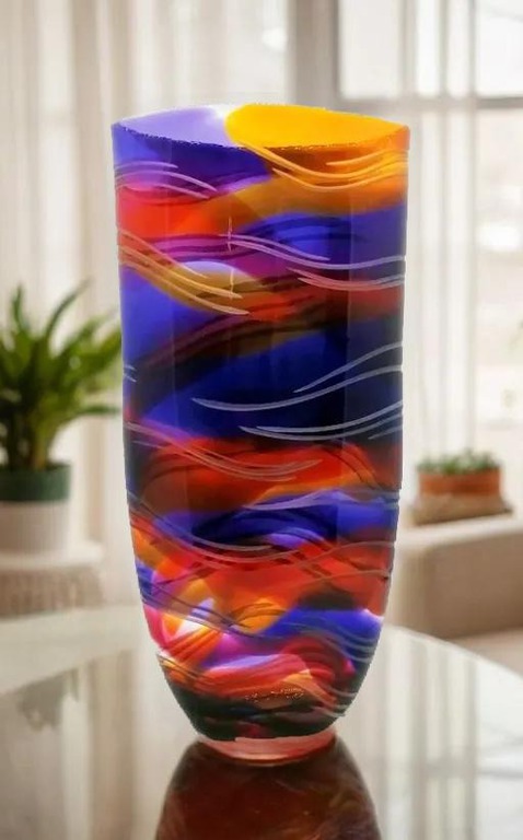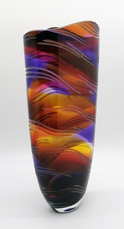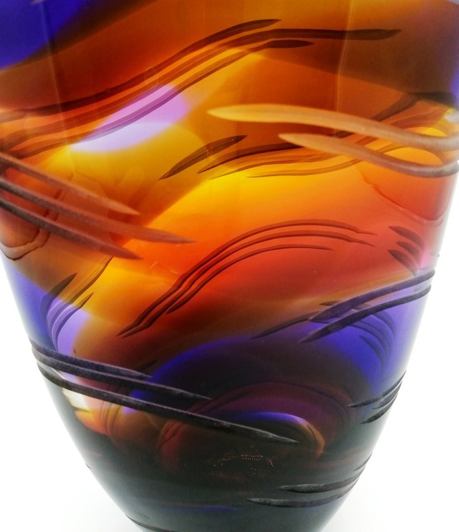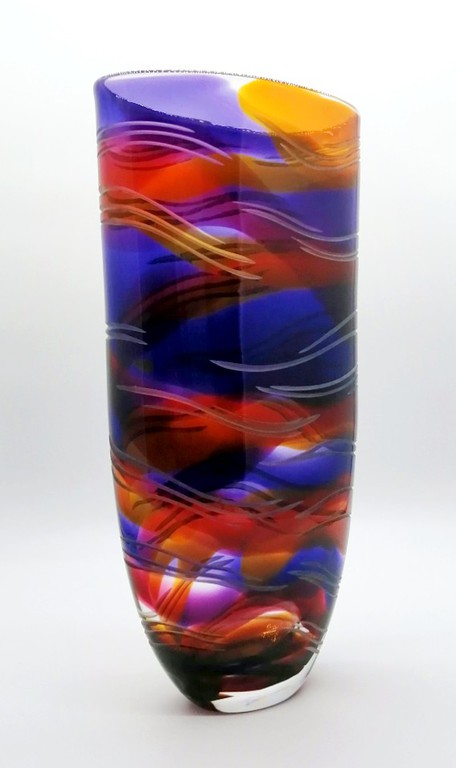 A one off statement glass vase in striking shades of orange, red and purple with multiple facet cuts.