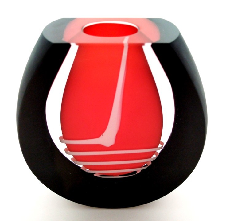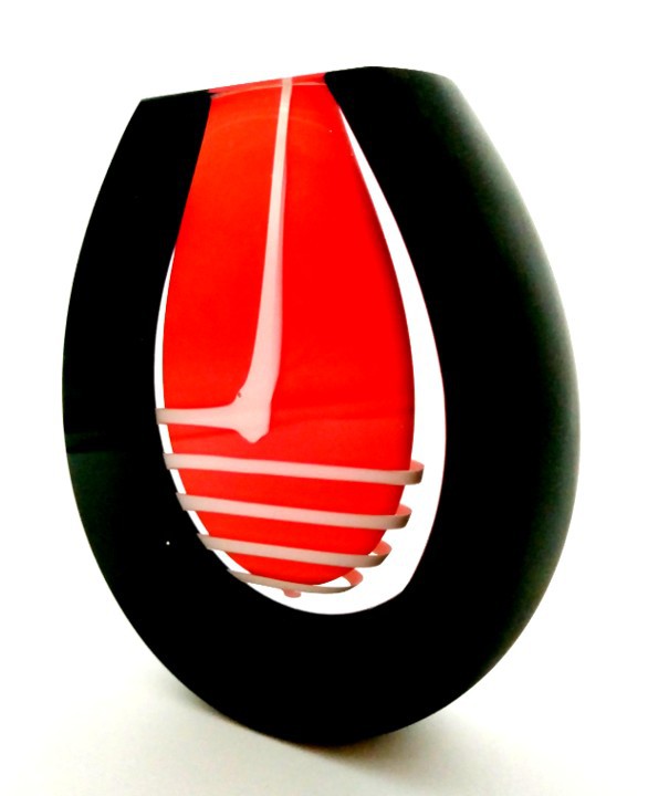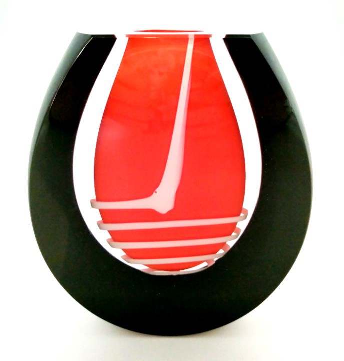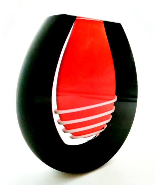 A twirl of white dances around the central red drop in this art glass vase, framed in dramatic black.