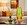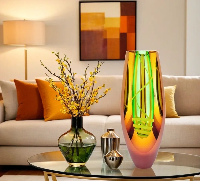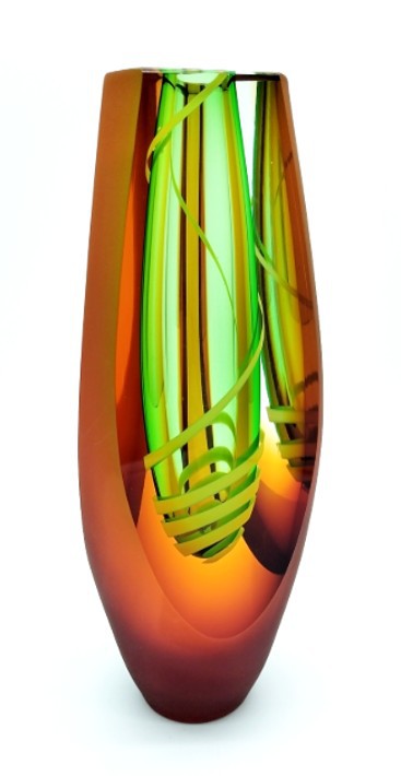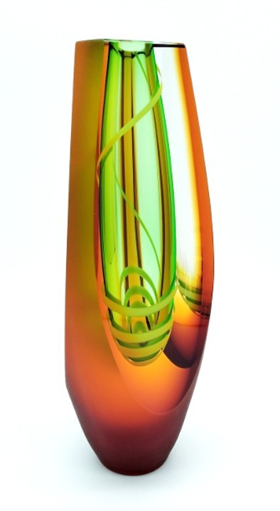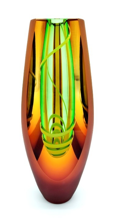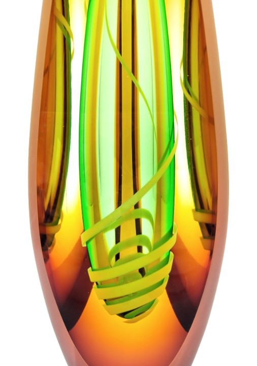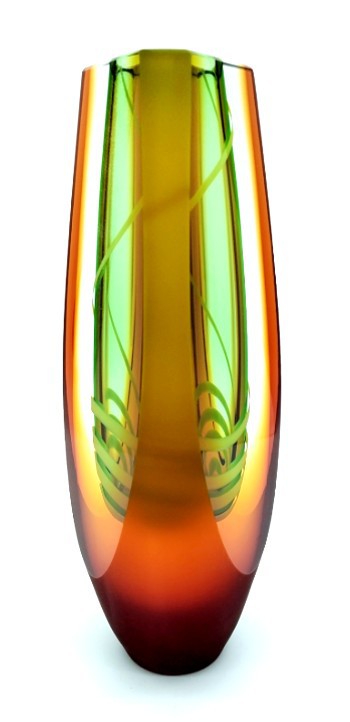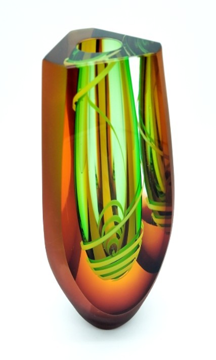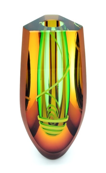 A yellow ribbon of glass playfully dances round the central green drop in this triangular shaped art glass vase. Finished in warm amber.