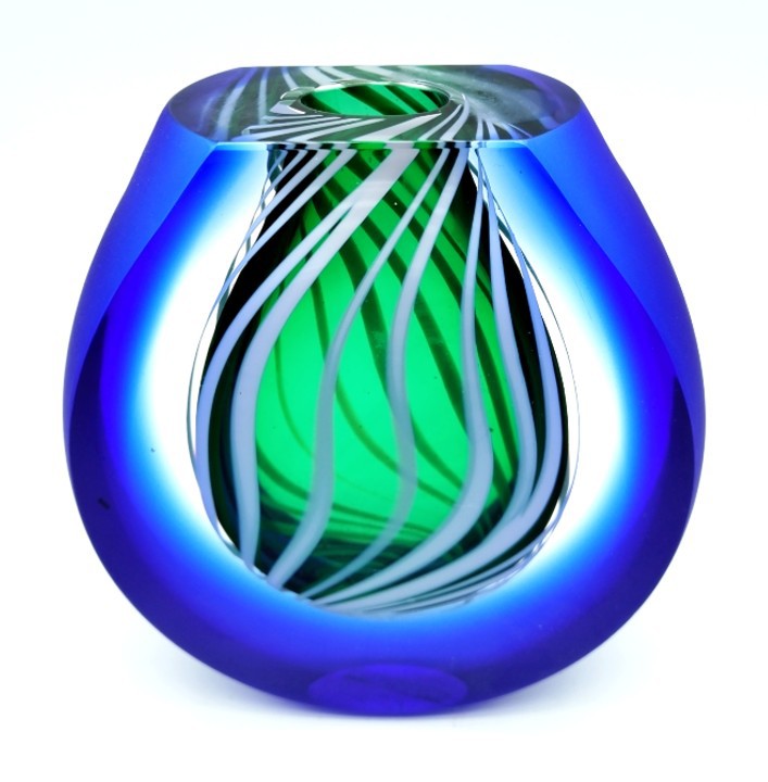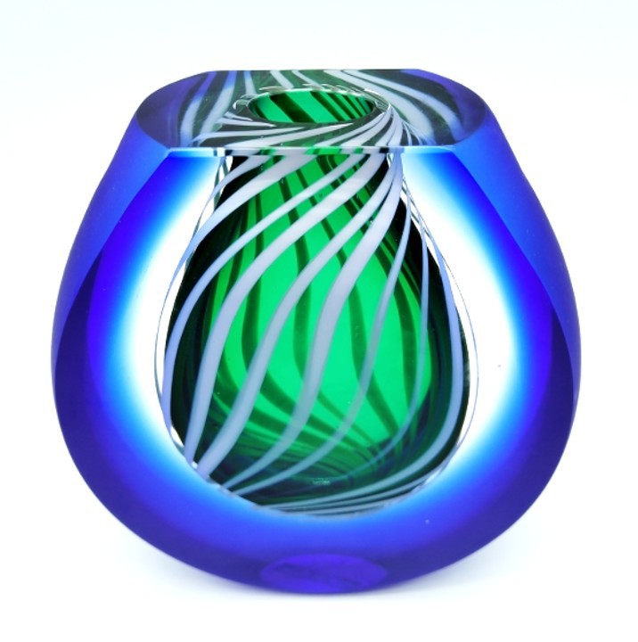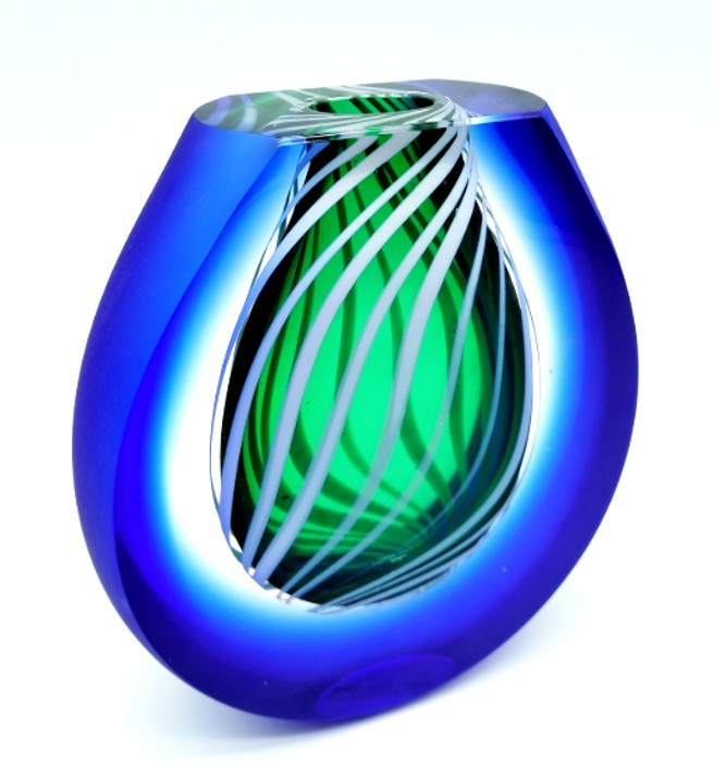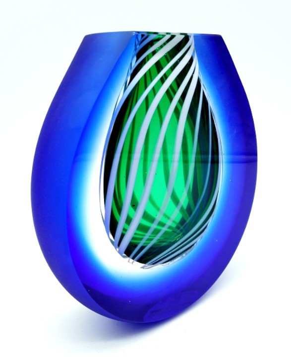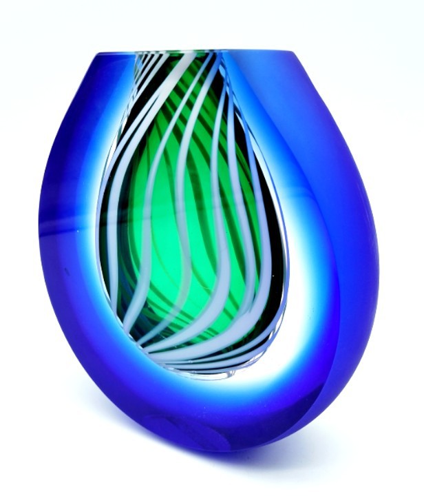 Blue & green should certainly be seen together and make for a timeless look in this contemporary art glass vase.