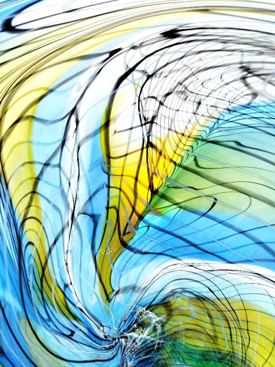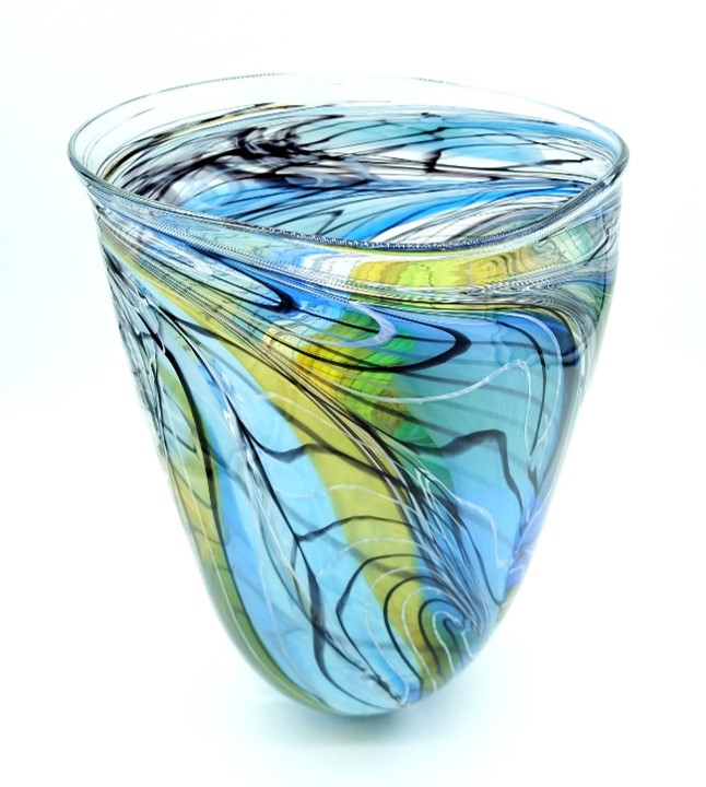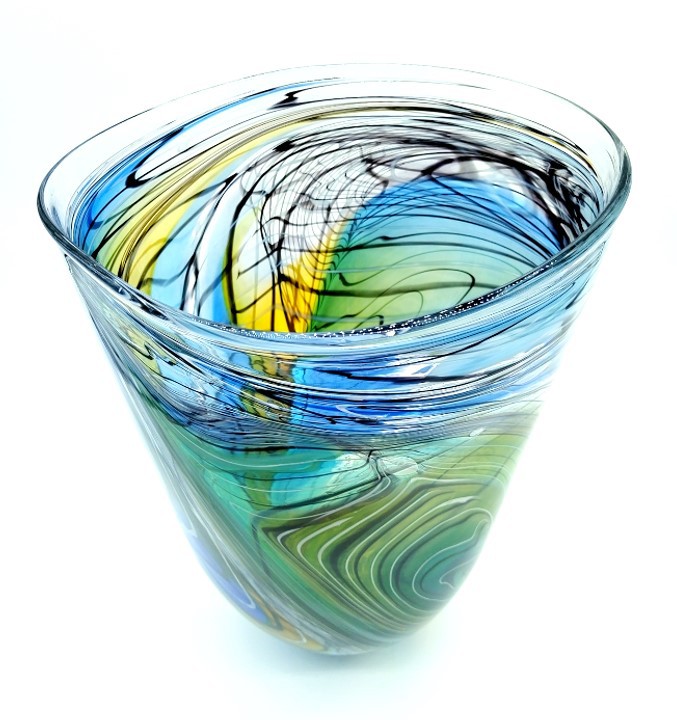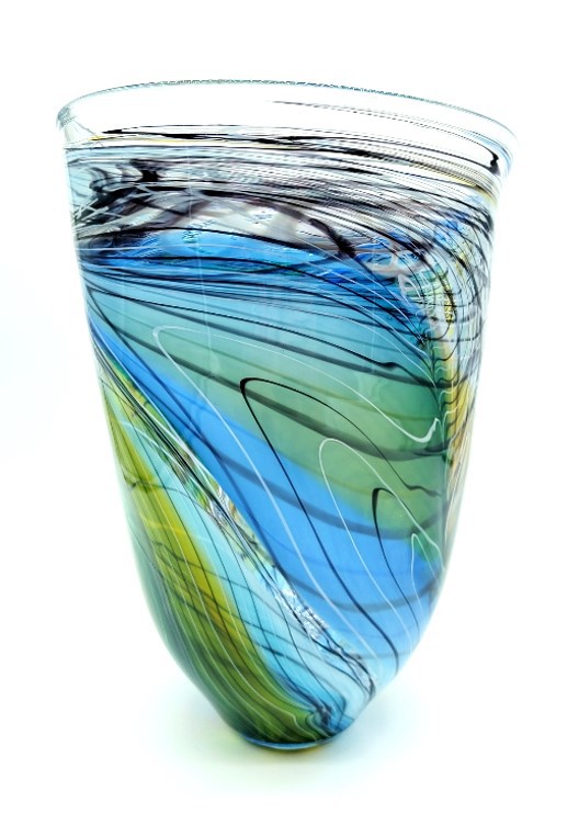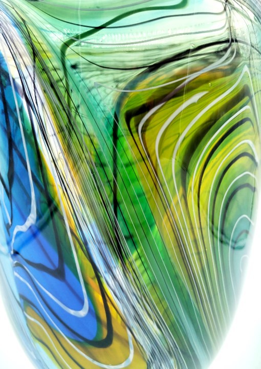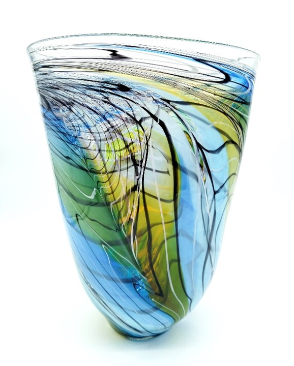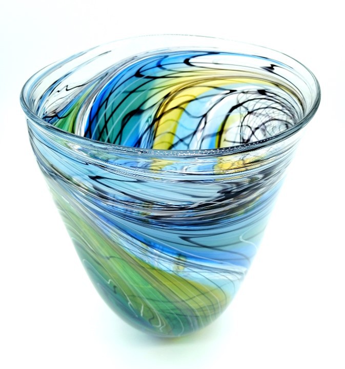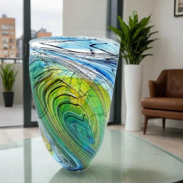 Make a statement with this elegant art glass vase, decorated with a trailed feather-like design in shades of Green, Blue & Gold.