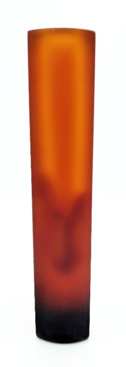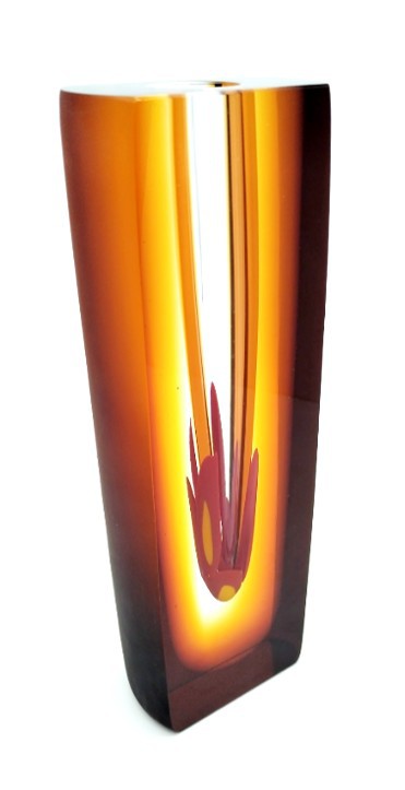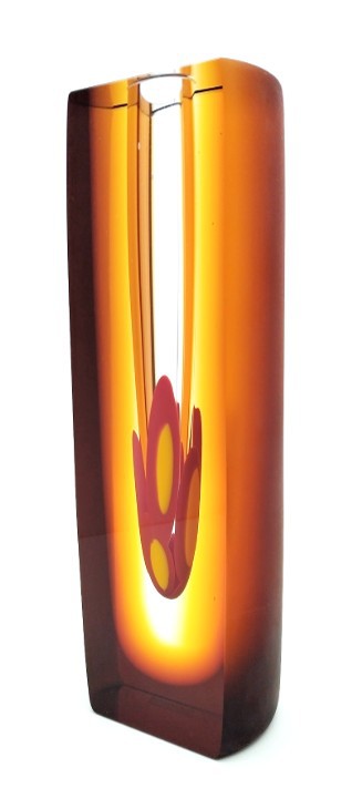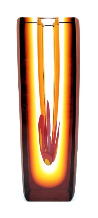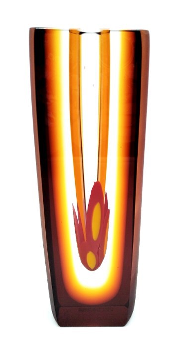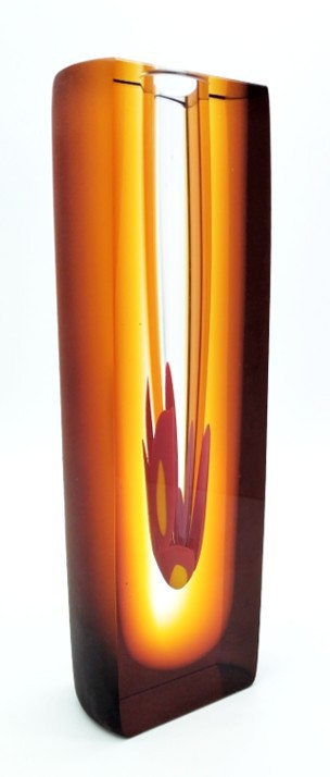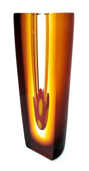 A feverish array of coloured spots decorate this art glass vase, with rich amber to the sides then cut and polished.