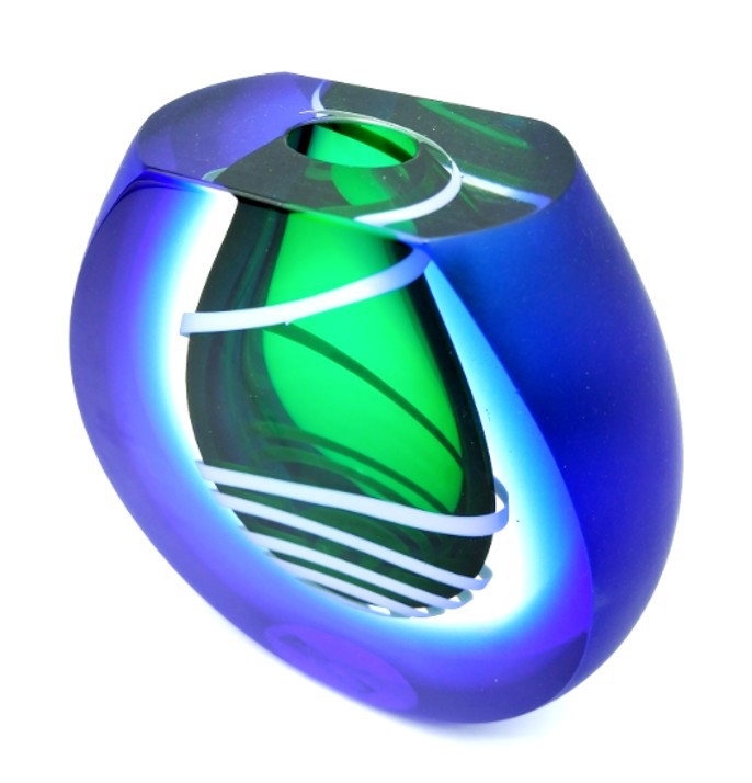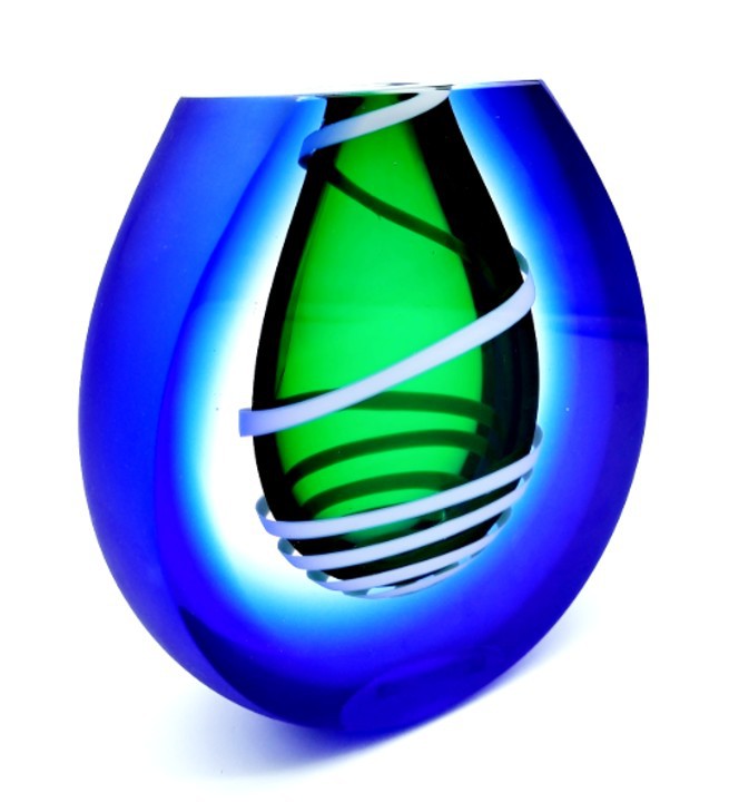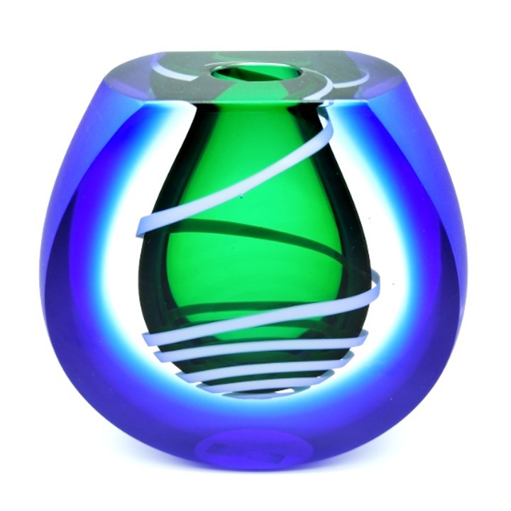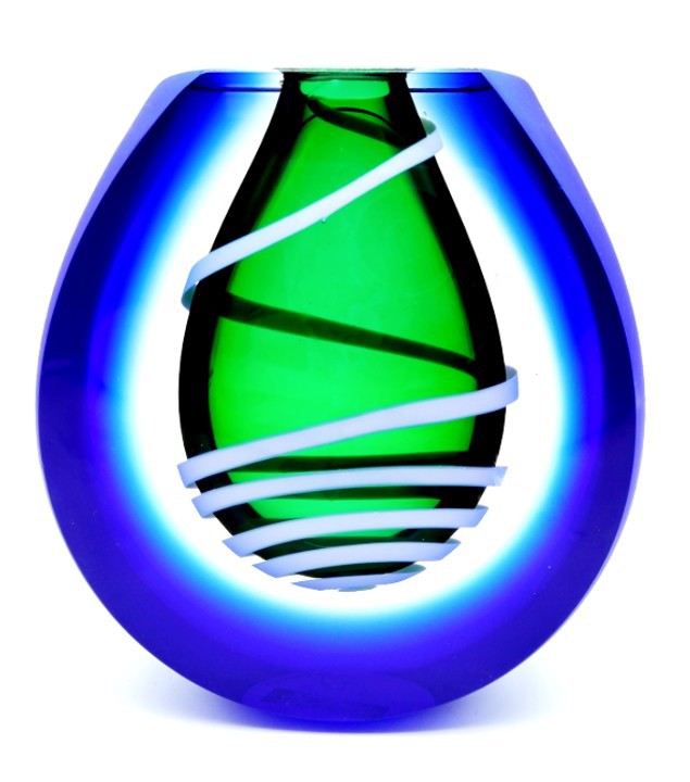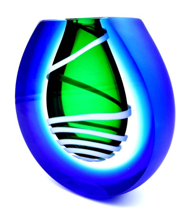 Blue & green should certainly be seen together and make for a timeless look in this contemporary art glass vase.