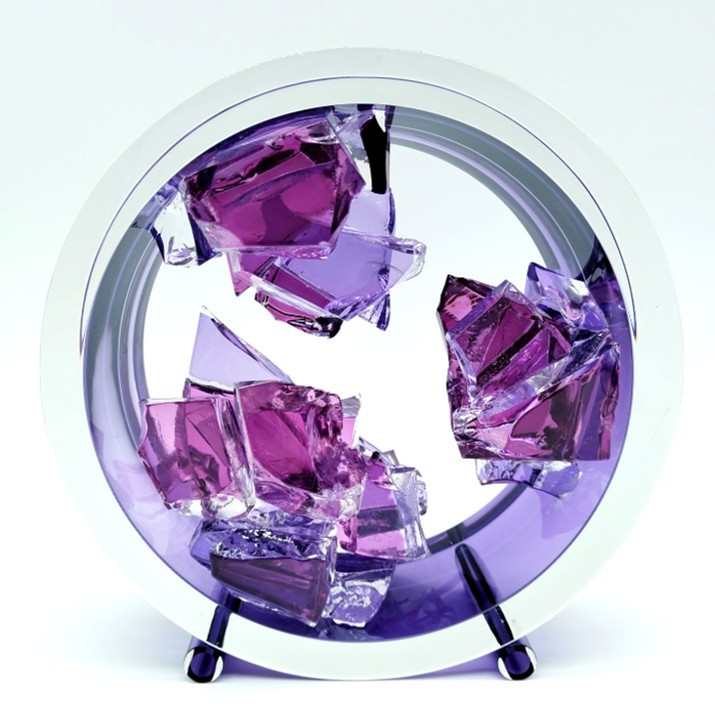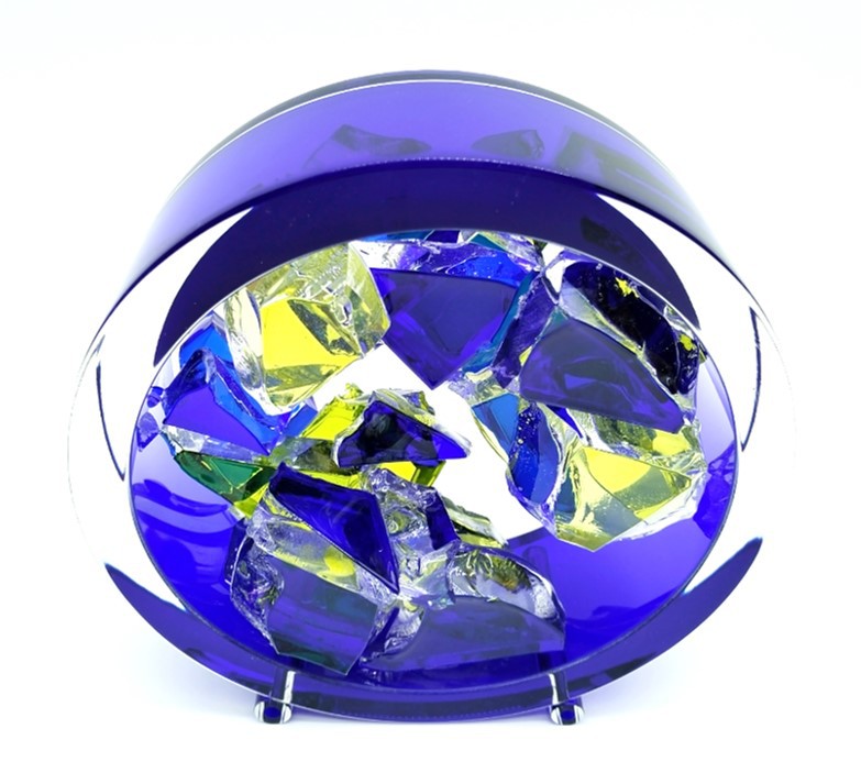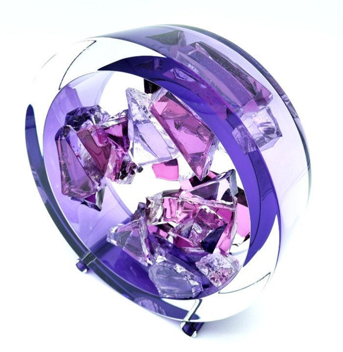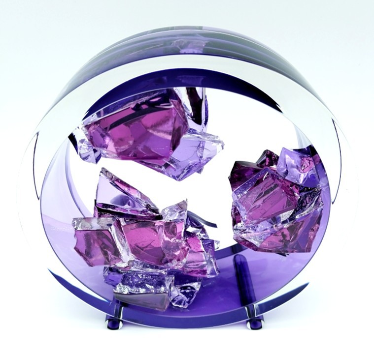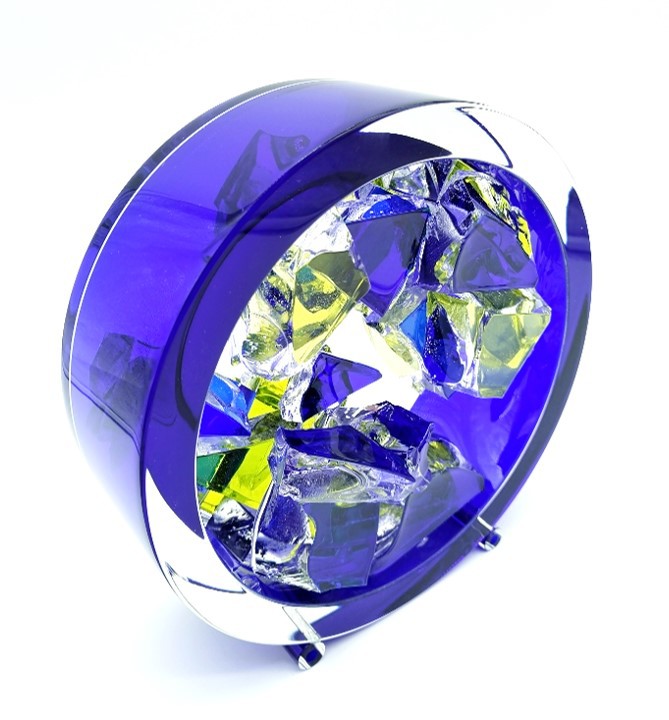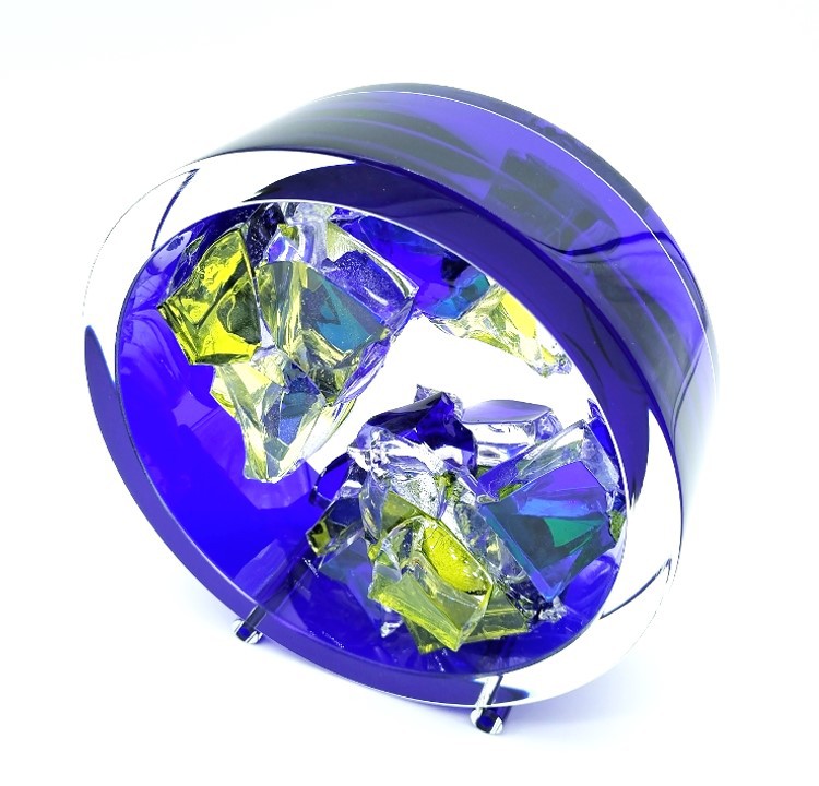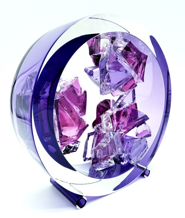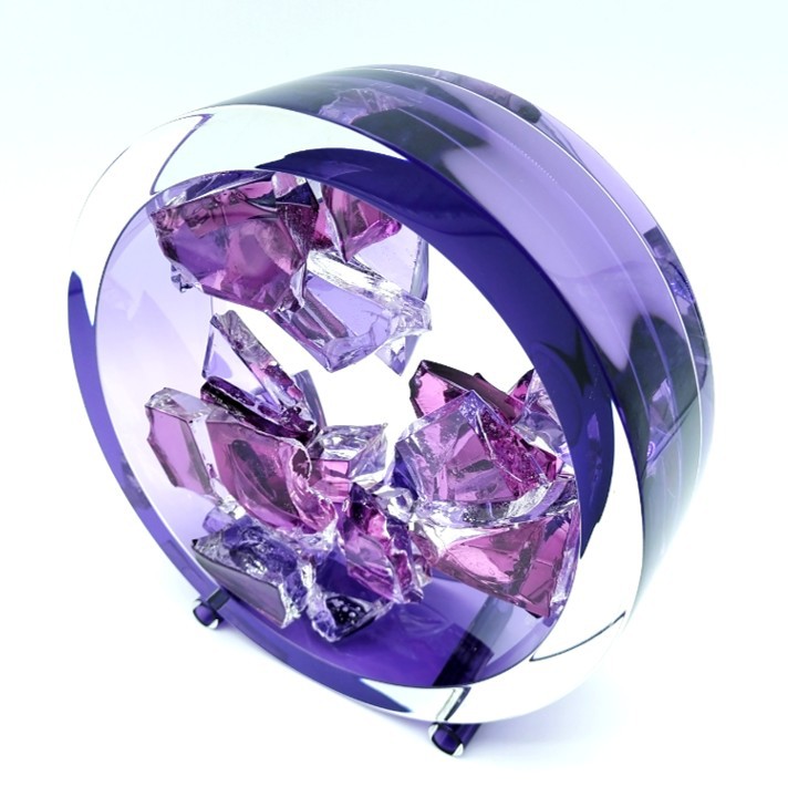 An inner lining of crystals are dramatically framed by a perfect circular form in this beautiful art glass sculpture.