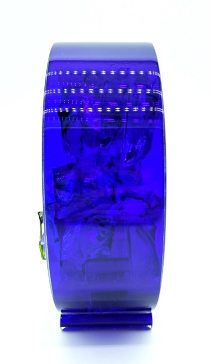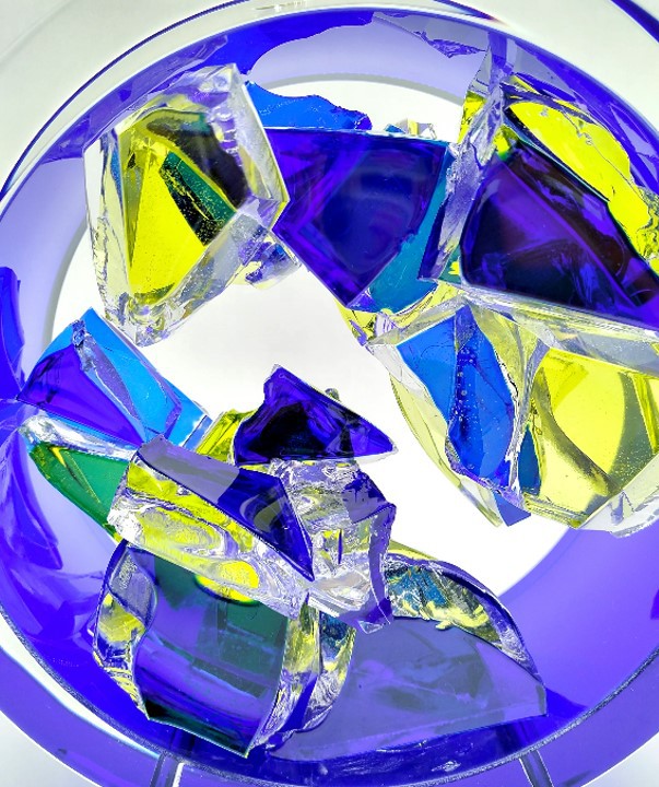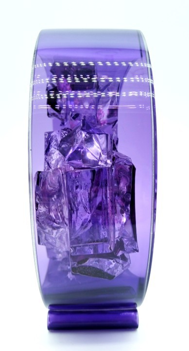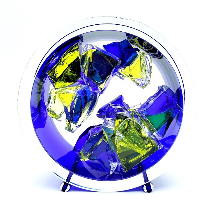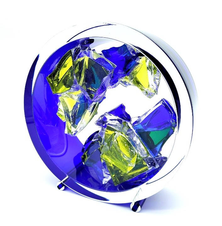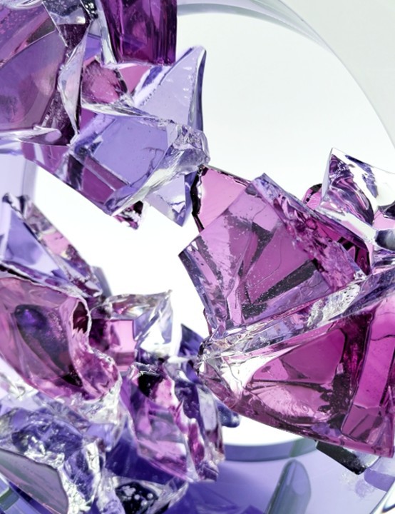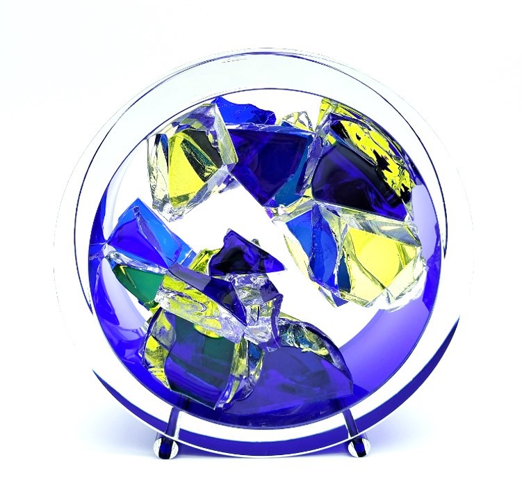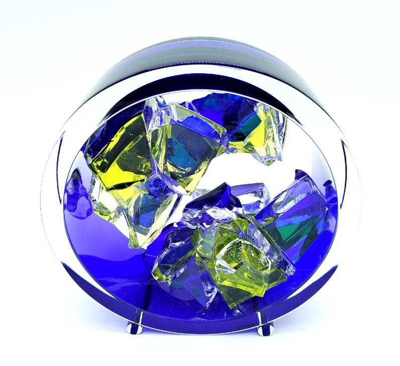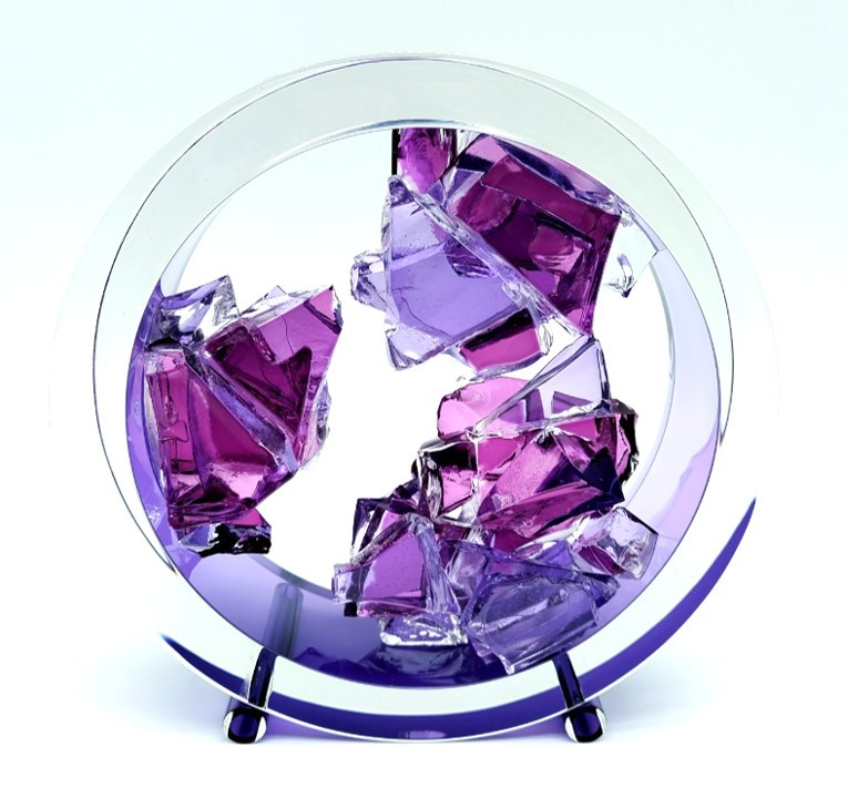 An inner lining of crystals are dramatically framed by a perfect circular form in this beautiful art glass sculpture.