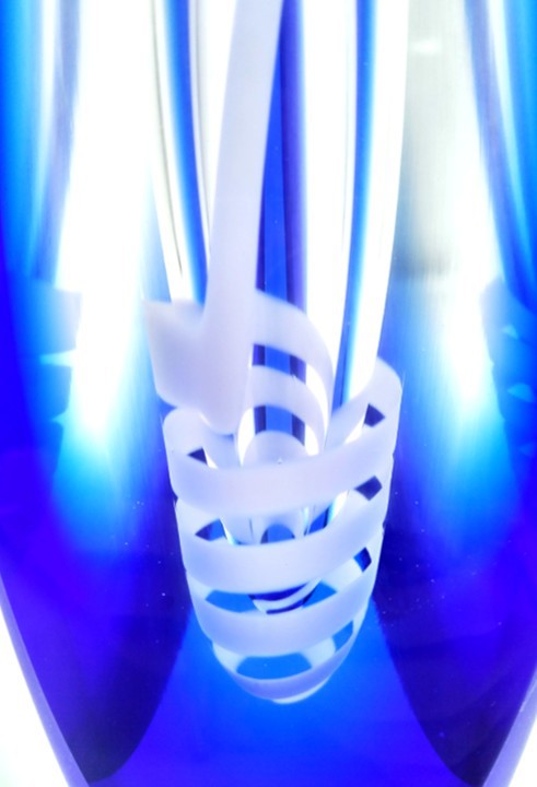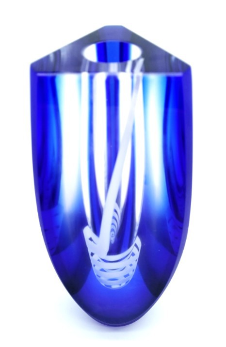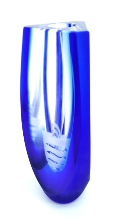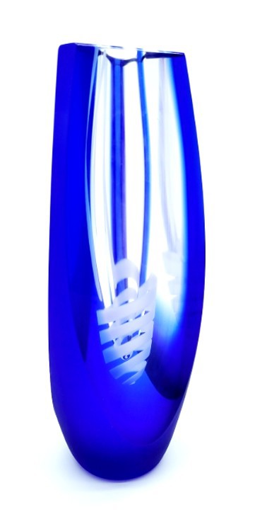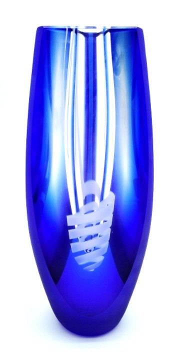 Crisp white gracefully twirls round the central drop in this shaped contemporary art glass vase, framed in cobalt blue and finished with a satin sheen to the sides.