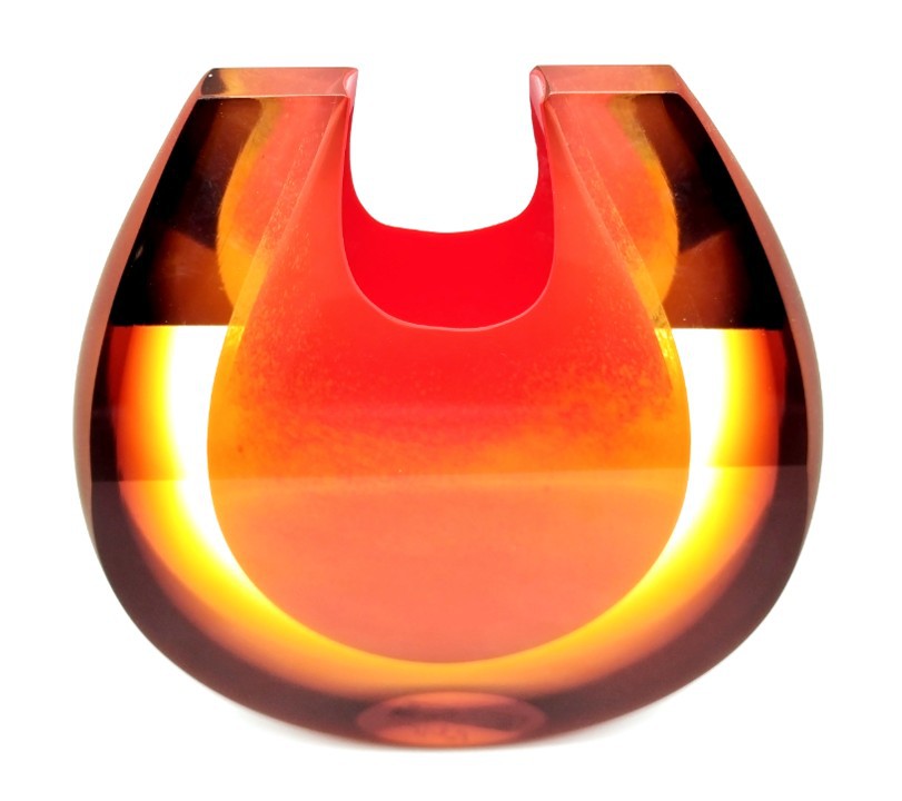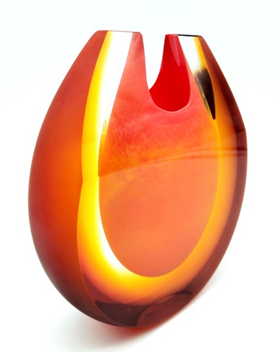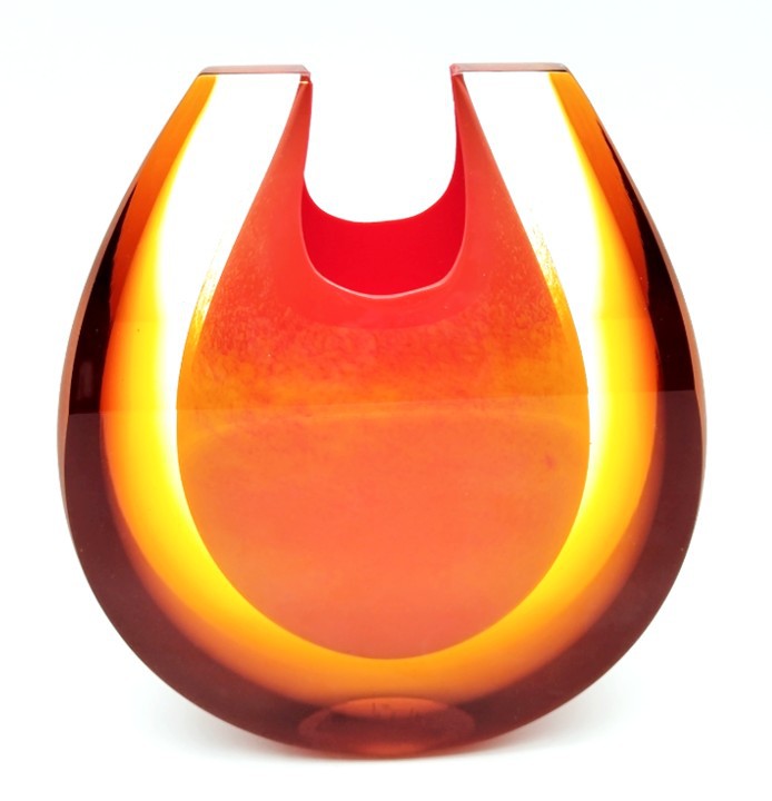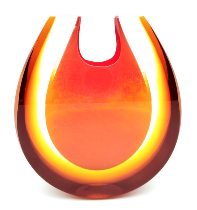 Add an inferno of warmth to your decor with this striking art glass vase. Finished with a facet cut to the top and satin sheen to the sides.