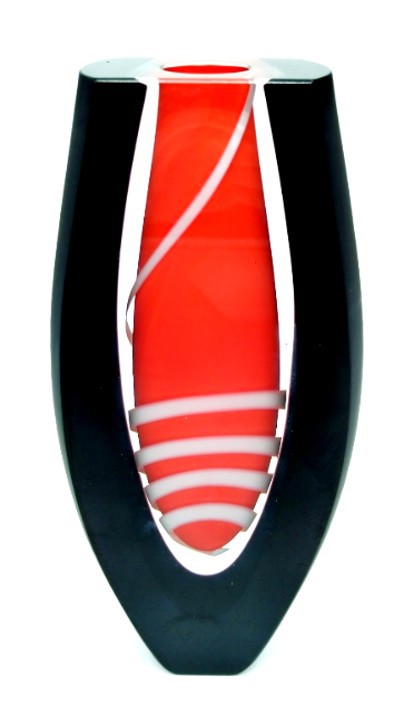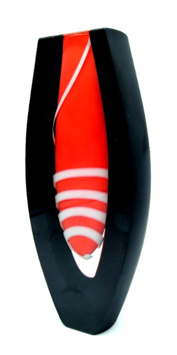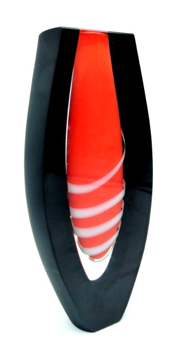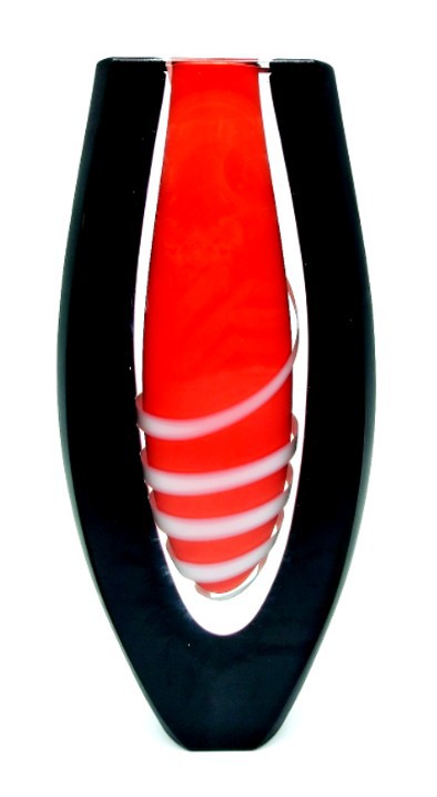 Crisp white twirls round the central red drop in this contemporary art glass vase, framed in a dramatic black.