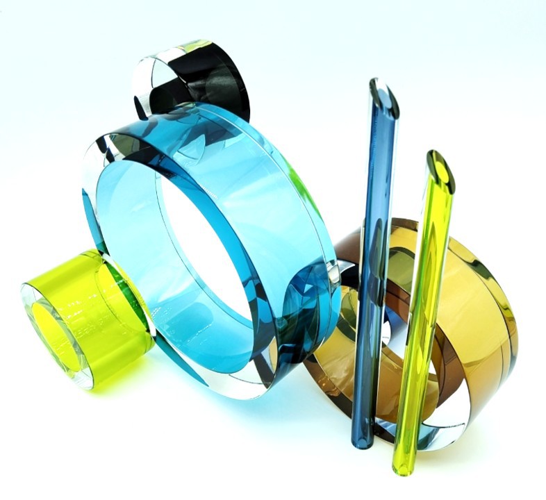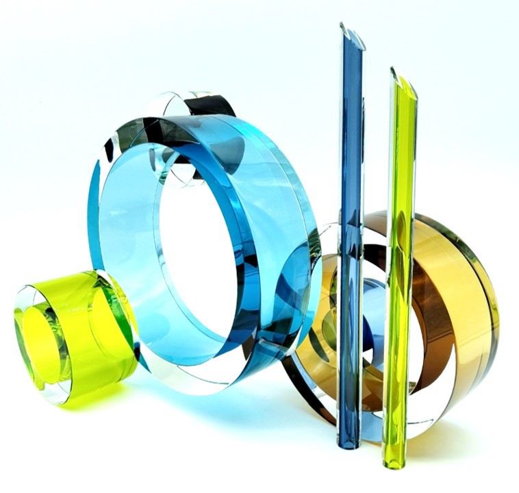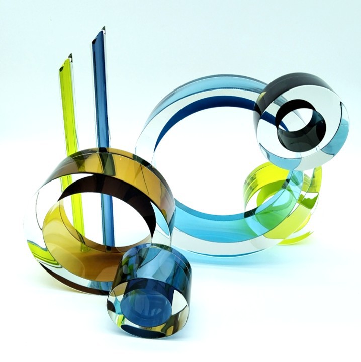 Sophisticated yet playful, this stunning contemporary glass sculpture creates a beautiful juxtaposition between the clean lines and circular forms.