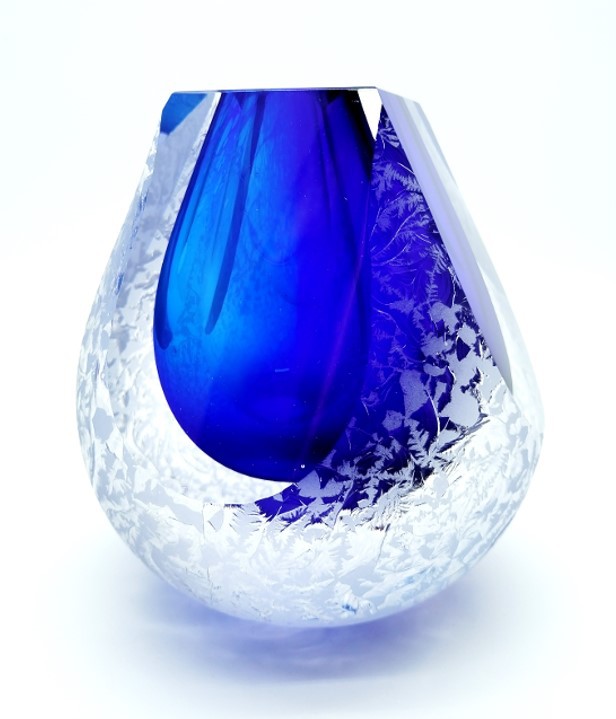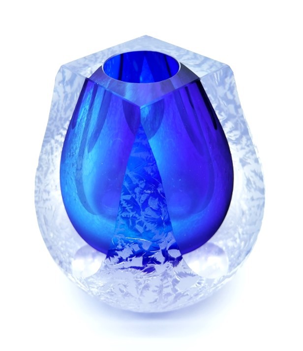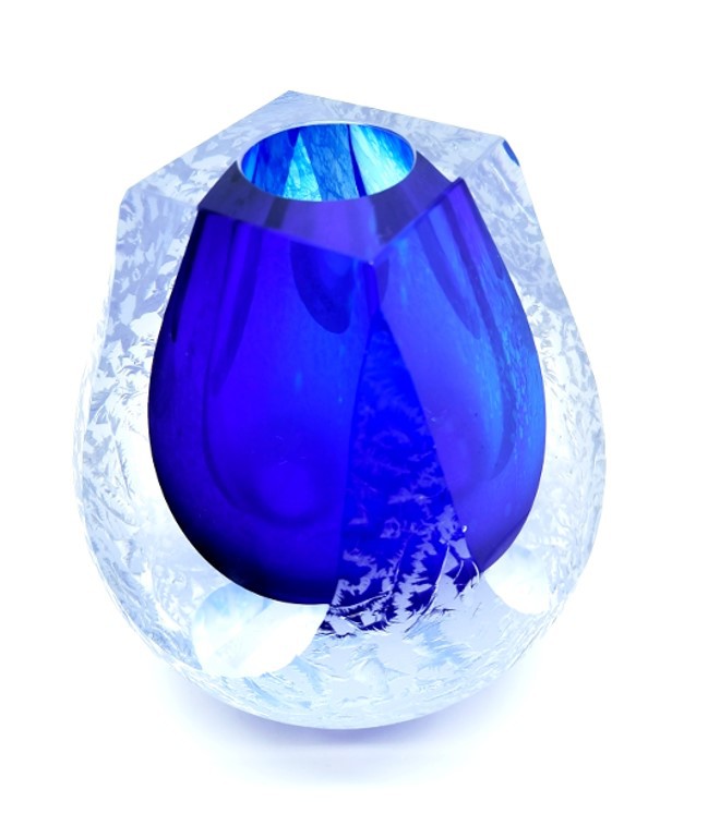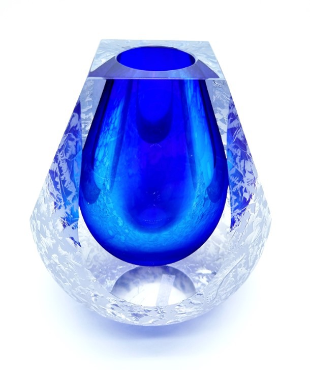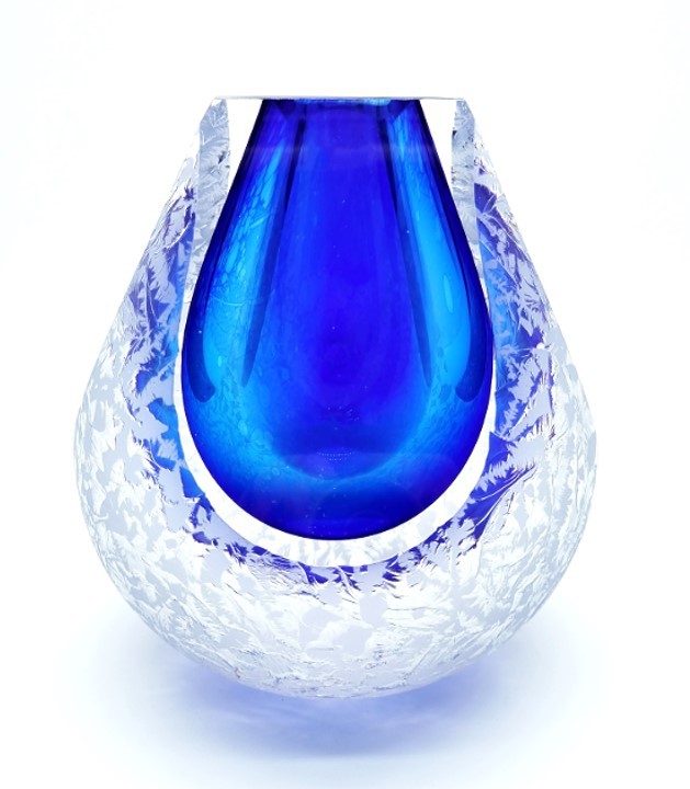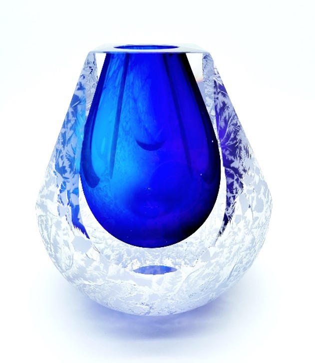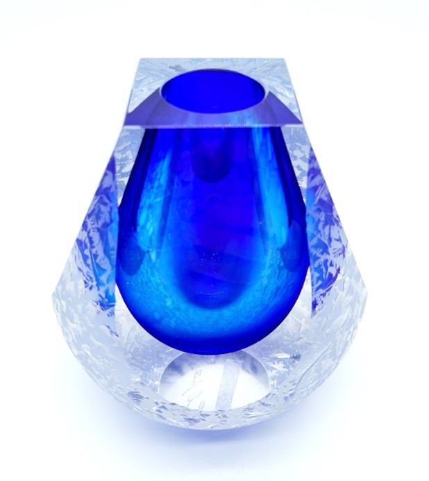 Dive right in to the rich pool of blue in this shaped art glass vase, finished with a pretty acid ethed design to the sides.