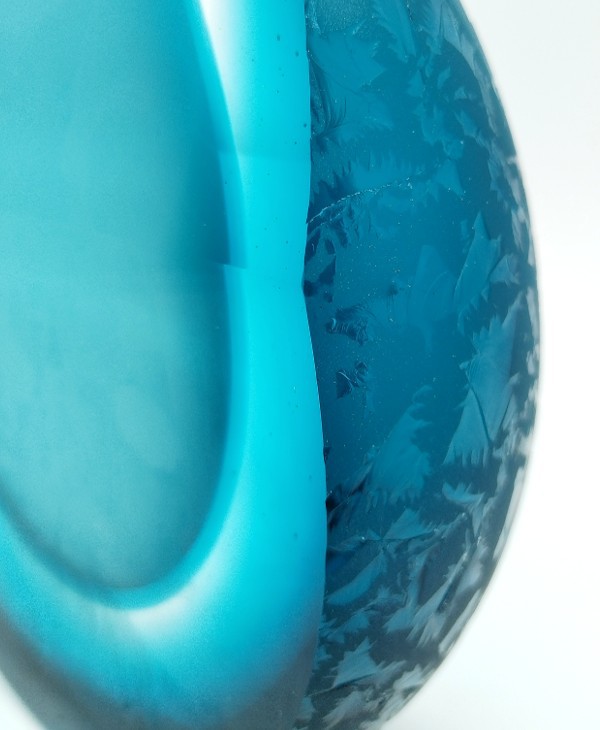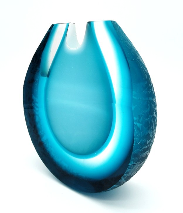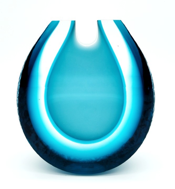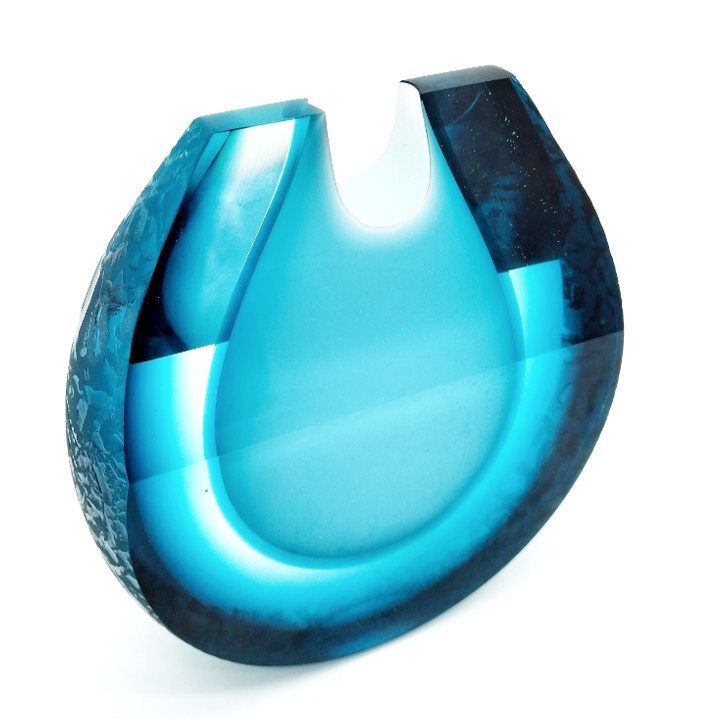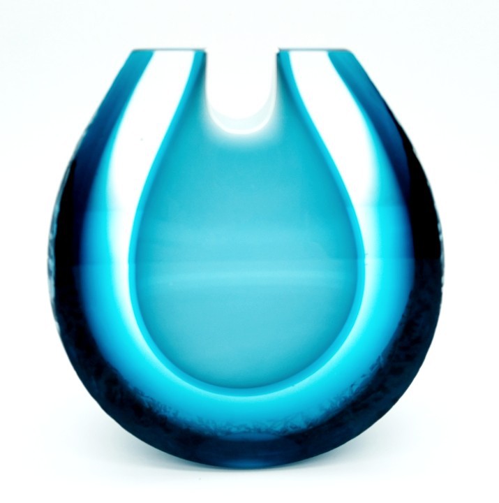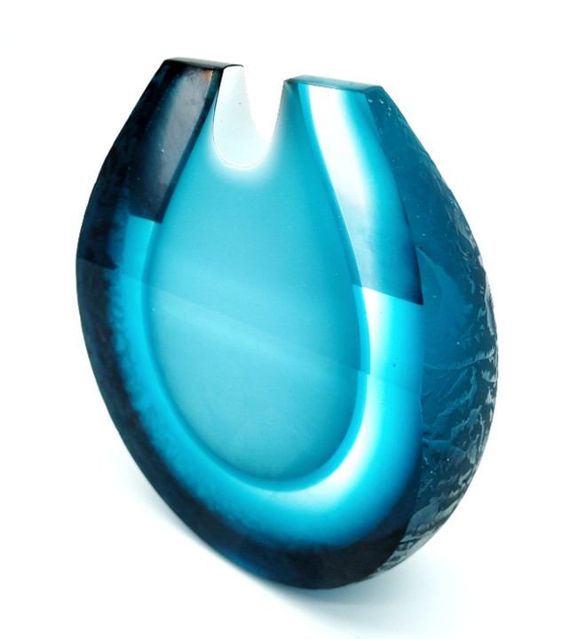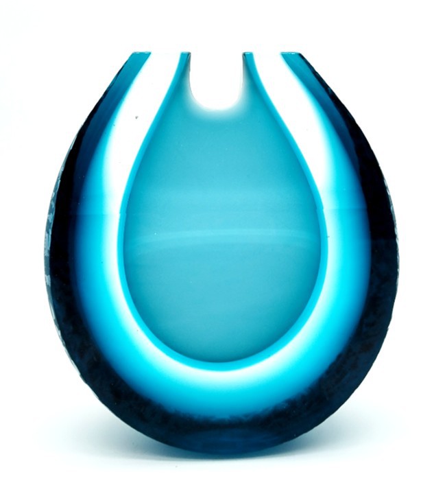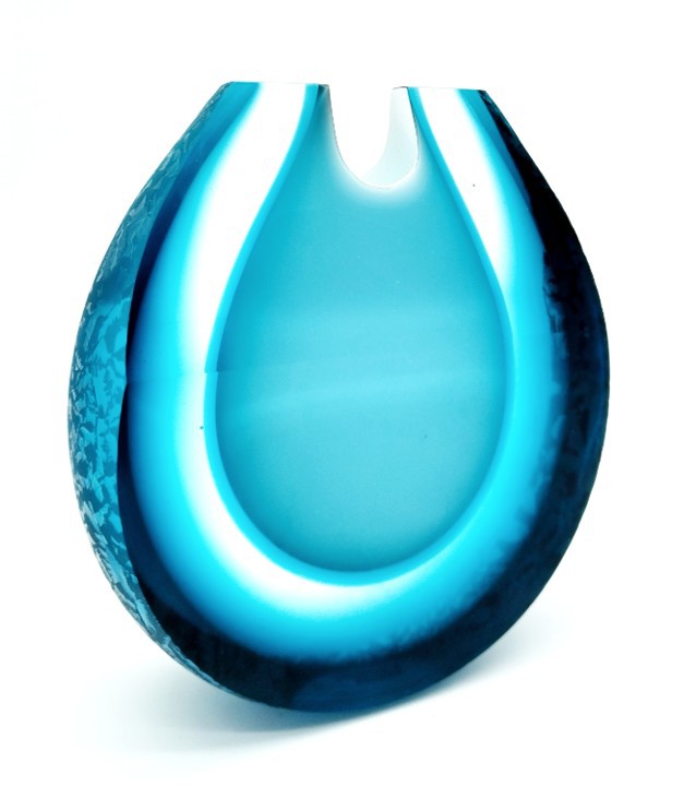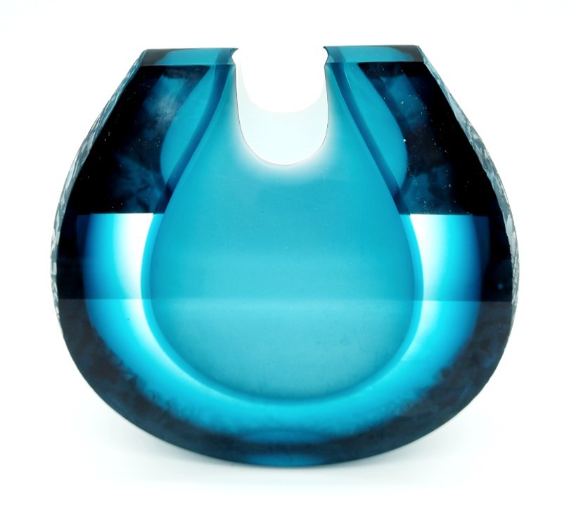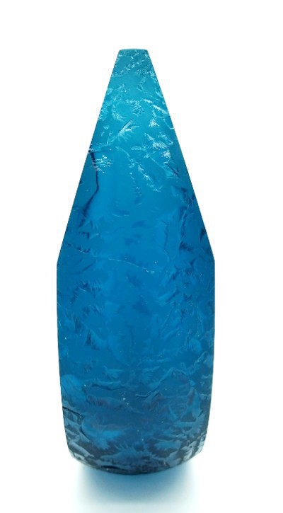 Terrific turquoise is celebrated in this striking art glass vase, with facet cut to the top and a pretty acid etched design to the sides.