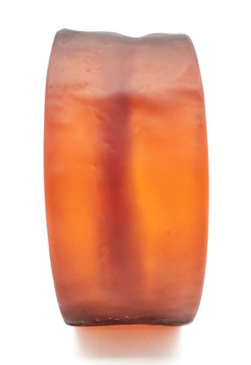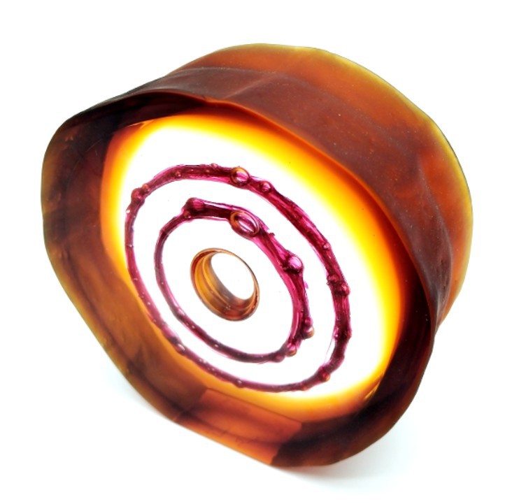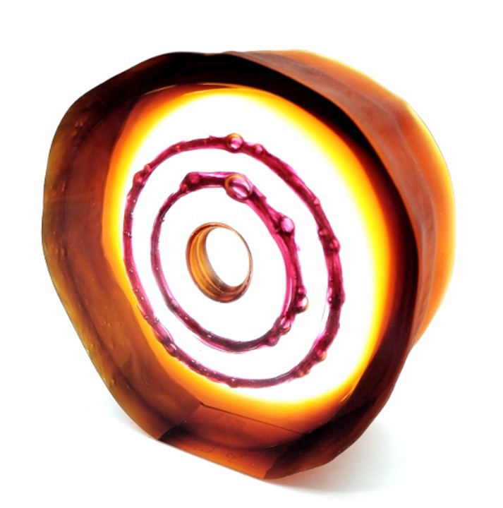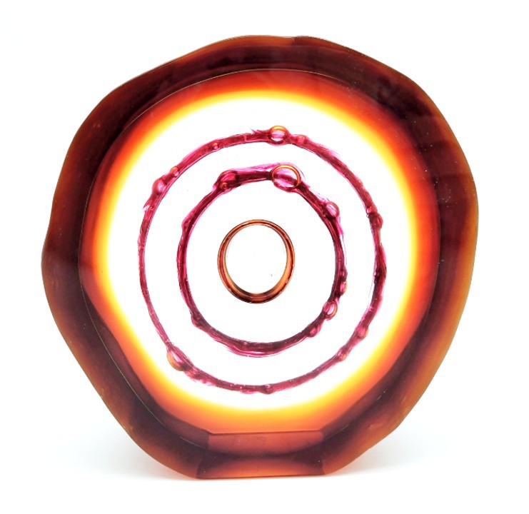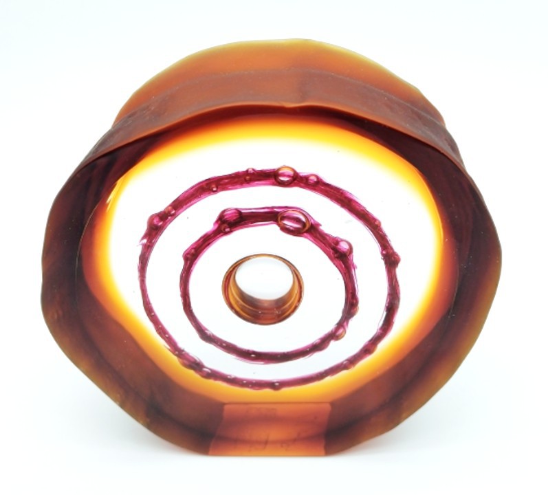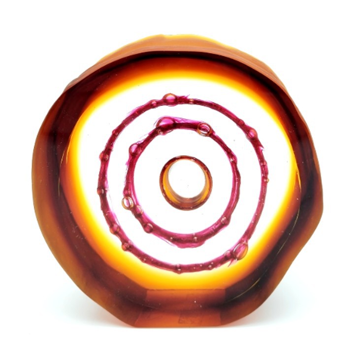Two circles of pink encase the central floating bubble in this art glass sculpture, with textured satin finish to the edge.