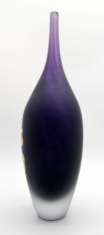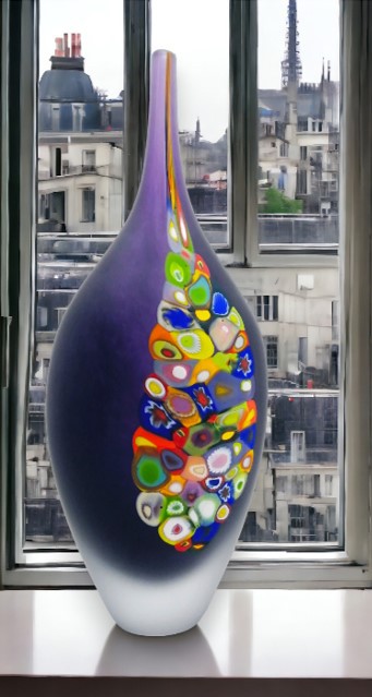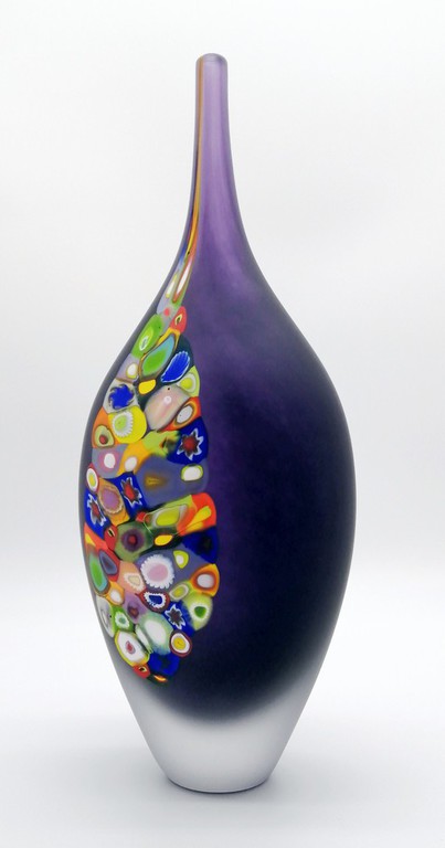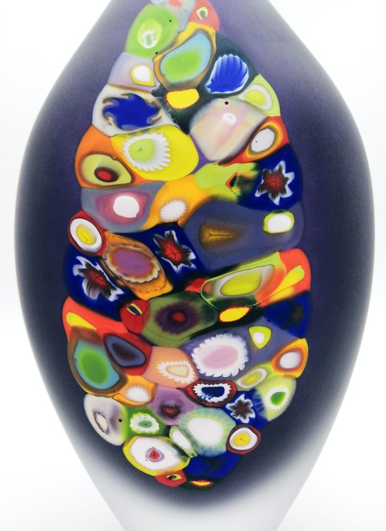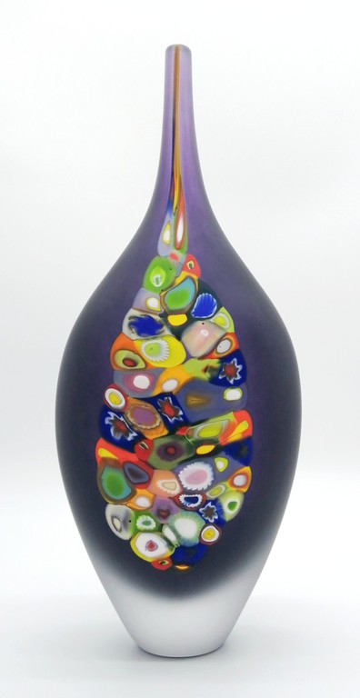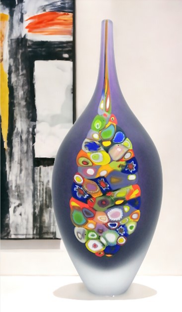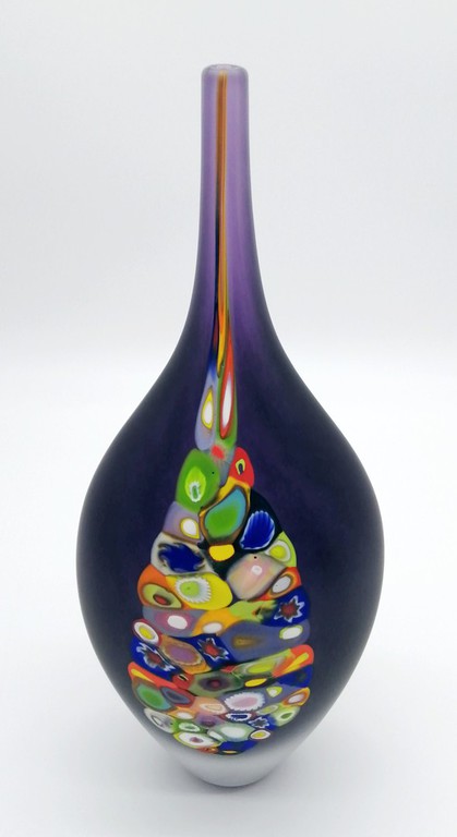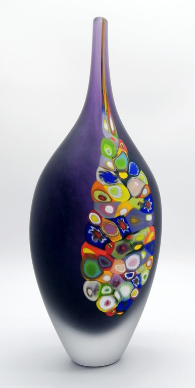 An elegant art glass vessel incorporating the Millefiori technique, complete with a soft satin finish.