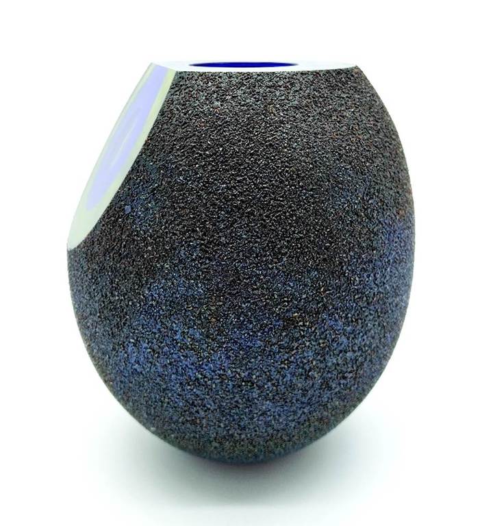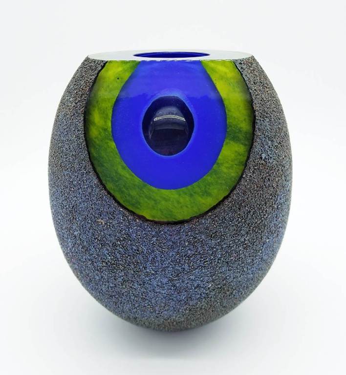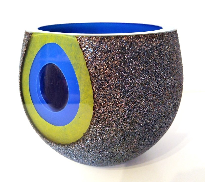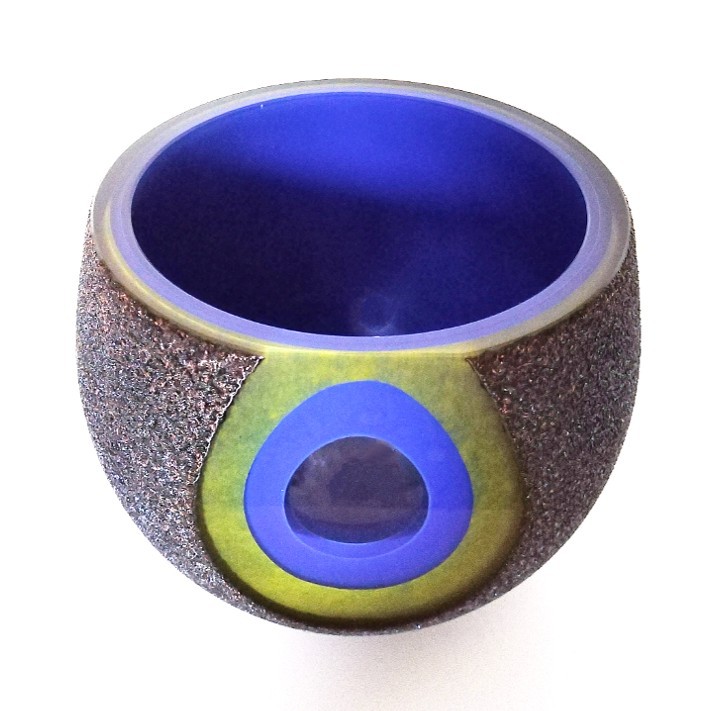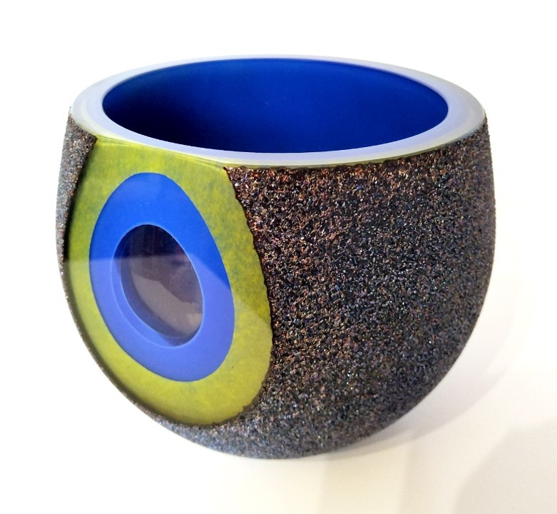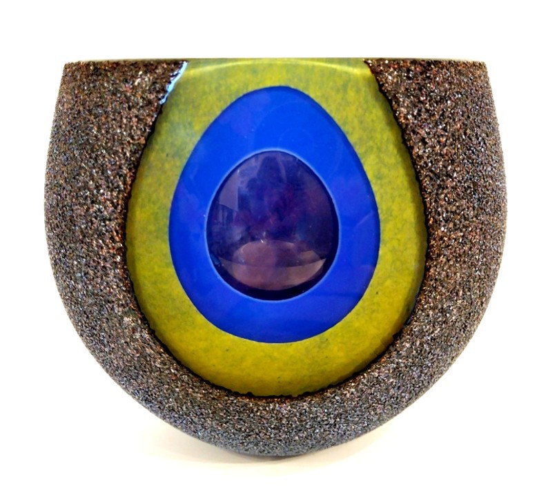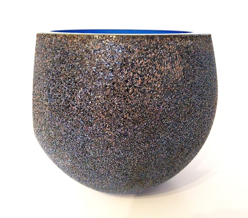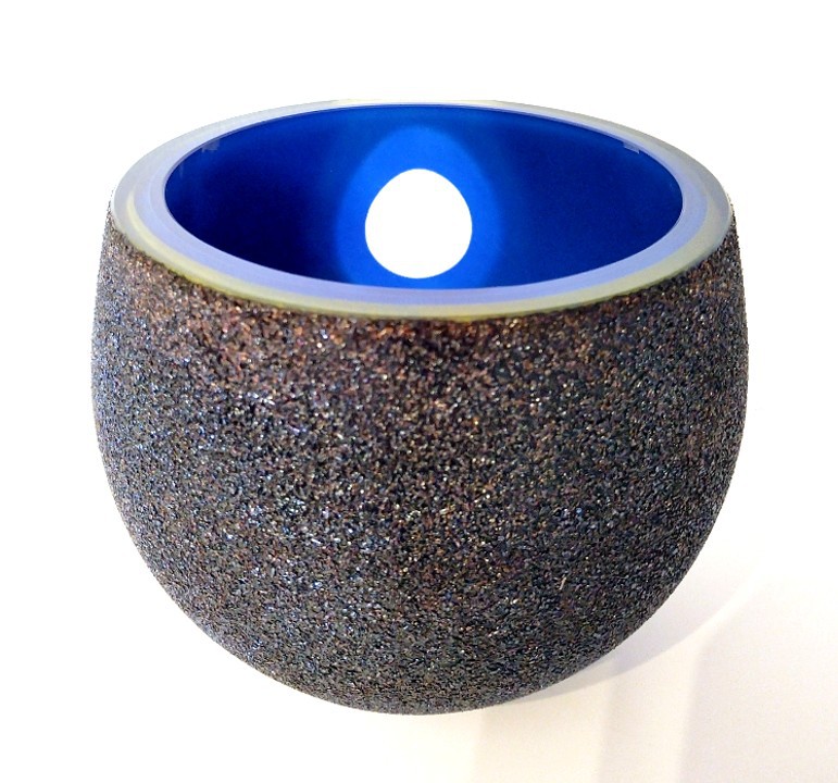 Inspired by molten formations of the early cosmos and moon rocks, this rare and stunning cased glass bowl has a facet cut to the front revealing layers of intense blue and green. The outer surface has a wonderful metallic finish which reflects the light beautifully.