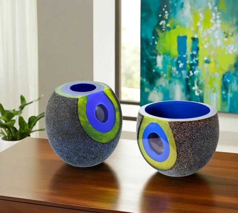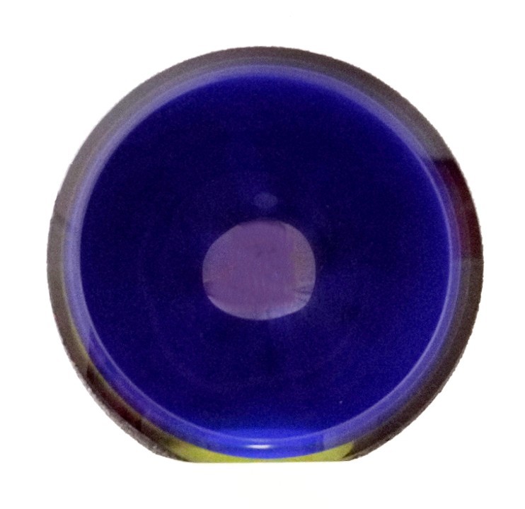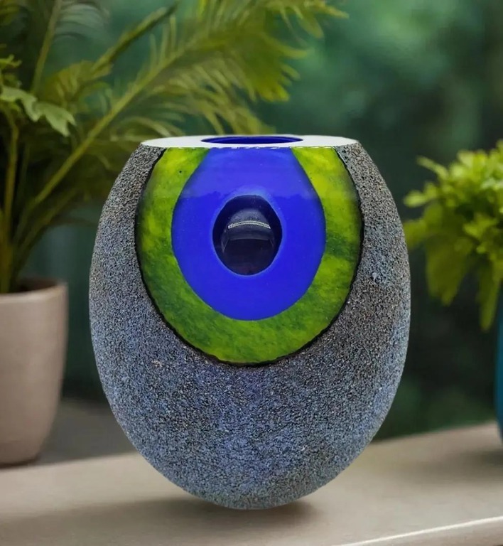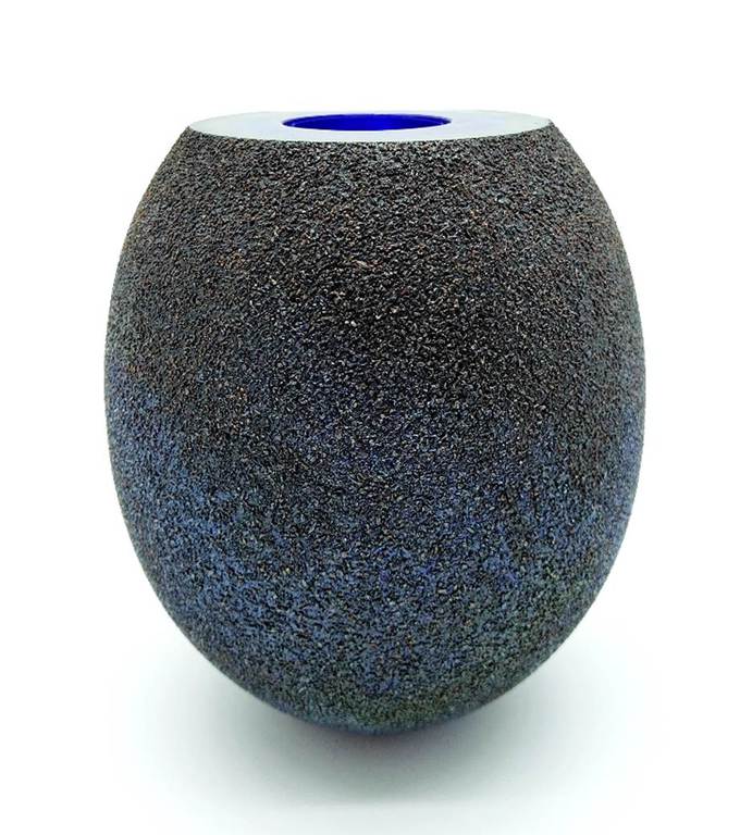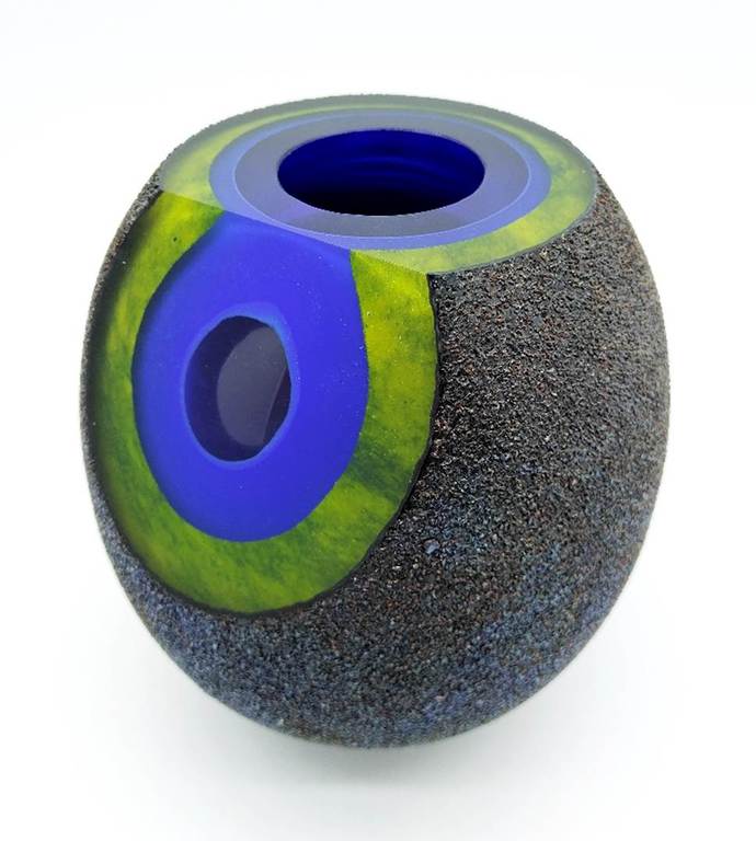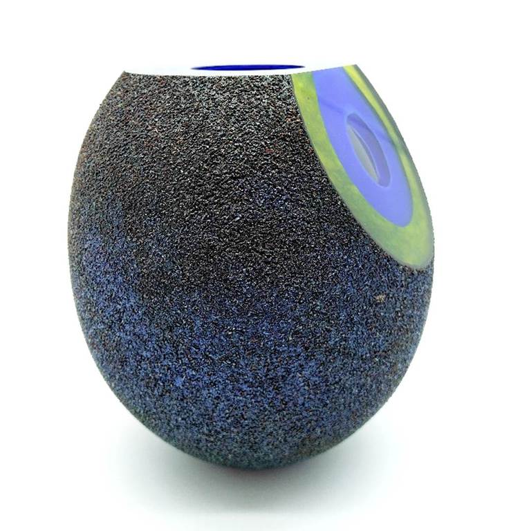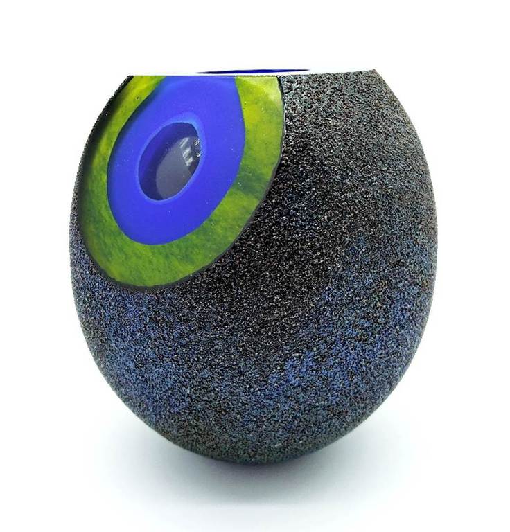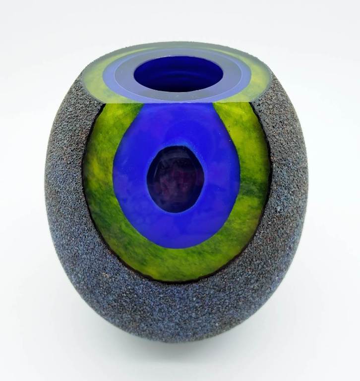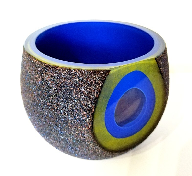 Inspired by molten formations of the early cosmos and moon rocks, this rare and stunning cased glass bowl has a facet cut to the front revealing layers of intense blue and green. The outer surface has a wonderful metallic finish which reflects the light beautifully.