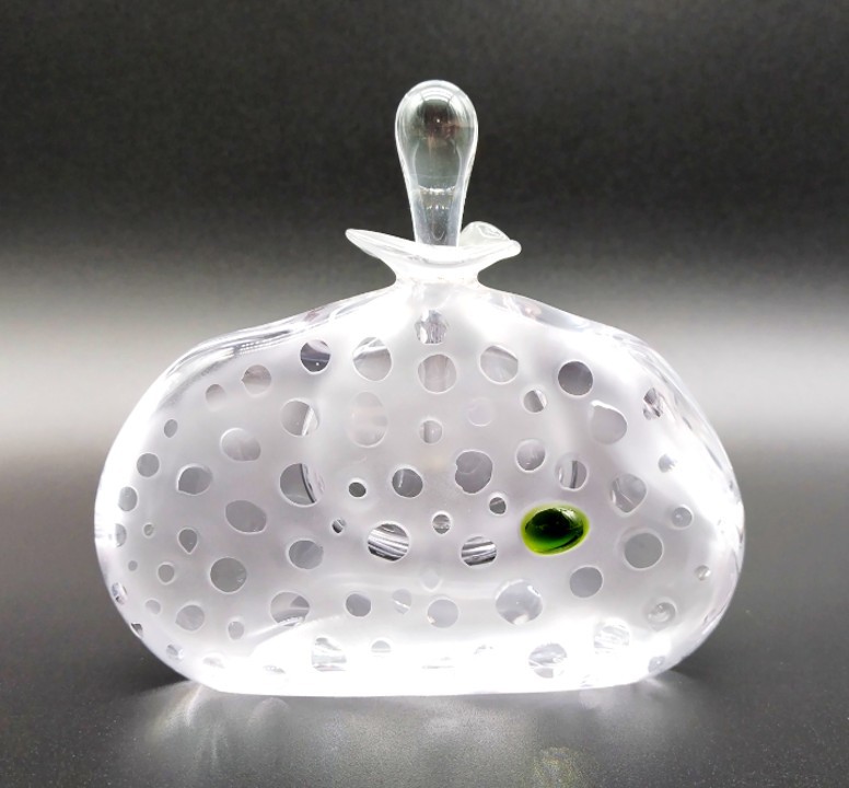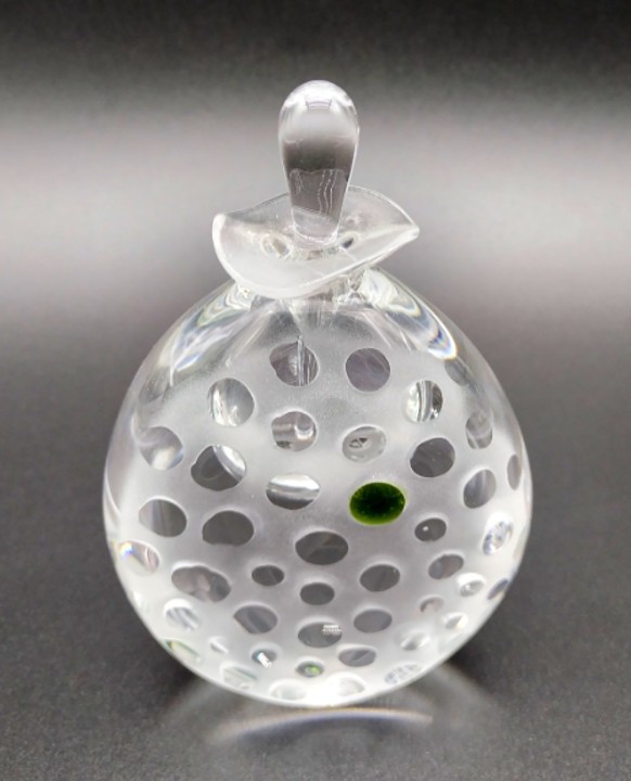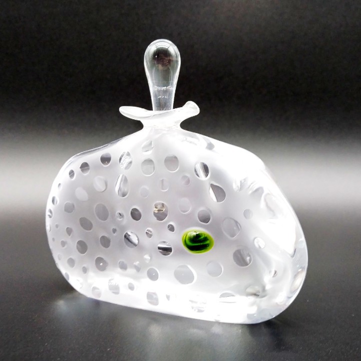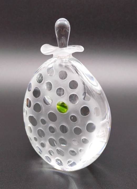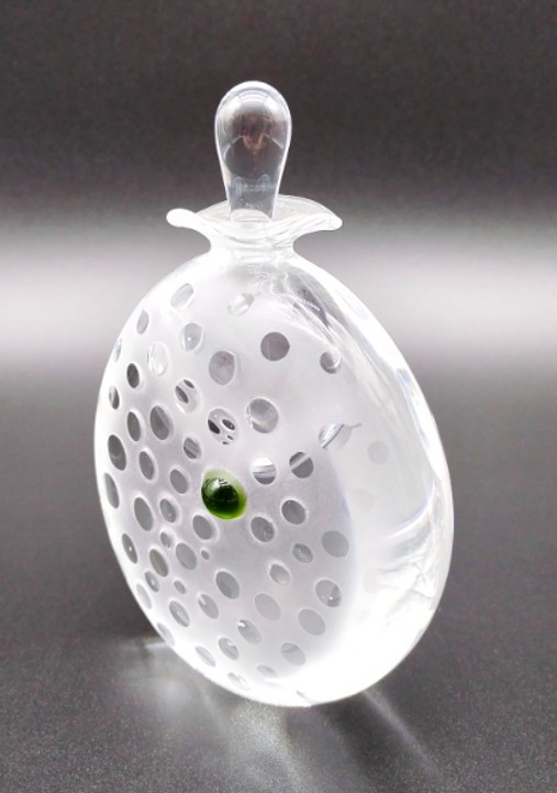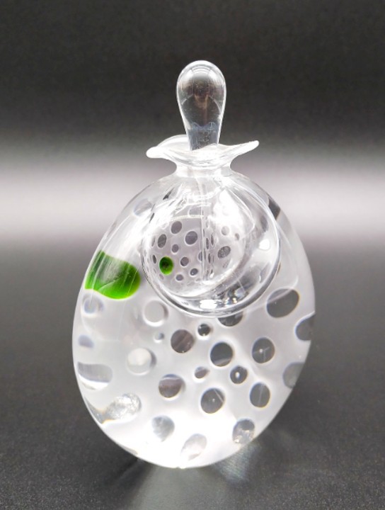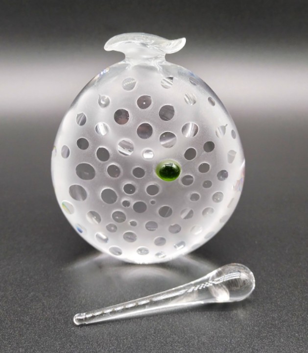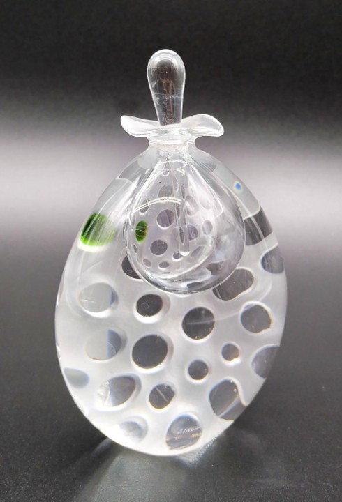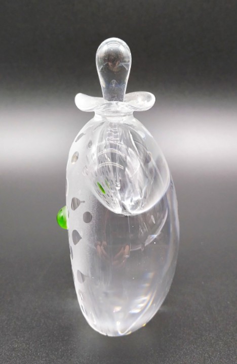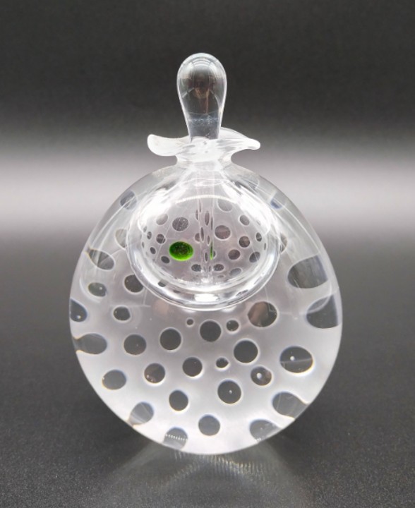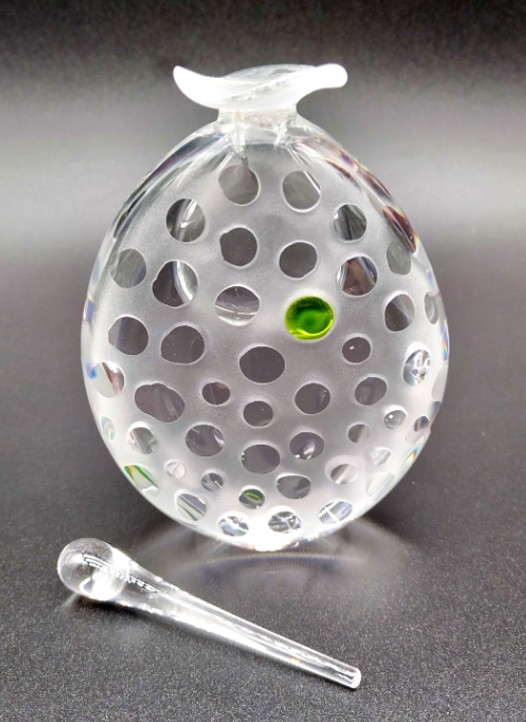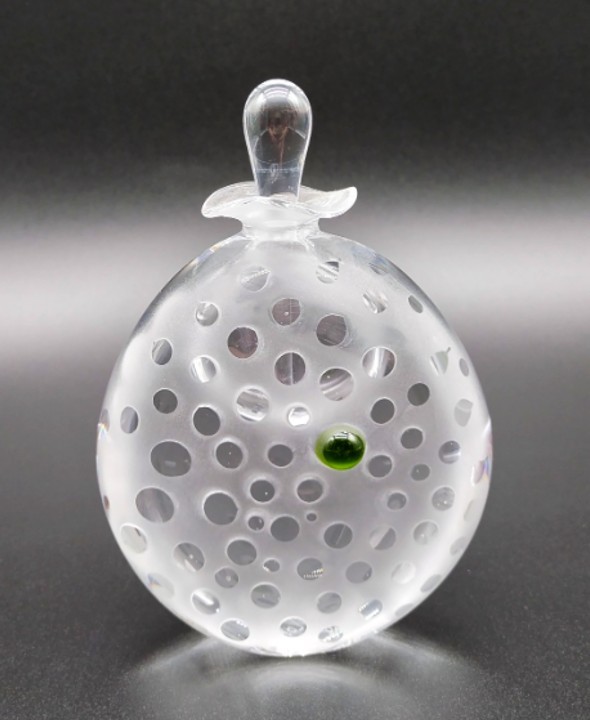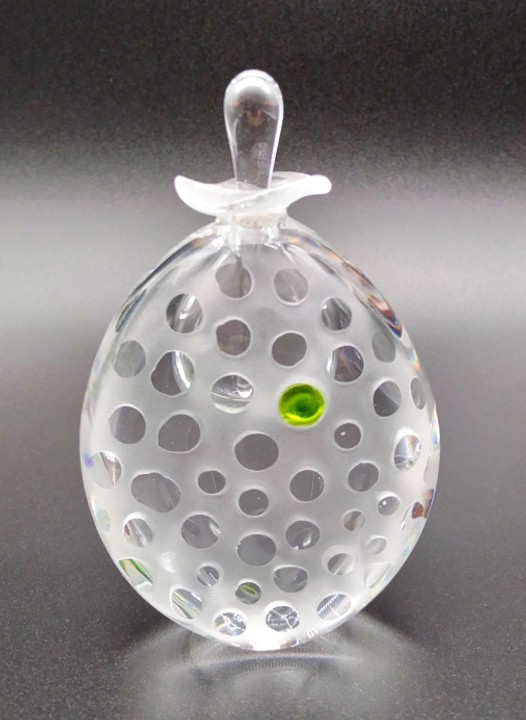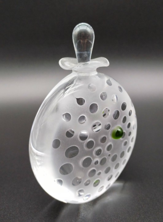 Add some timeless beauty to your decor with this pretty scent bottle. Acid etched with multiple lens cuts.