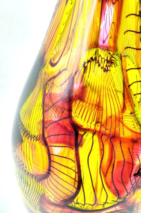 Seemingly stitched together creating an intricate mosaic, the warm glowing colours of glass blend beautifully in this shaped vessel.