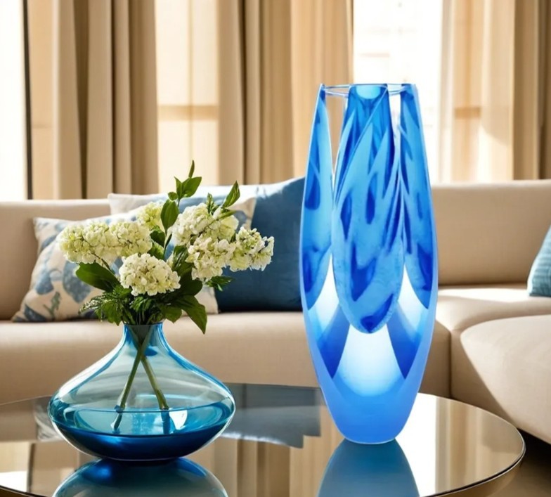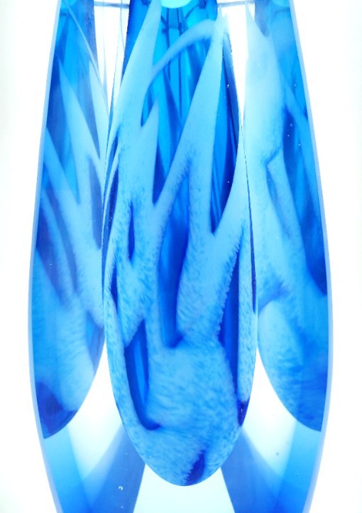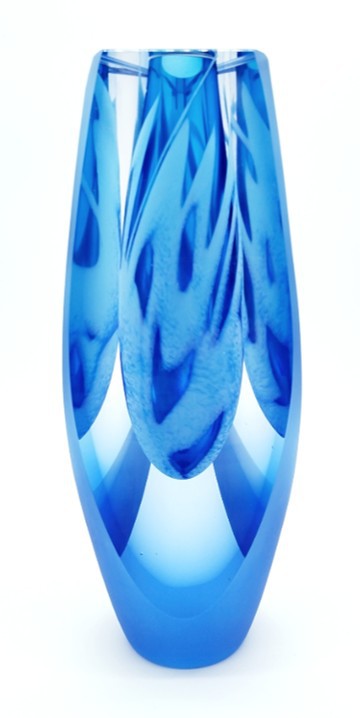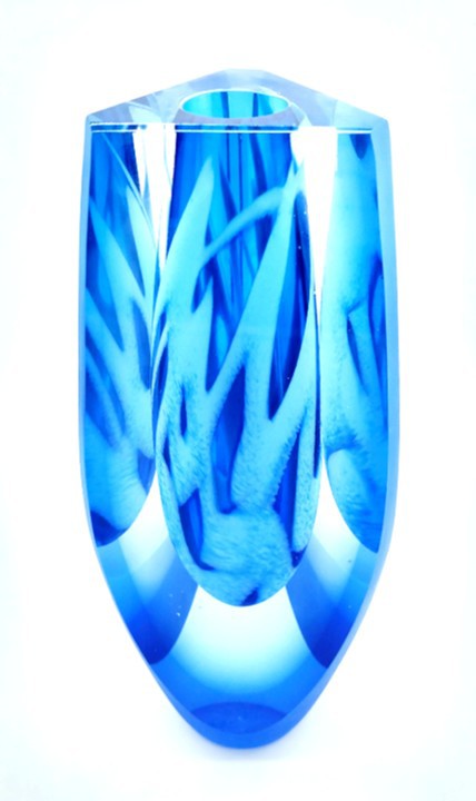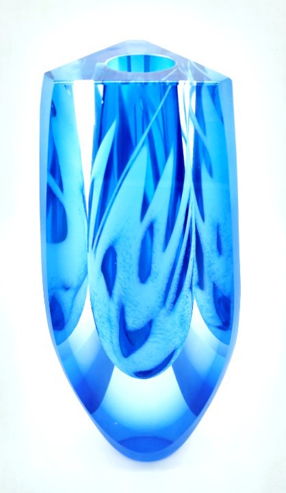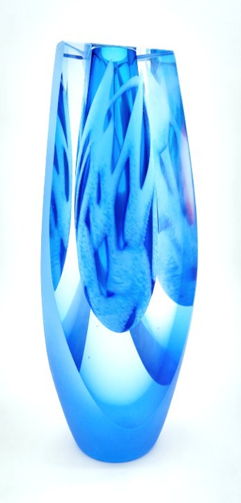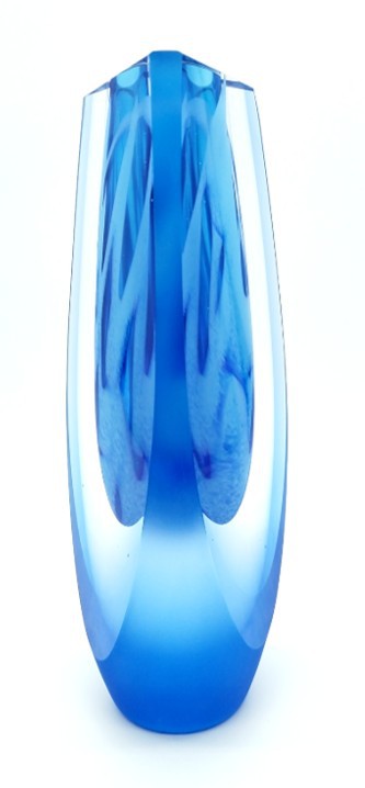 There's no escaping the beauty of this triangular shaped art glass vase, blending cool aqua and white.