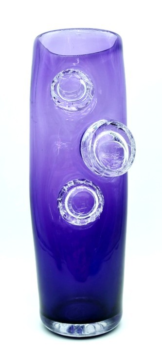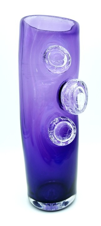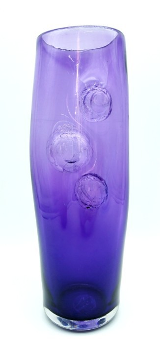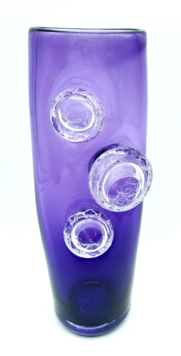 Three 'cracked' glass bubbles nestle comfortably against the vivid purple of this contemporary art glass vase.