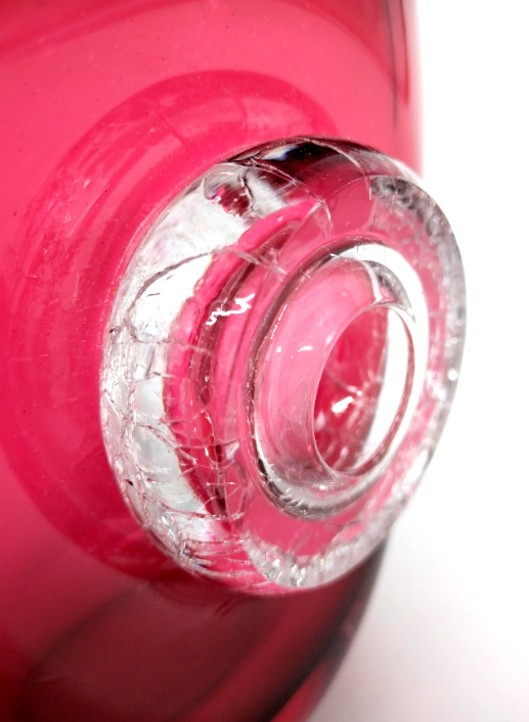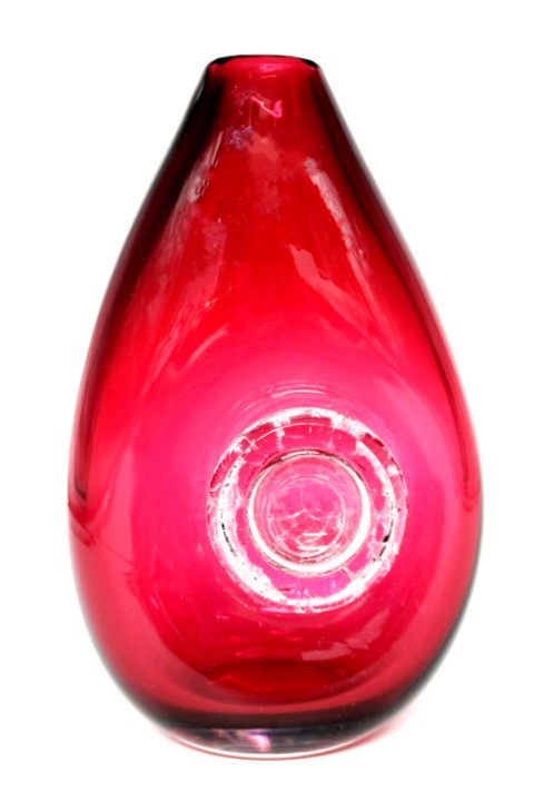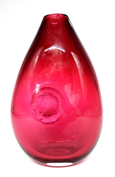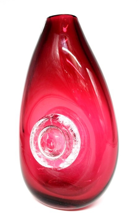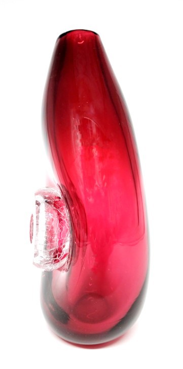 A 'cracked' glass bubble nestles comfortably against the vivid red of this contemporary art glass vase.