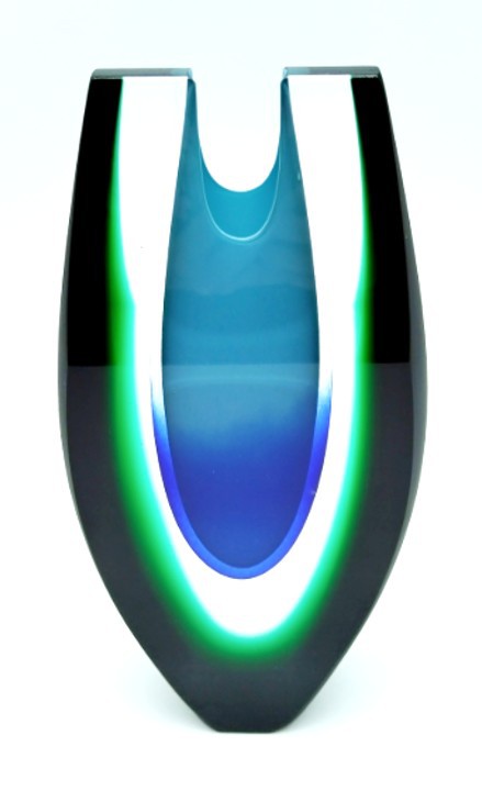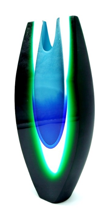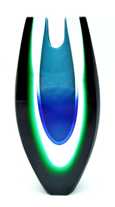 Blue and green should certainly be seen together and makes a beautiful combination in this art glass vase. Shaped to the top and complete with a green satin sheen.