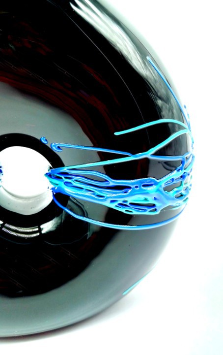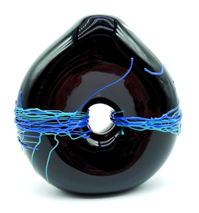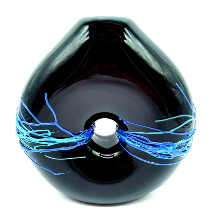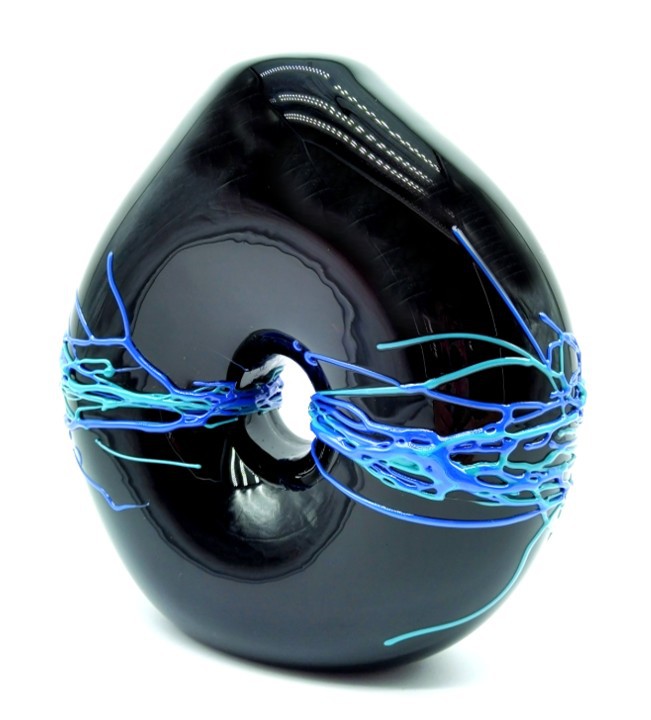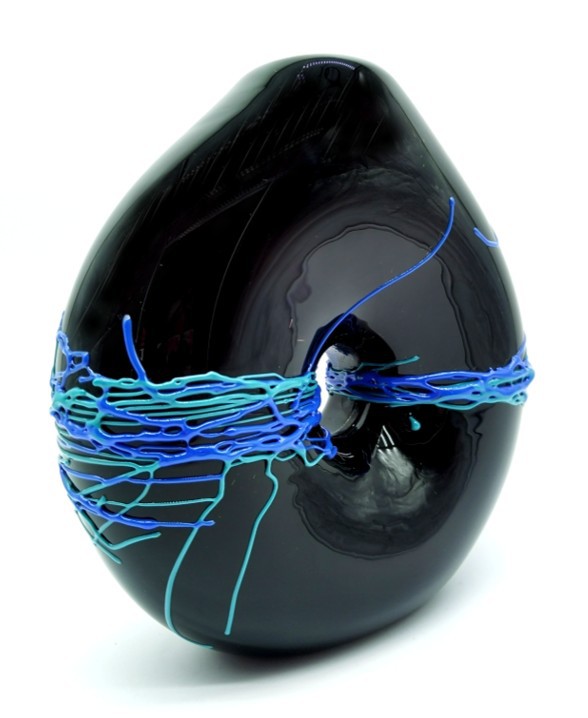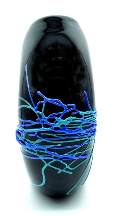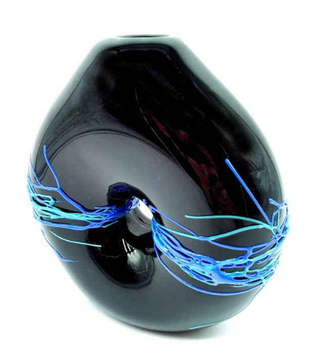 Intricate threads of blue glass wind their way round this dramatic black vessel.