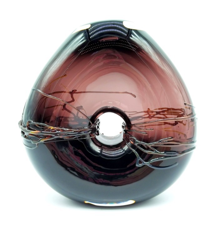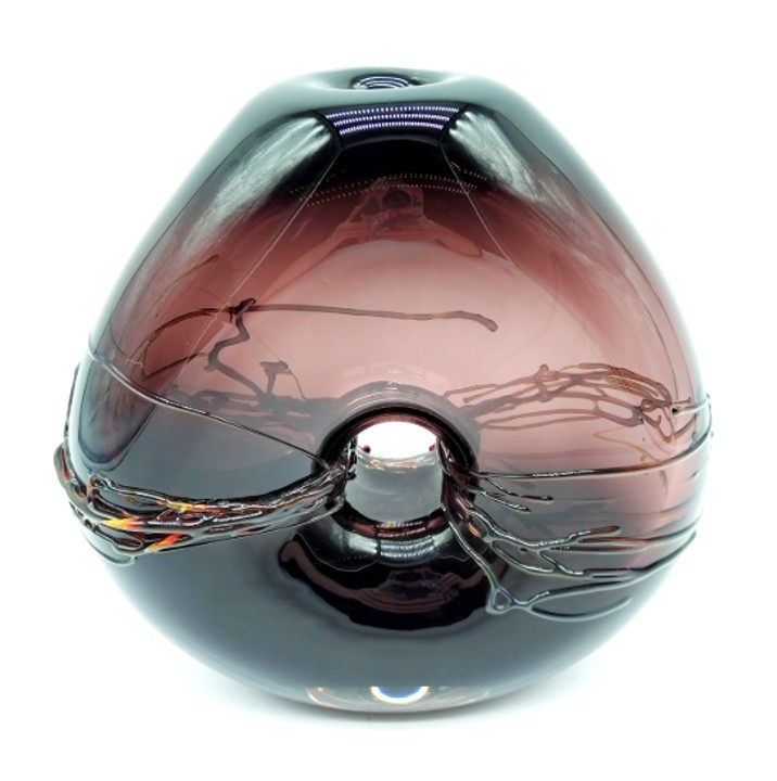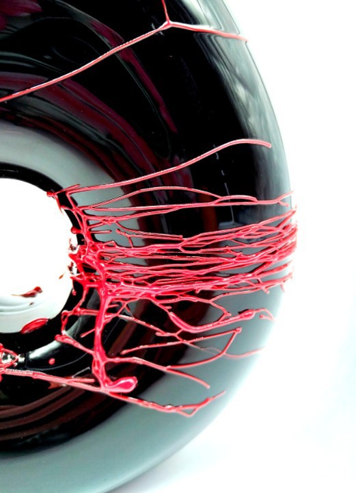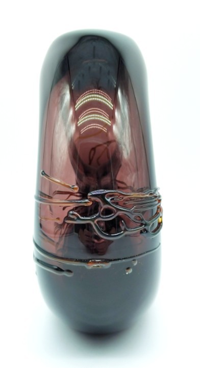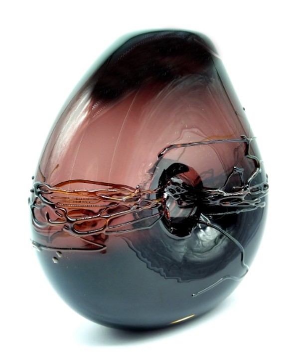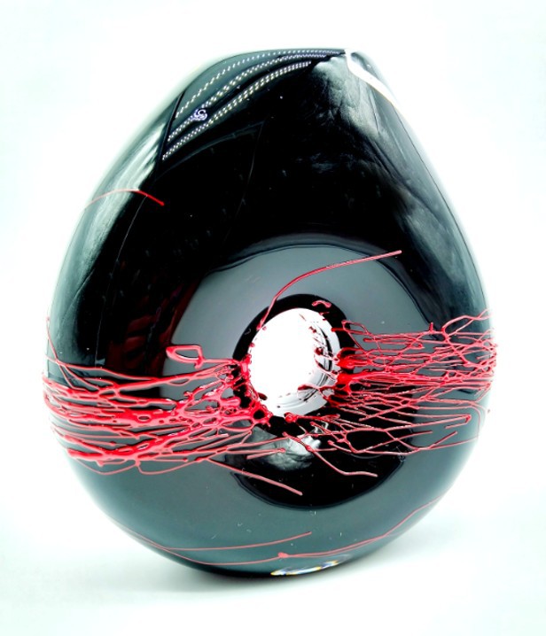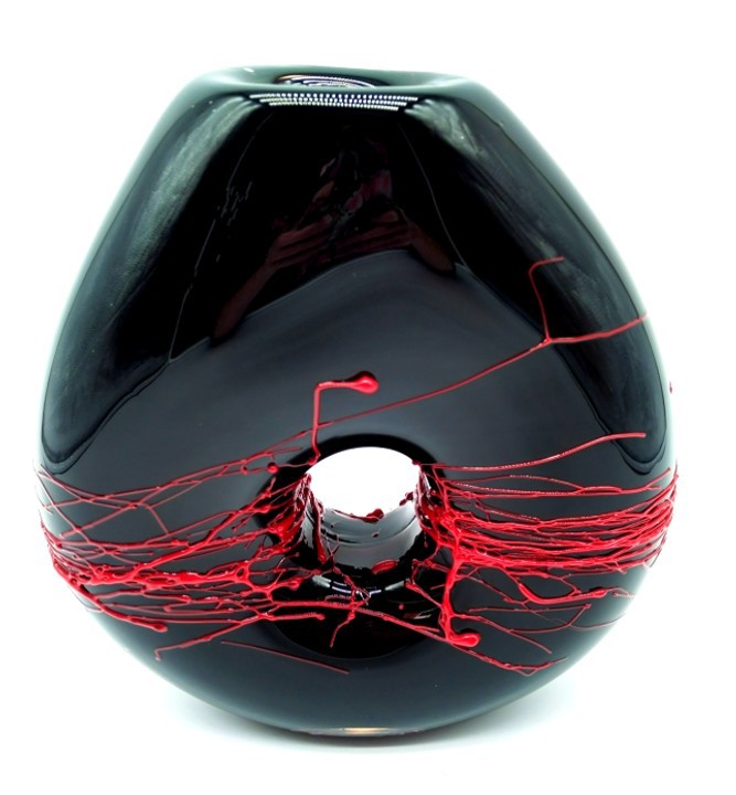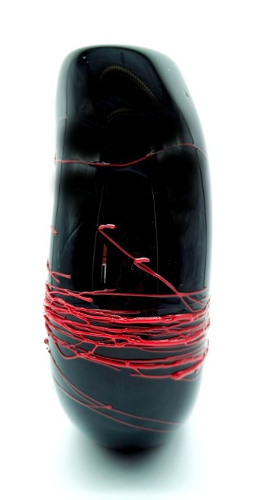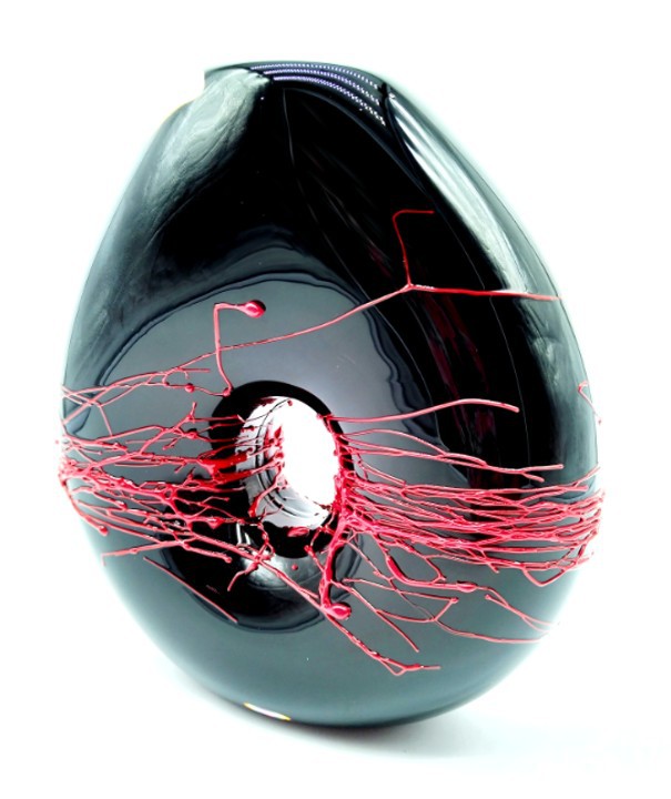 Intricate red threads of glass wind their way round this dramatic black vessel.