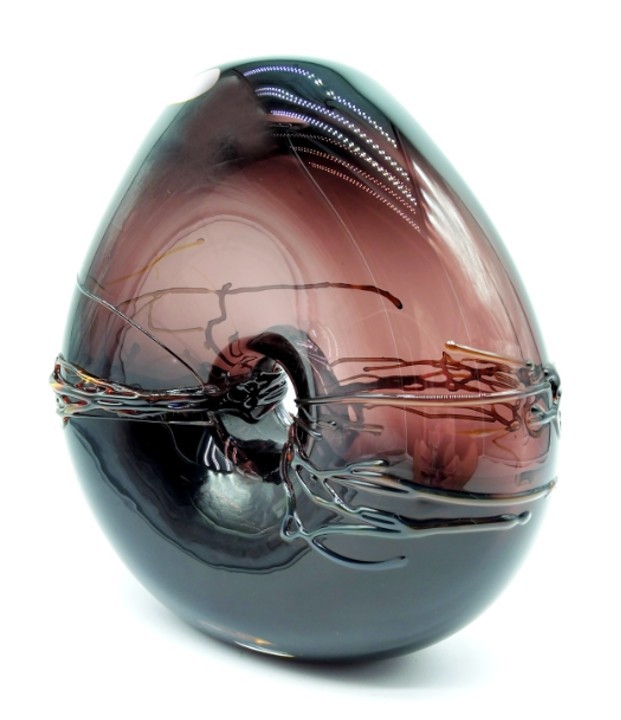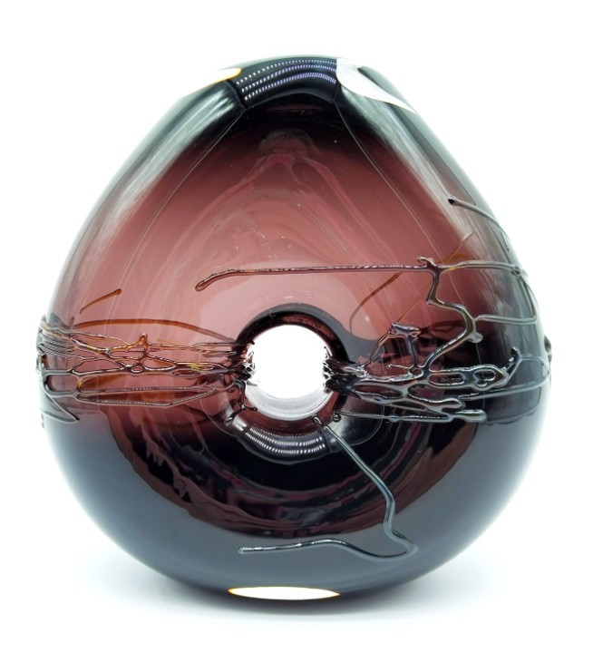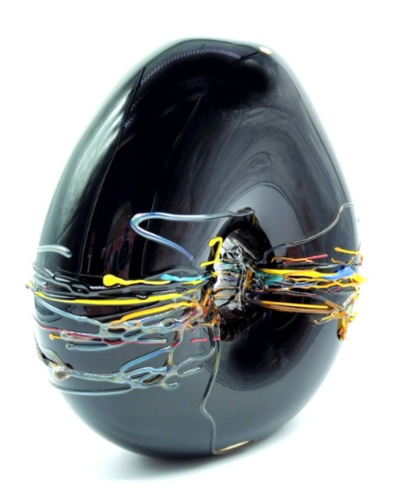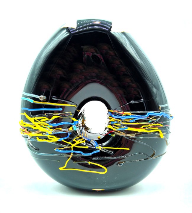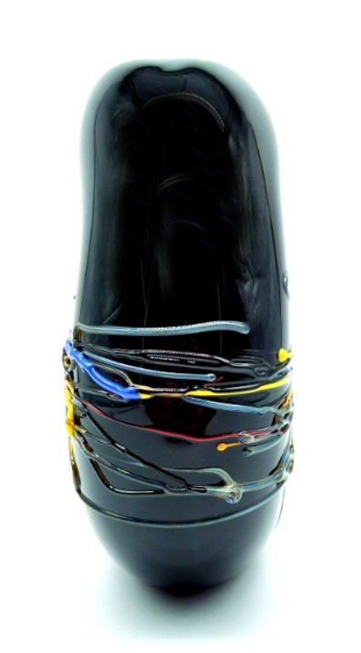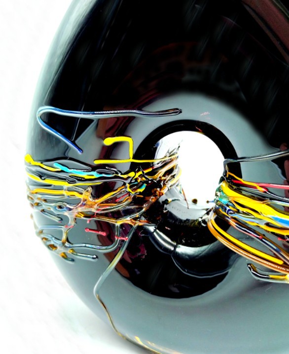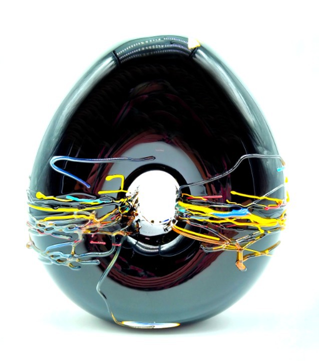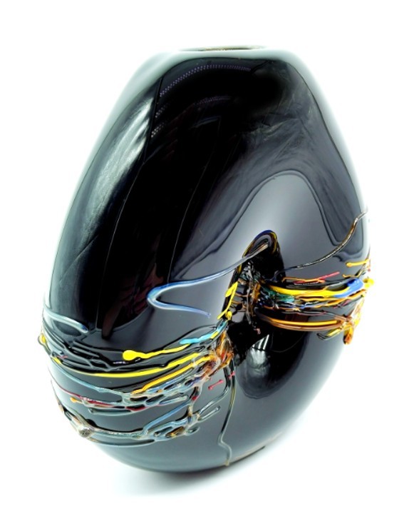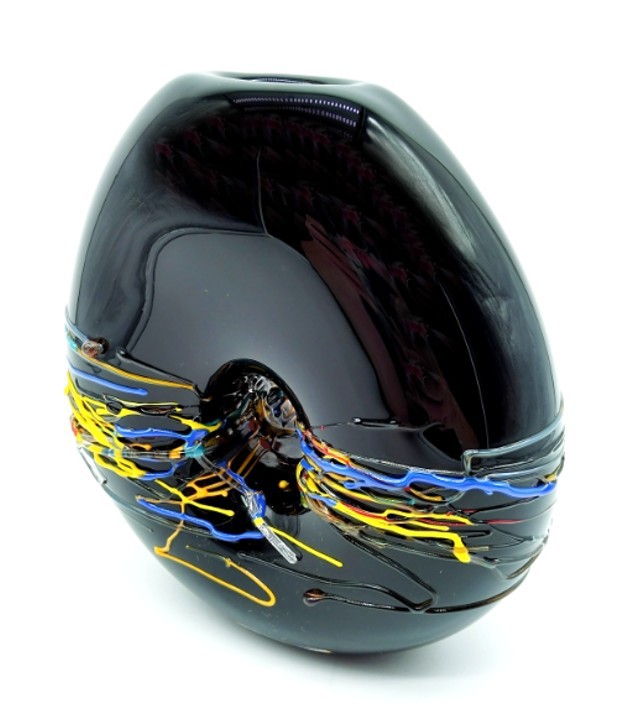 Intricate coloured threads of glass wind their way round this dramatic black vessel.