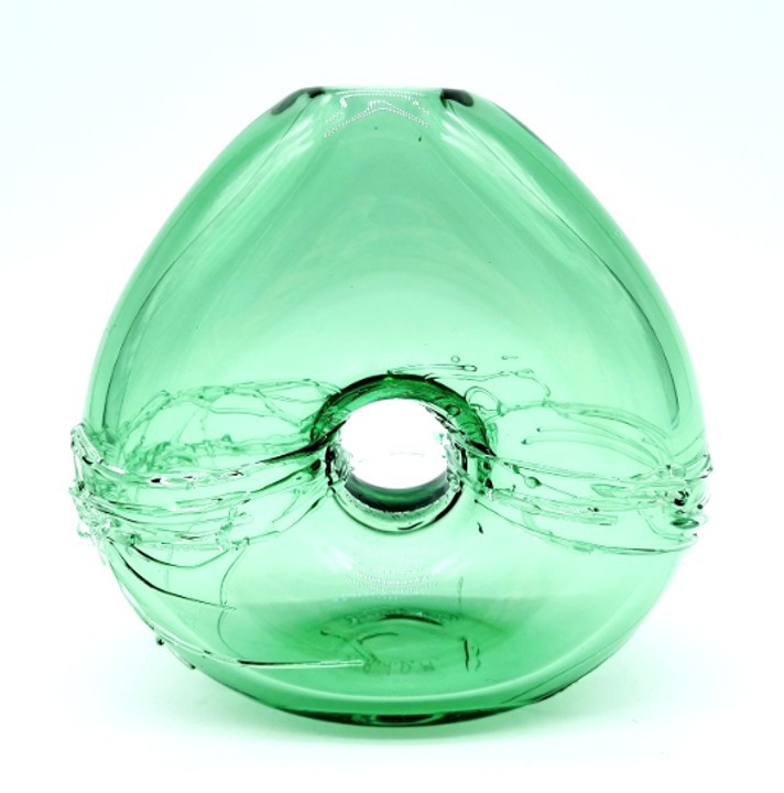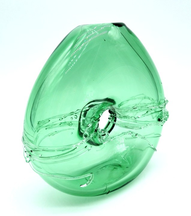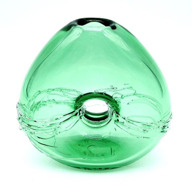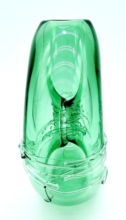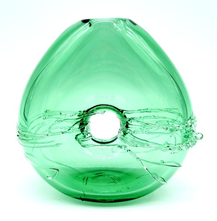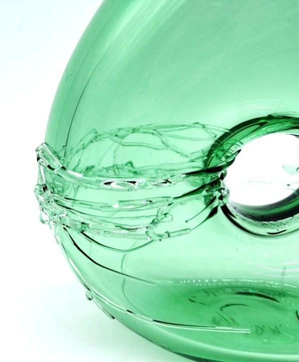 Intricate threads of glass wind their way round this beautiful green vessel.