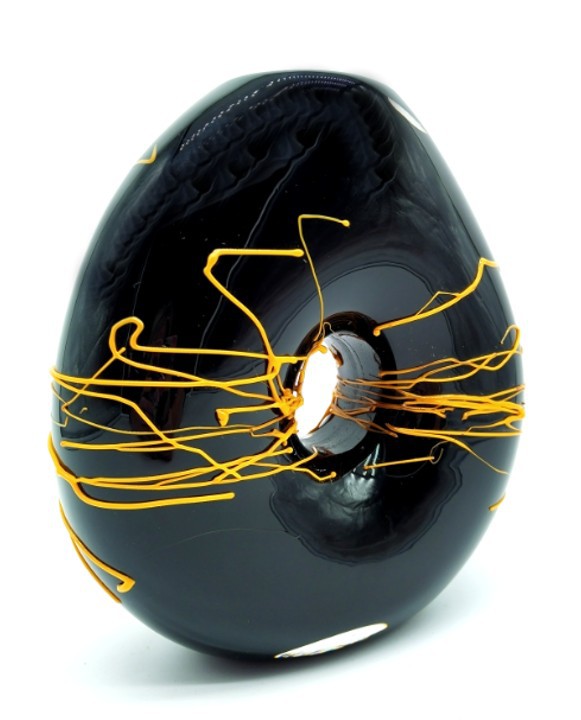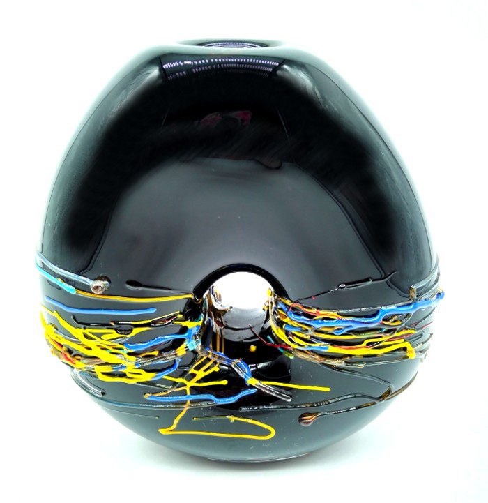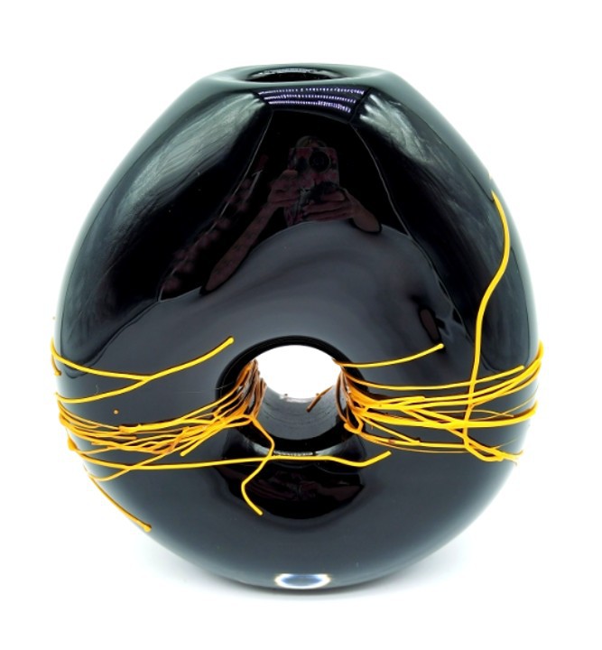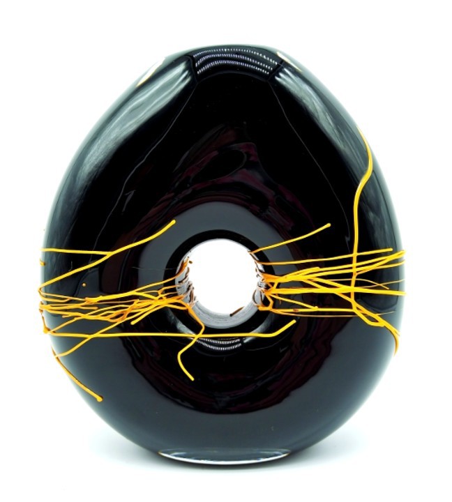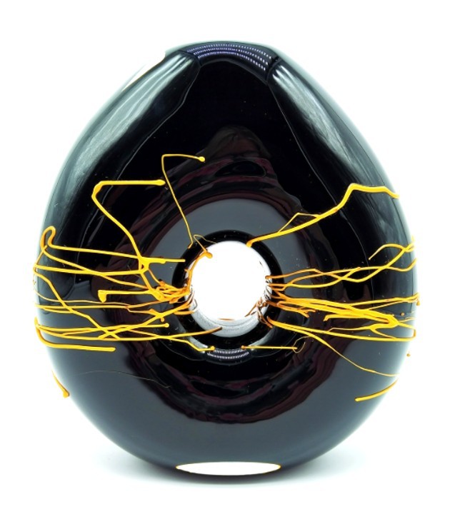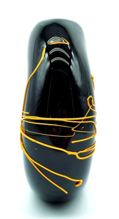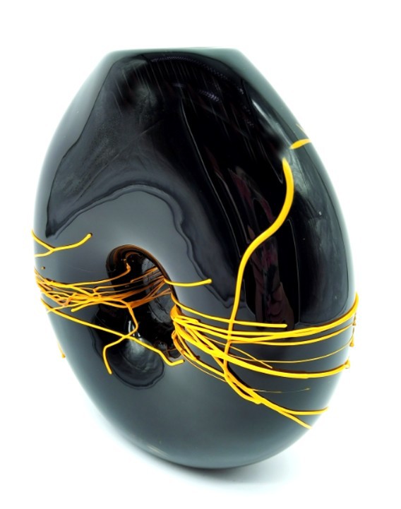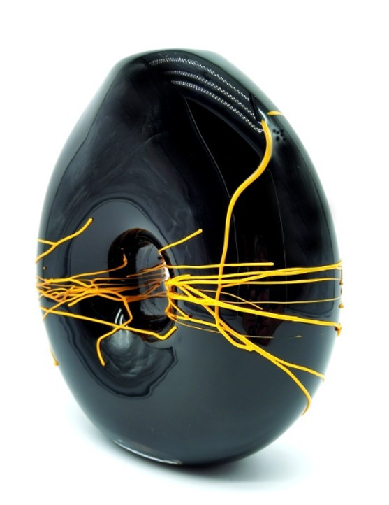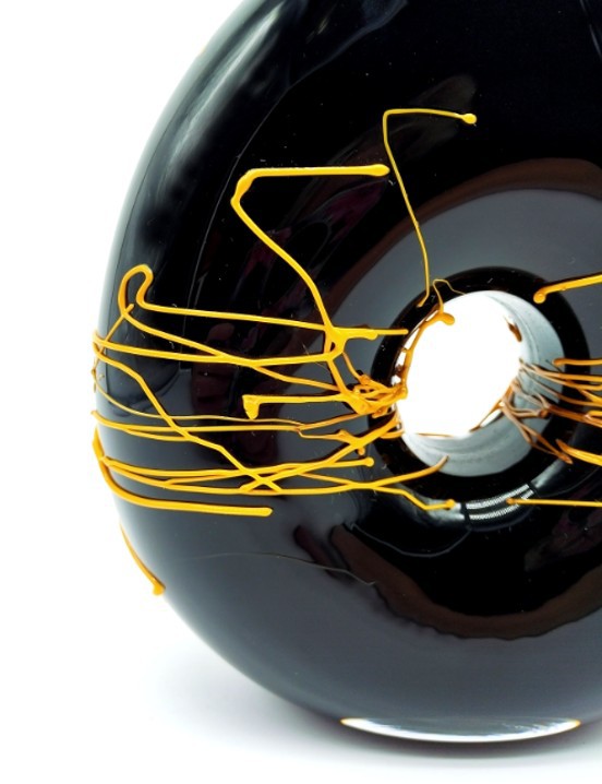 Intricate yellow threads of glass wind their way round this dramatic black vessel.