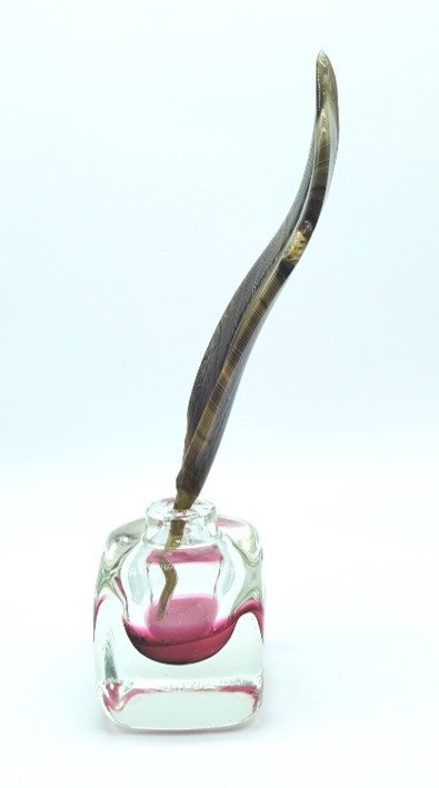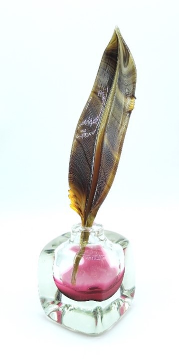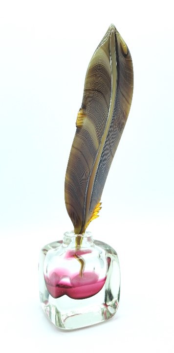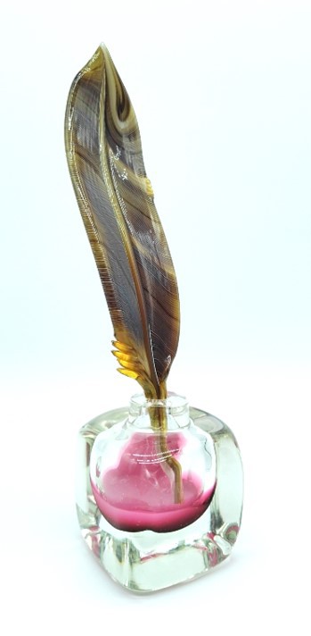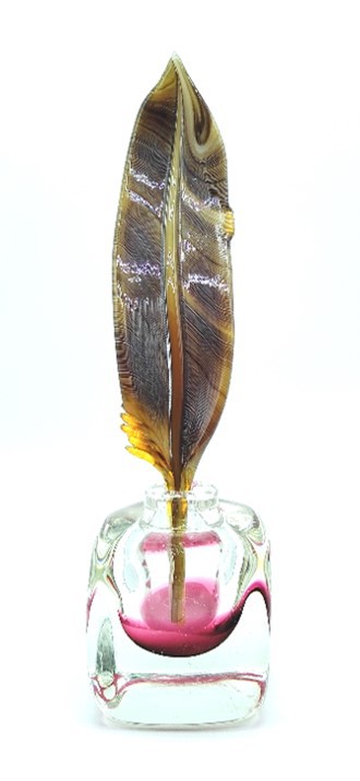 Each feather quill symbolises a different figure. The hen’s feather, brown with a white top, writes with pink ink symbolising a mother writing of love.