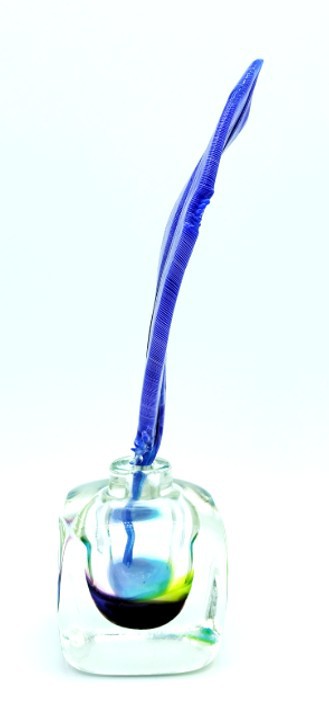 Each feather quill symbolises a different figure. The swan's feather, held by a beauty writing in vibrant purple ink in this repulsive world.