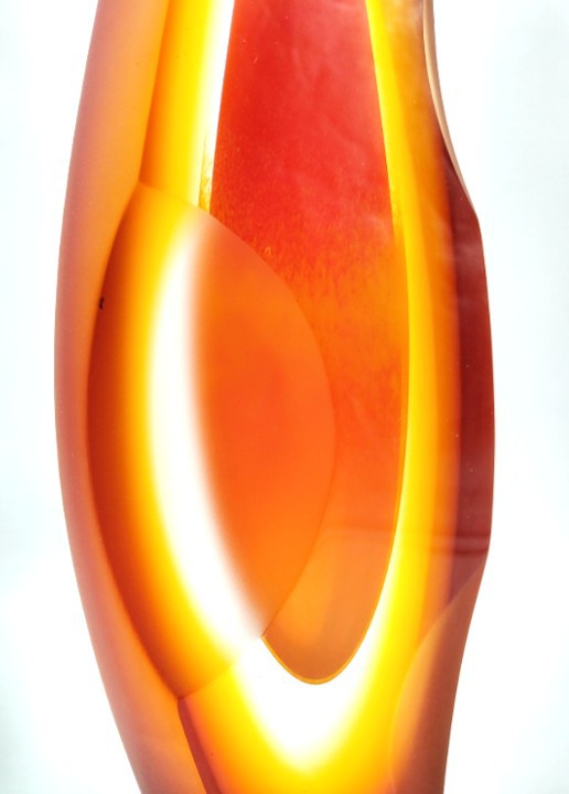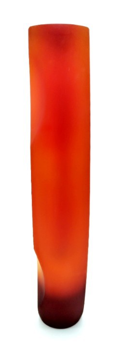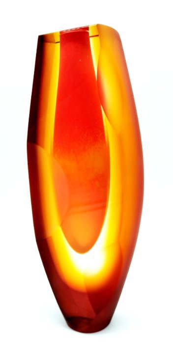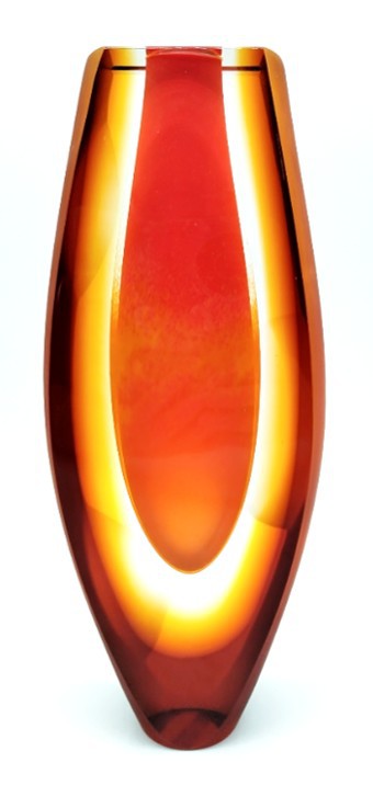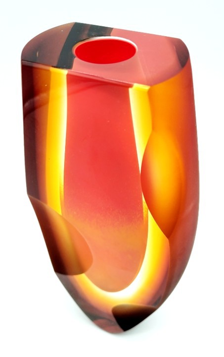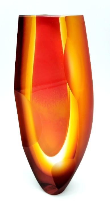 Warm tones of red and yellow radiate from the centre of this art glass vase. Finished with a warm amber satin effect to the sides and facet cuts.