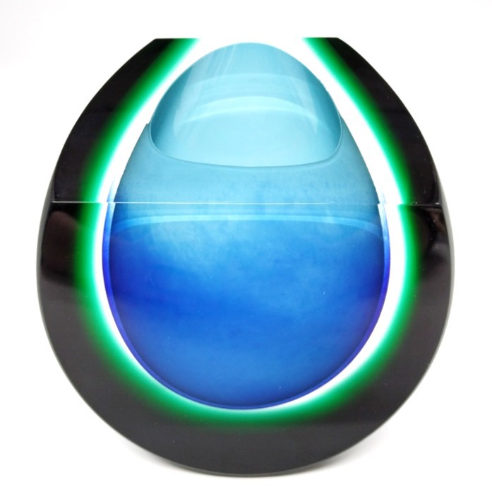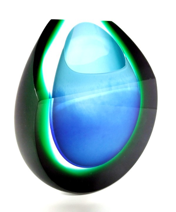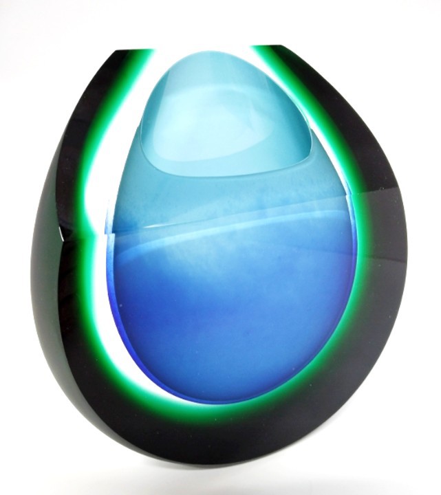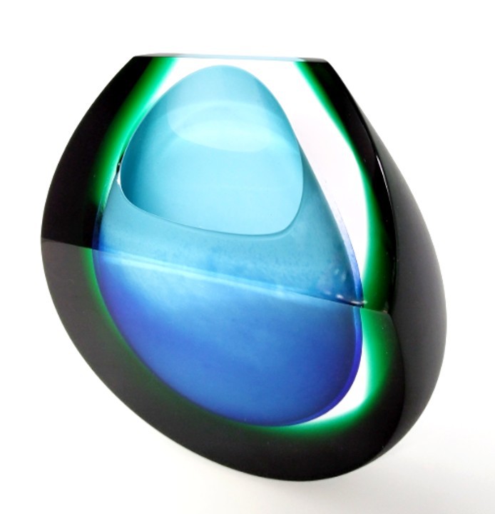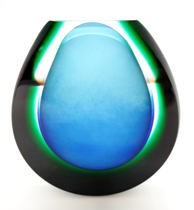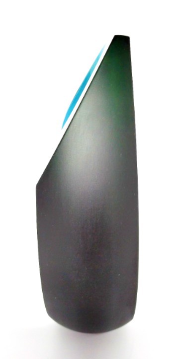 Blue and green should certainly be seen together and makes a refreshing combination in this art glass vase. Shaped to the top and complete with a green satin sheen.