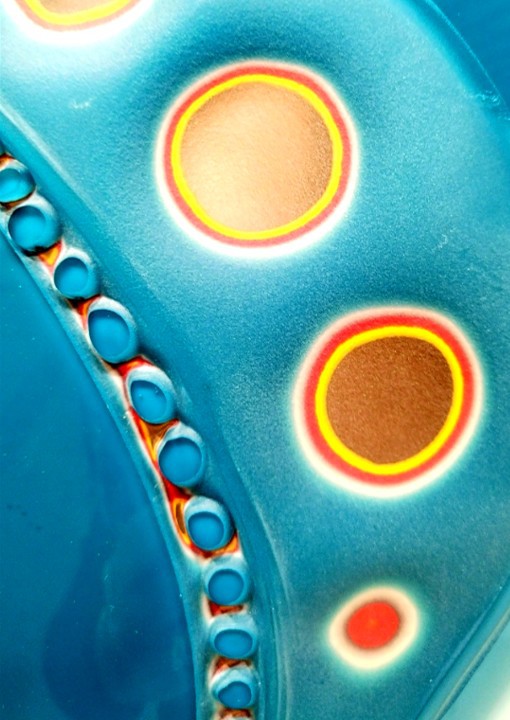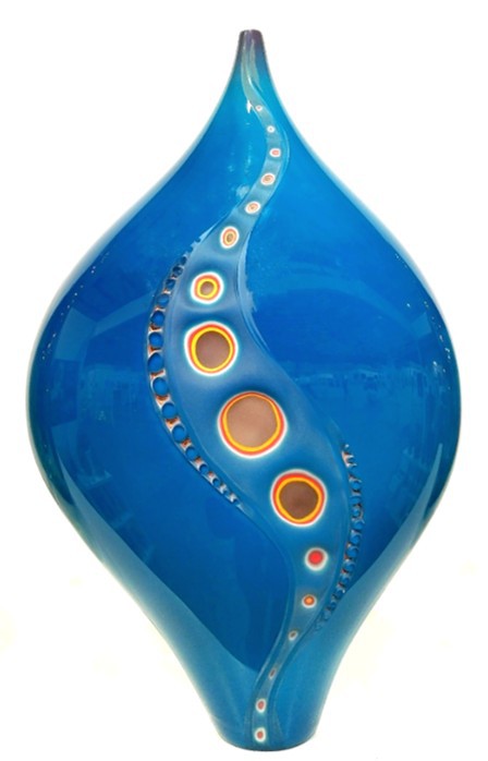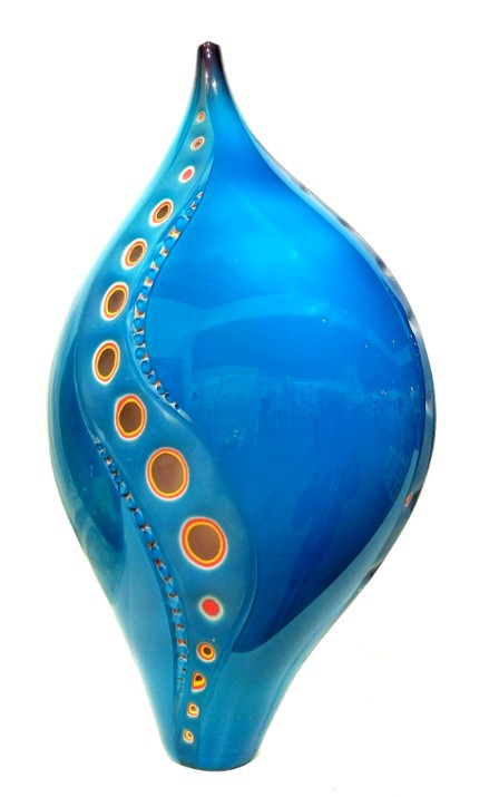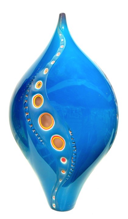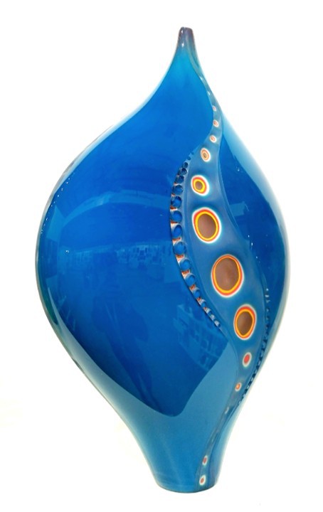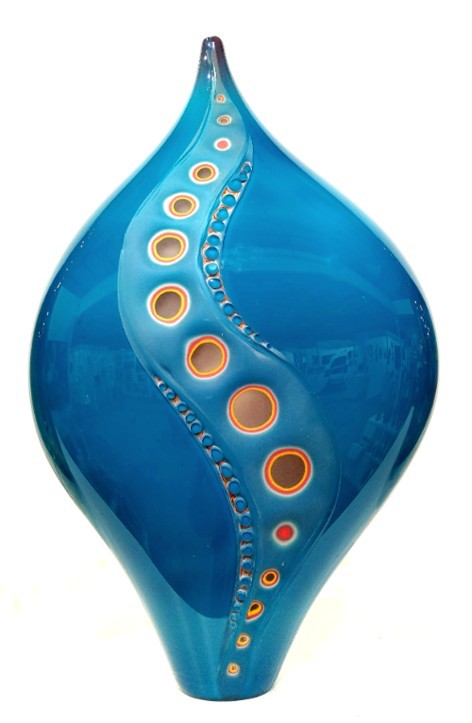 A synthesis of techniques created from a complex multi-colored blank, overlaid with transparent and opaque layers of colour with clear glass. These are then carved to create a textured surface exposing strata and veins.