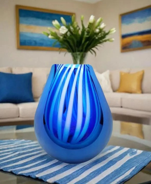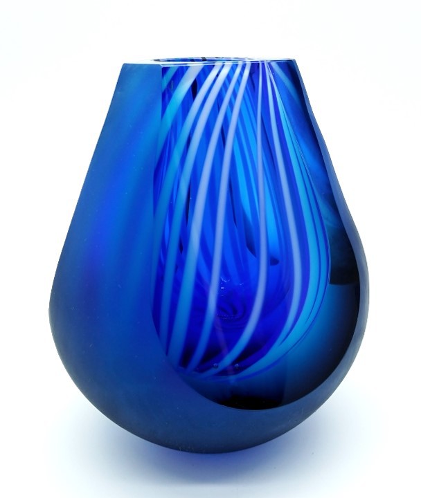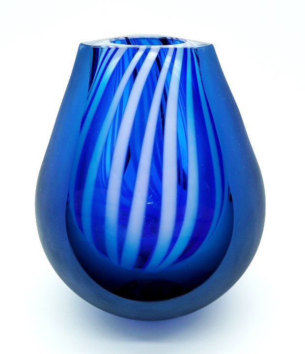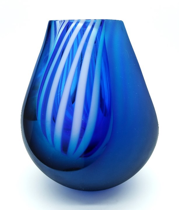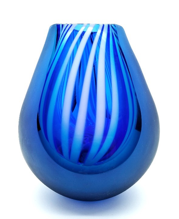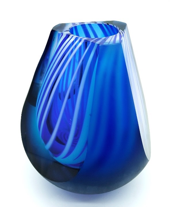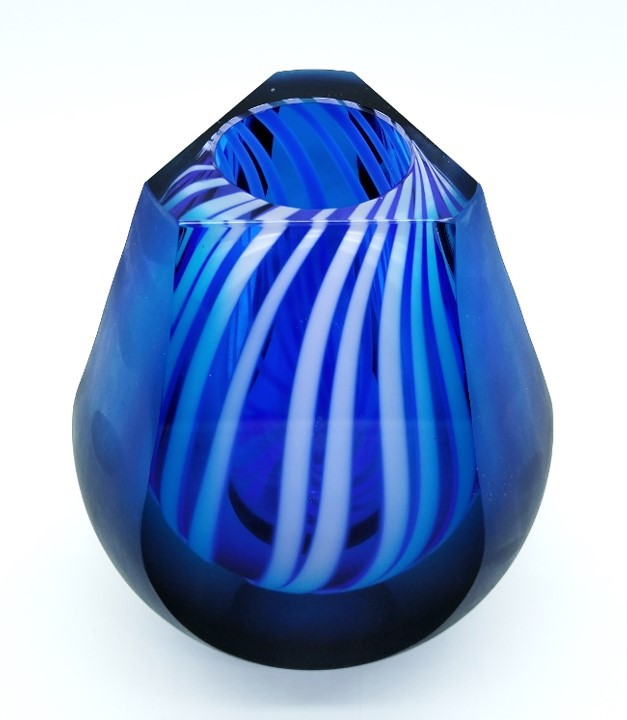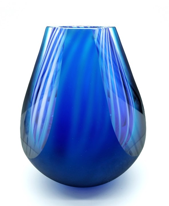 Rich cobalt tones are beautifuuly offset by crisp white in this contemporary art glass vase. Triangular shaped with a soft satin finish.