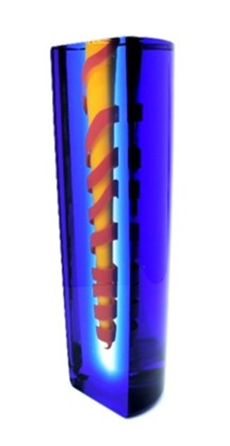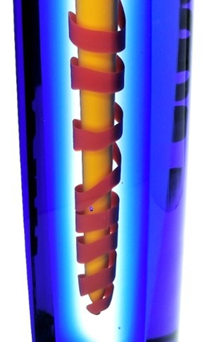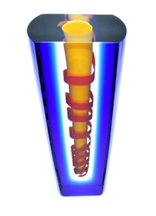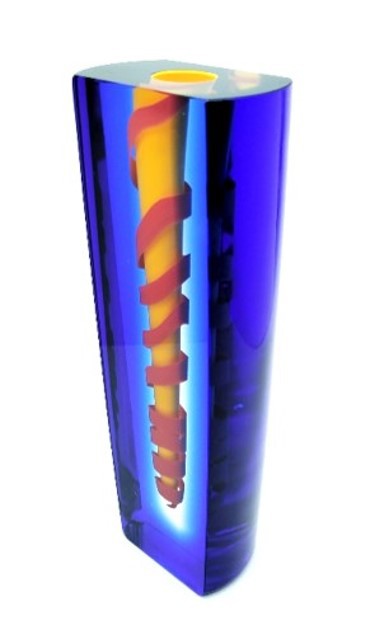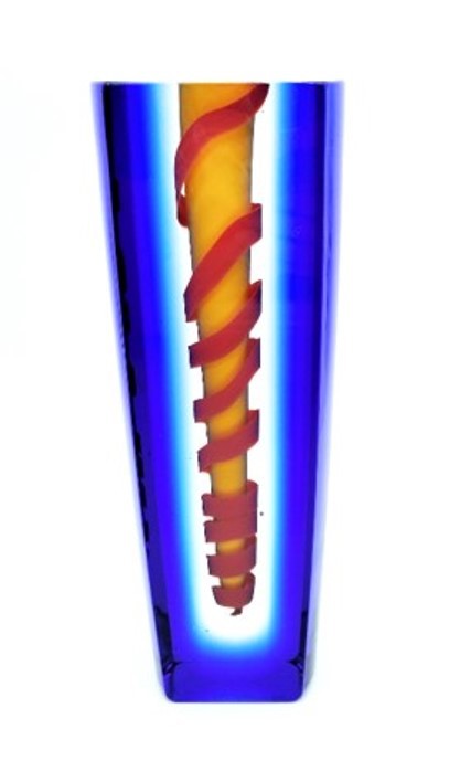 A vibrant red coil envelops the yellow central drop in this contemporary art glass vase, framed in regal blue.