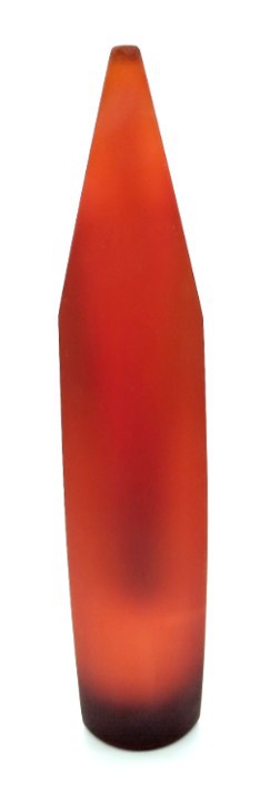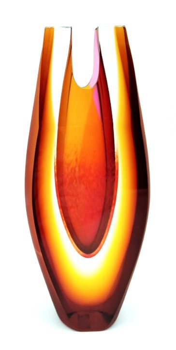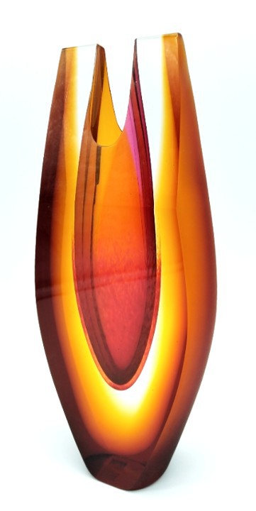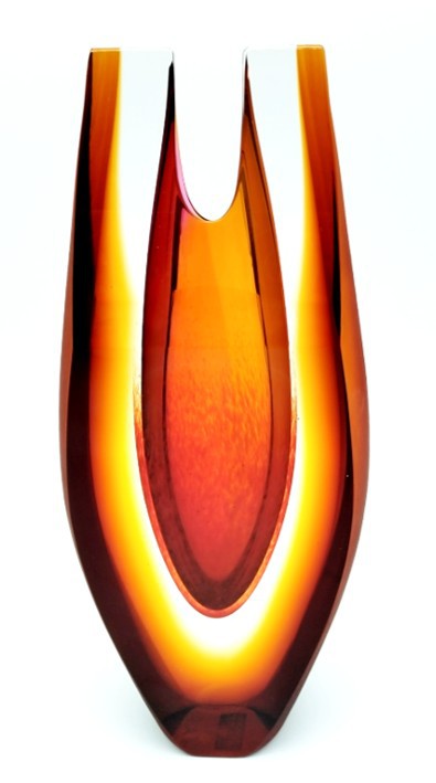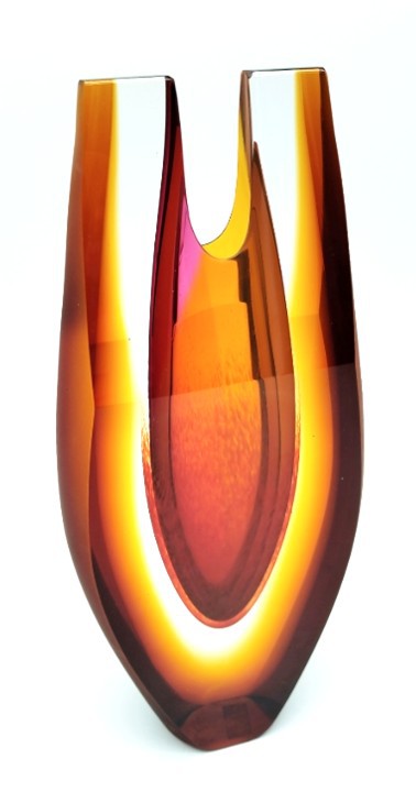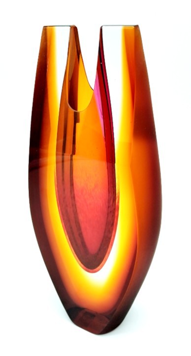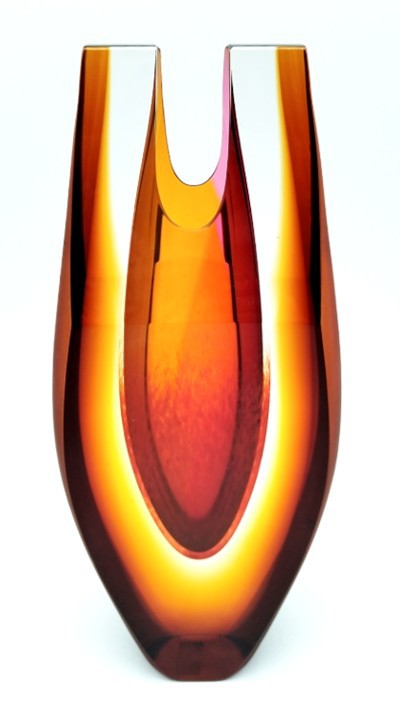 Feel the heat radiating from this contemporary art glass vase, with shaped top and amber satin finish to the sides.