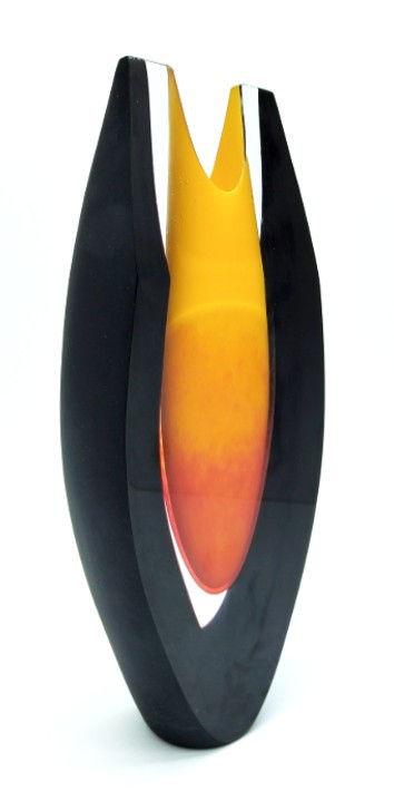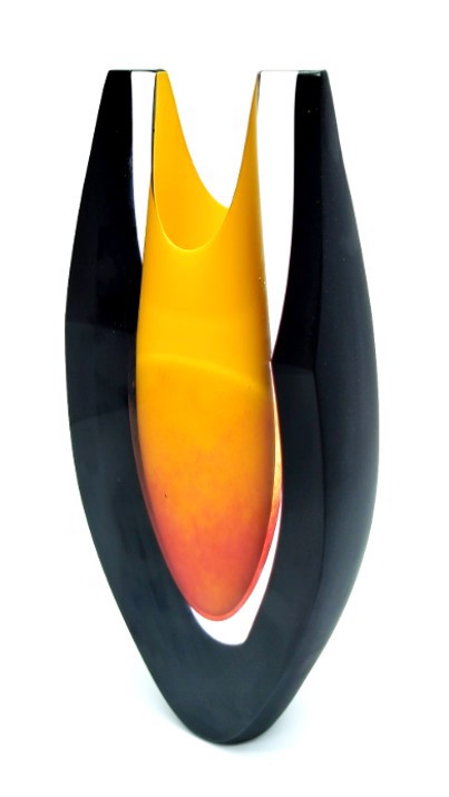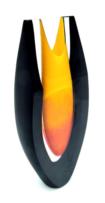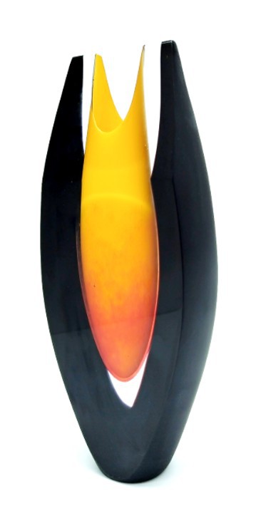A glowing mix of yellow & red form the centre of this shaped art glass vase, framed in dramatic black with satin finish.