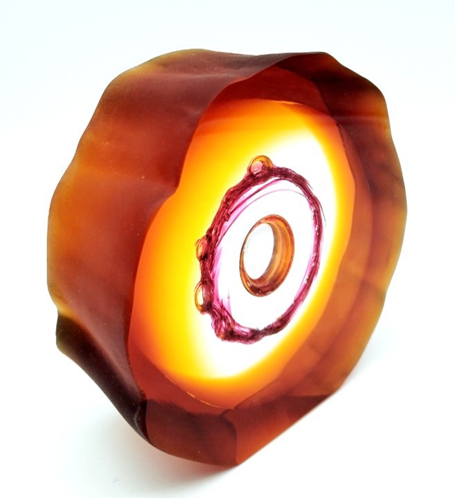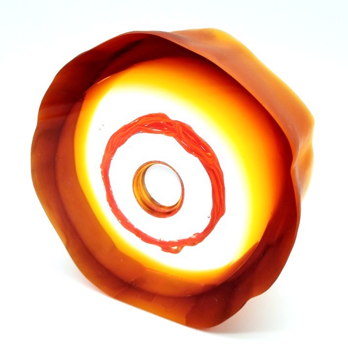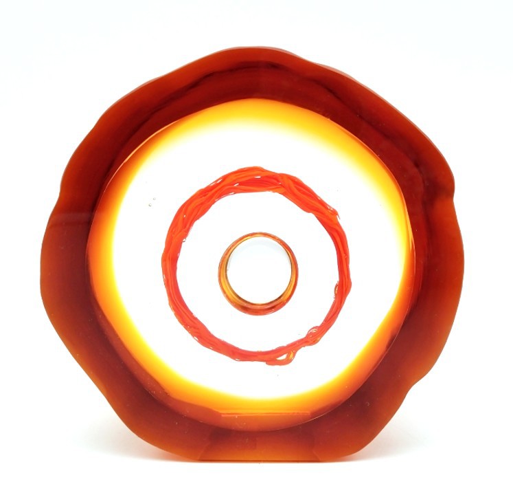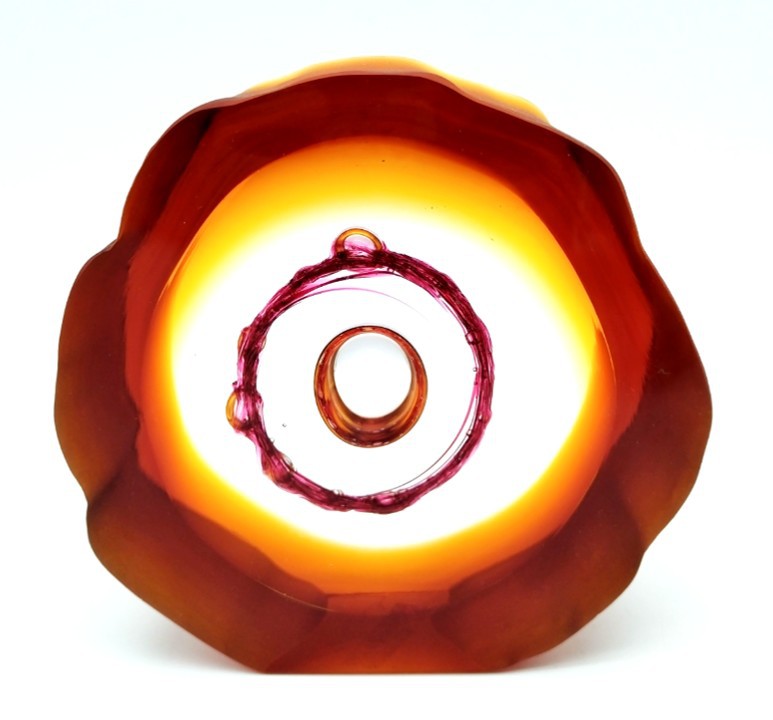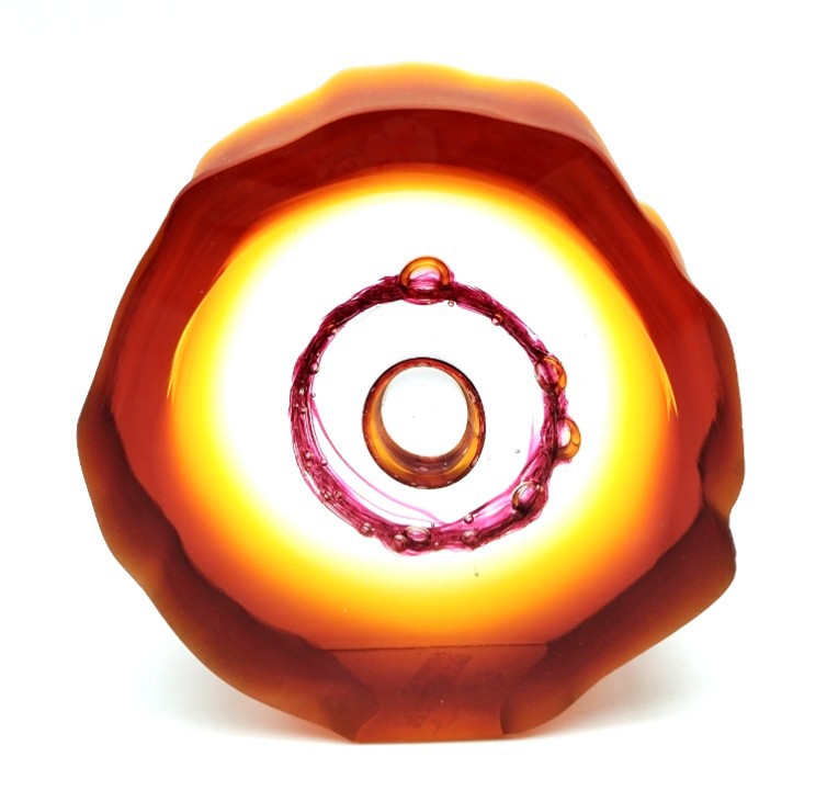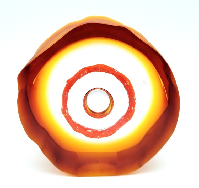 A central bubble is supended in space in this contemporary sculpture, framed in warm amber tones and complete with a texxtured finish.