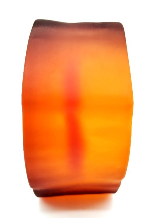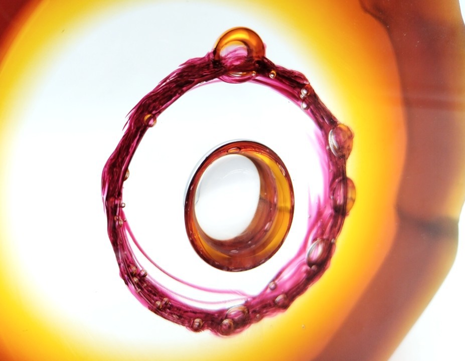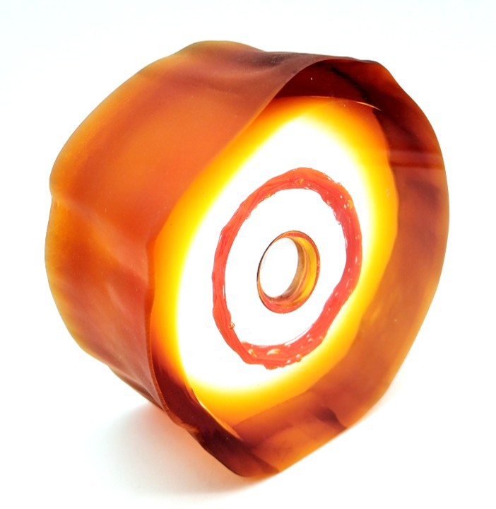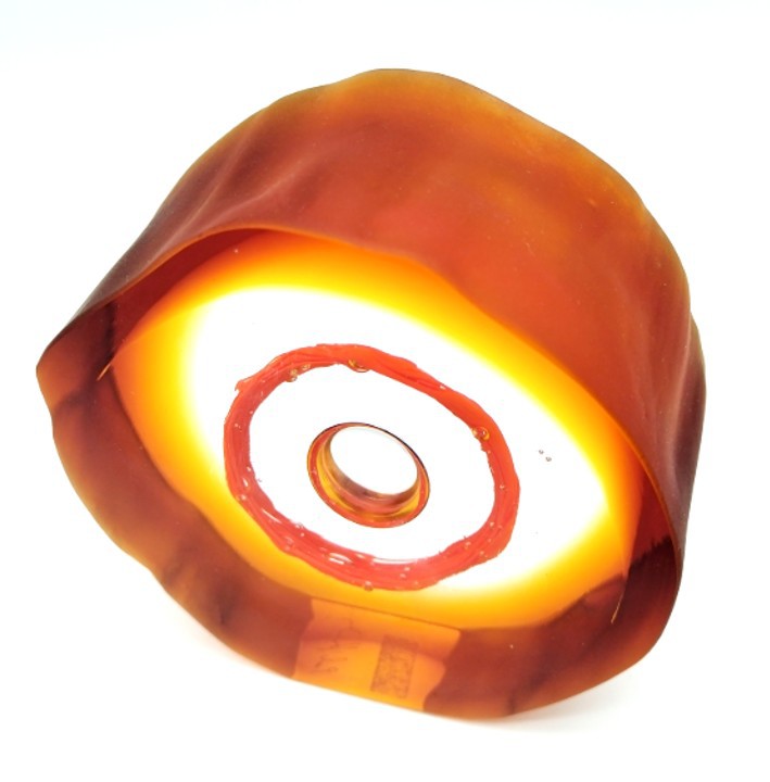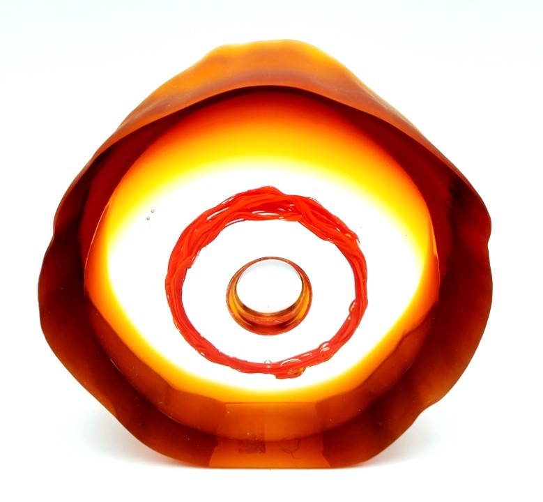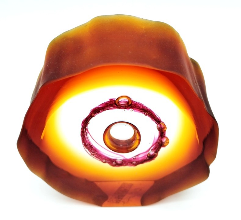 A central bubble is supended in space in this contemporary sculpture, framed in warm amber tones and complete with a texxtured finish.