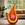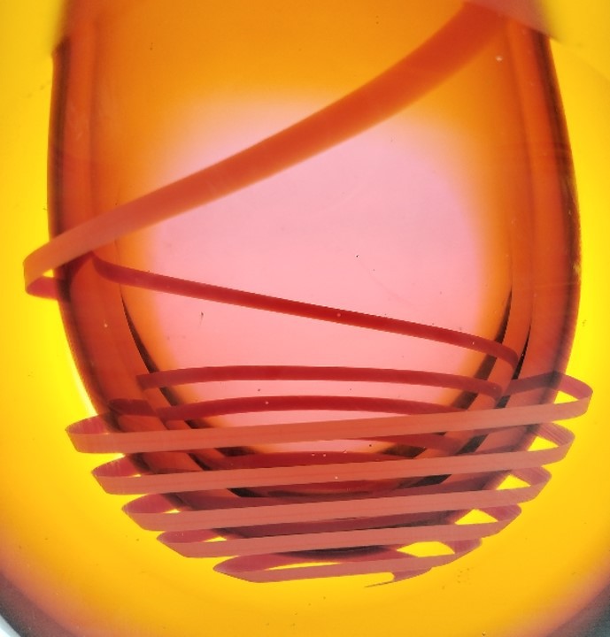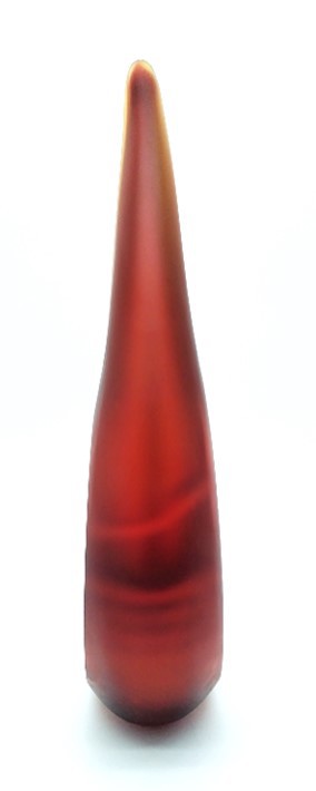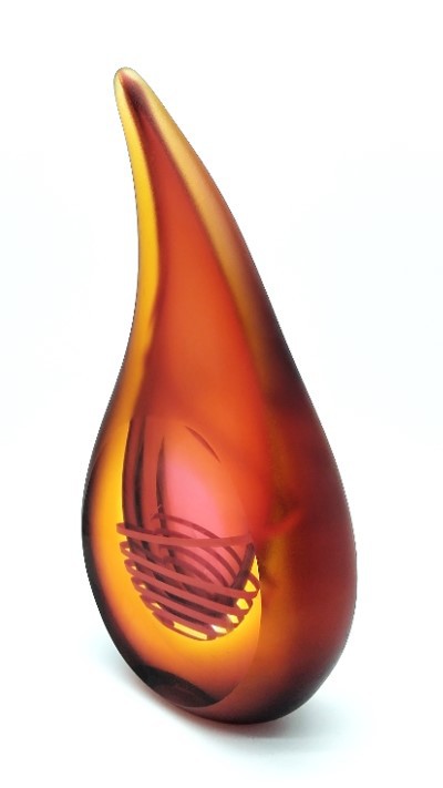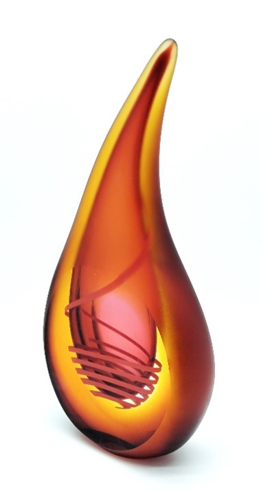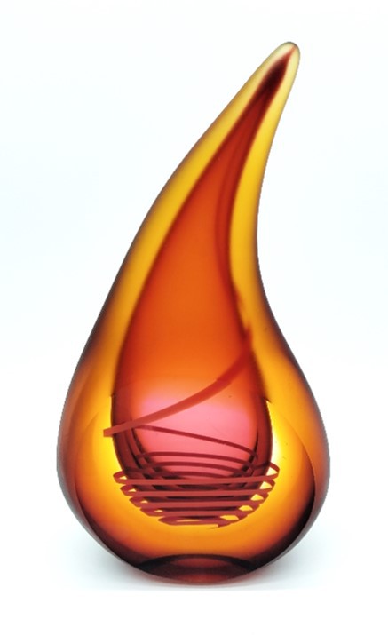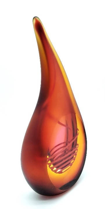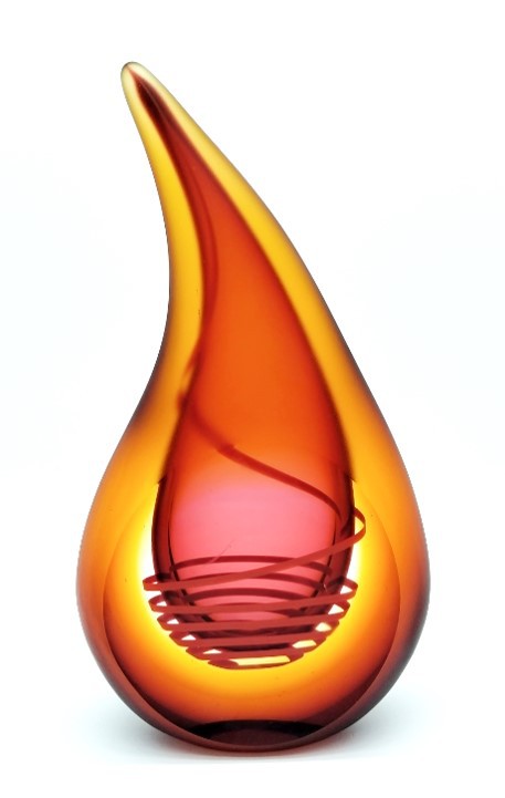 A vibrant teardrop shaped art glass sculpture with glowing central core and twirl of red.