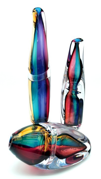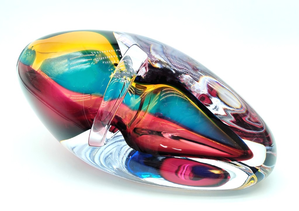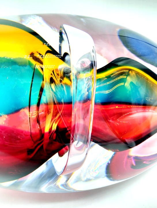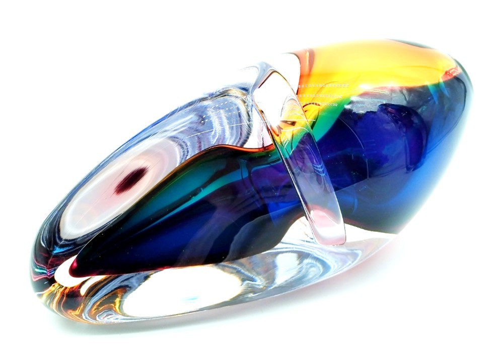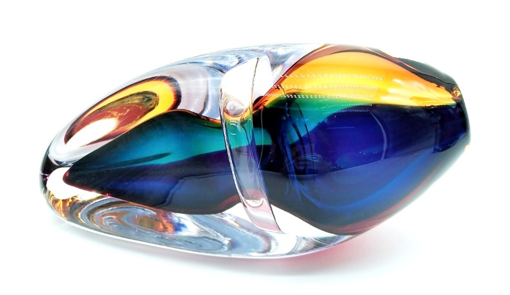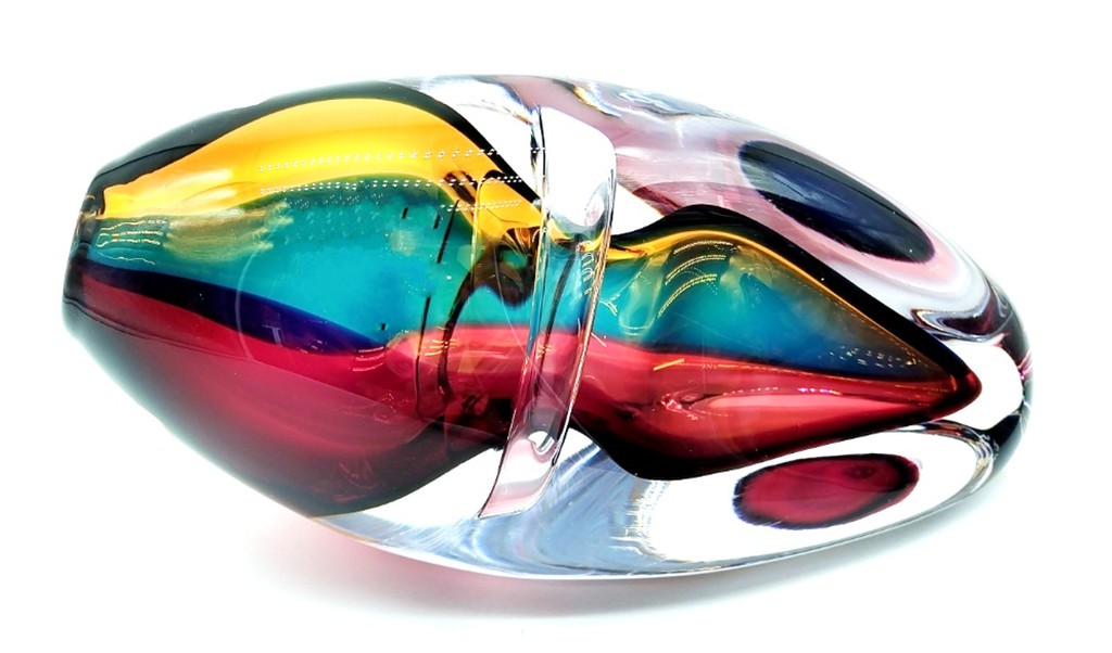 Combing the techniques of ‘sommerso’ and ‘incalmo’, this impressive and colourful art glass vessel will add year round colour to any decor. Why choose one colour when you can have them all!