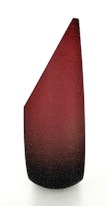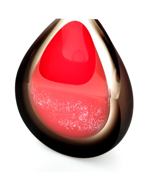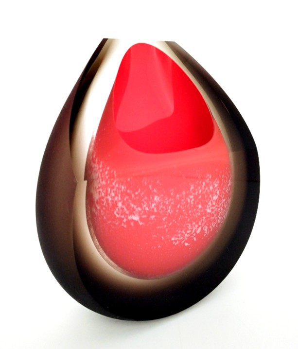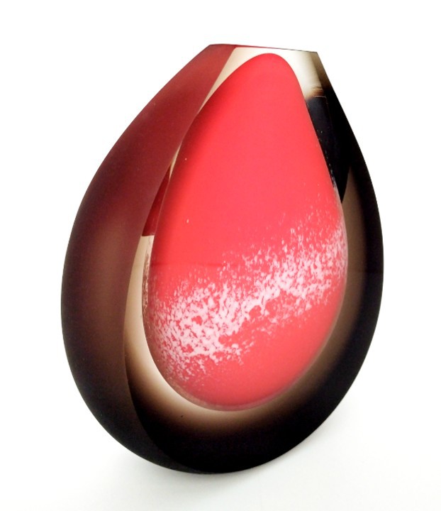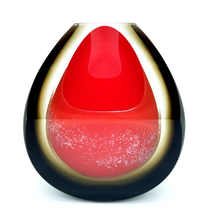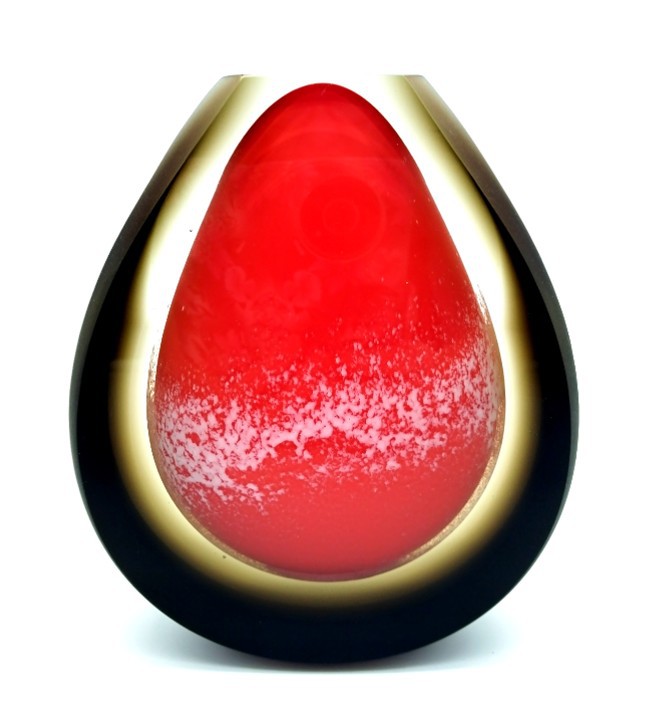 A dramatic mix of red and white form the centre of this shaped art glass vase. Framed with a black satin effect and slanted facet cut top.